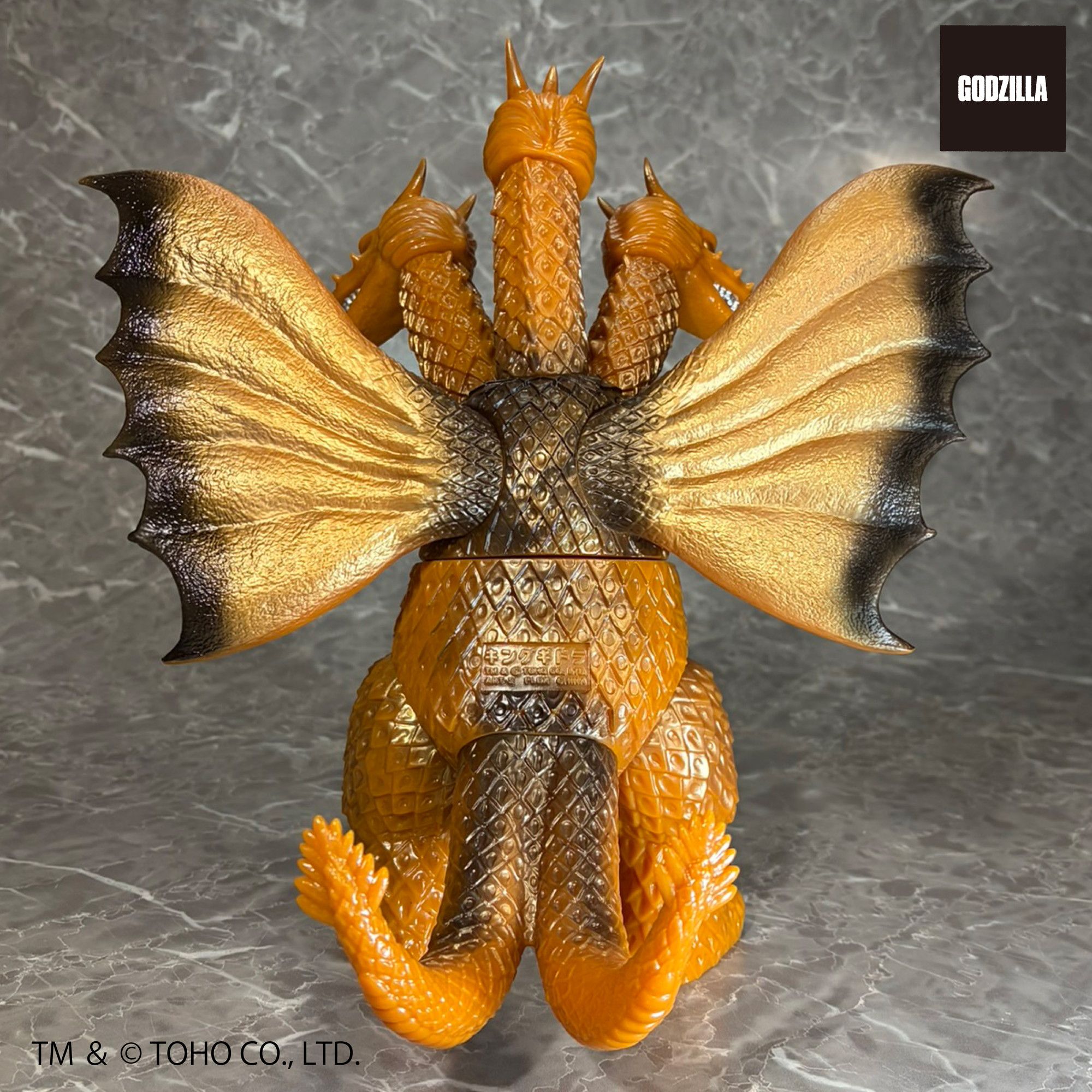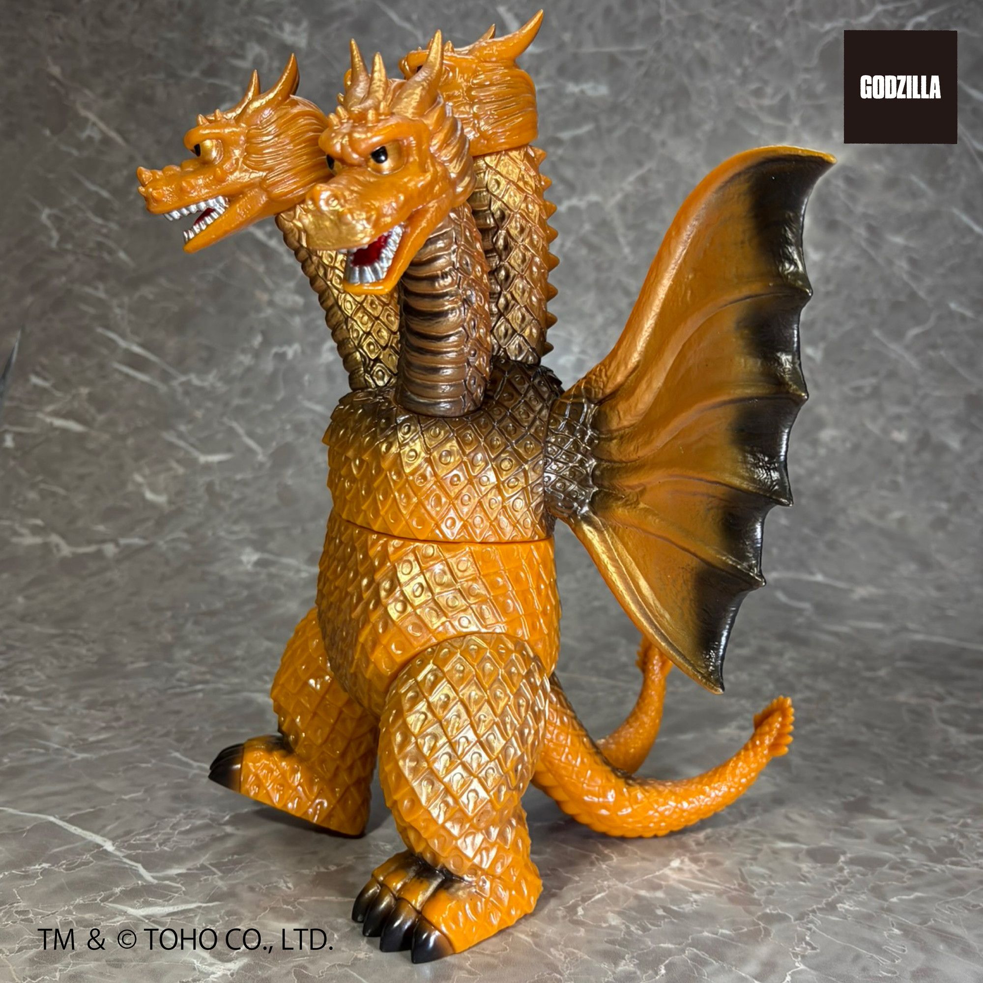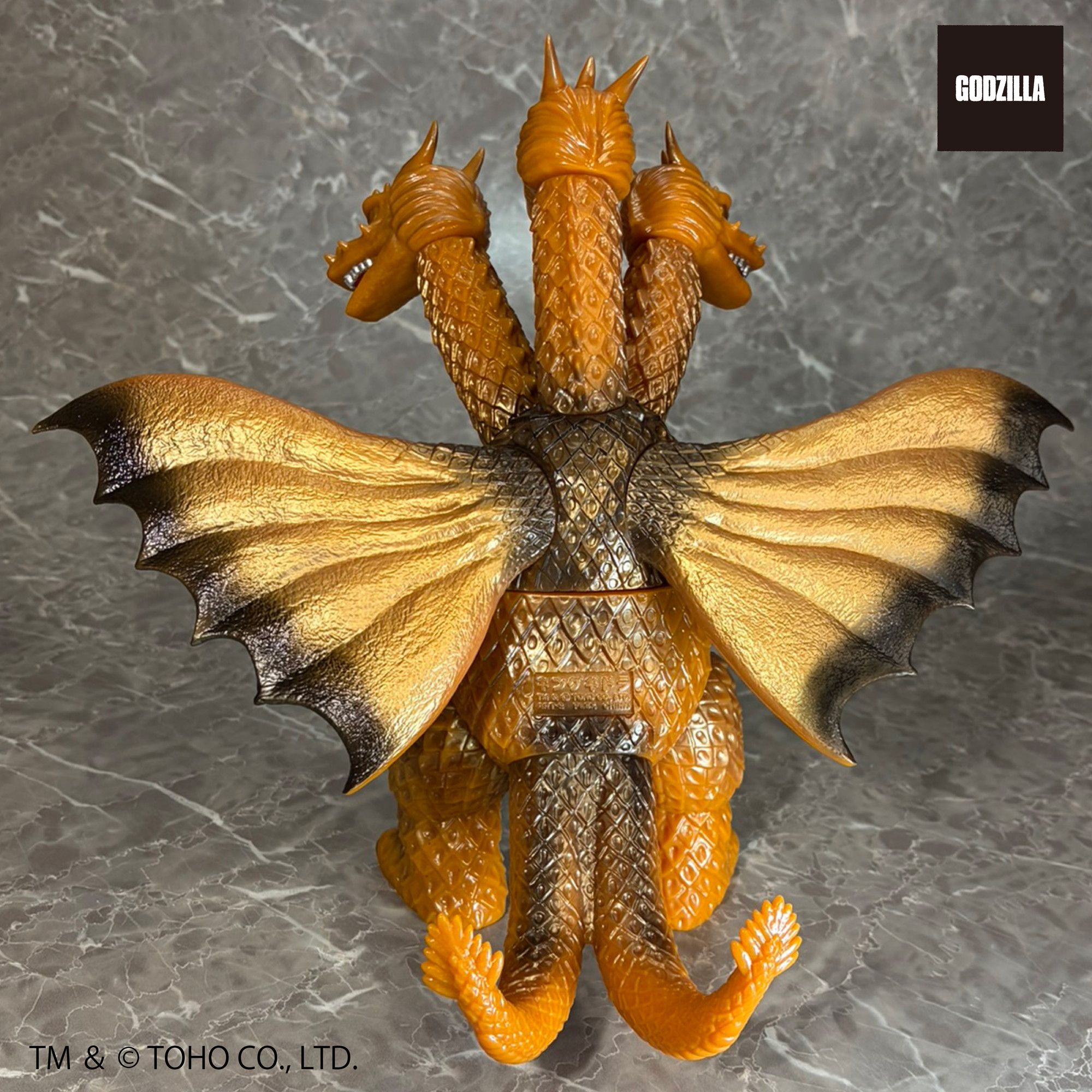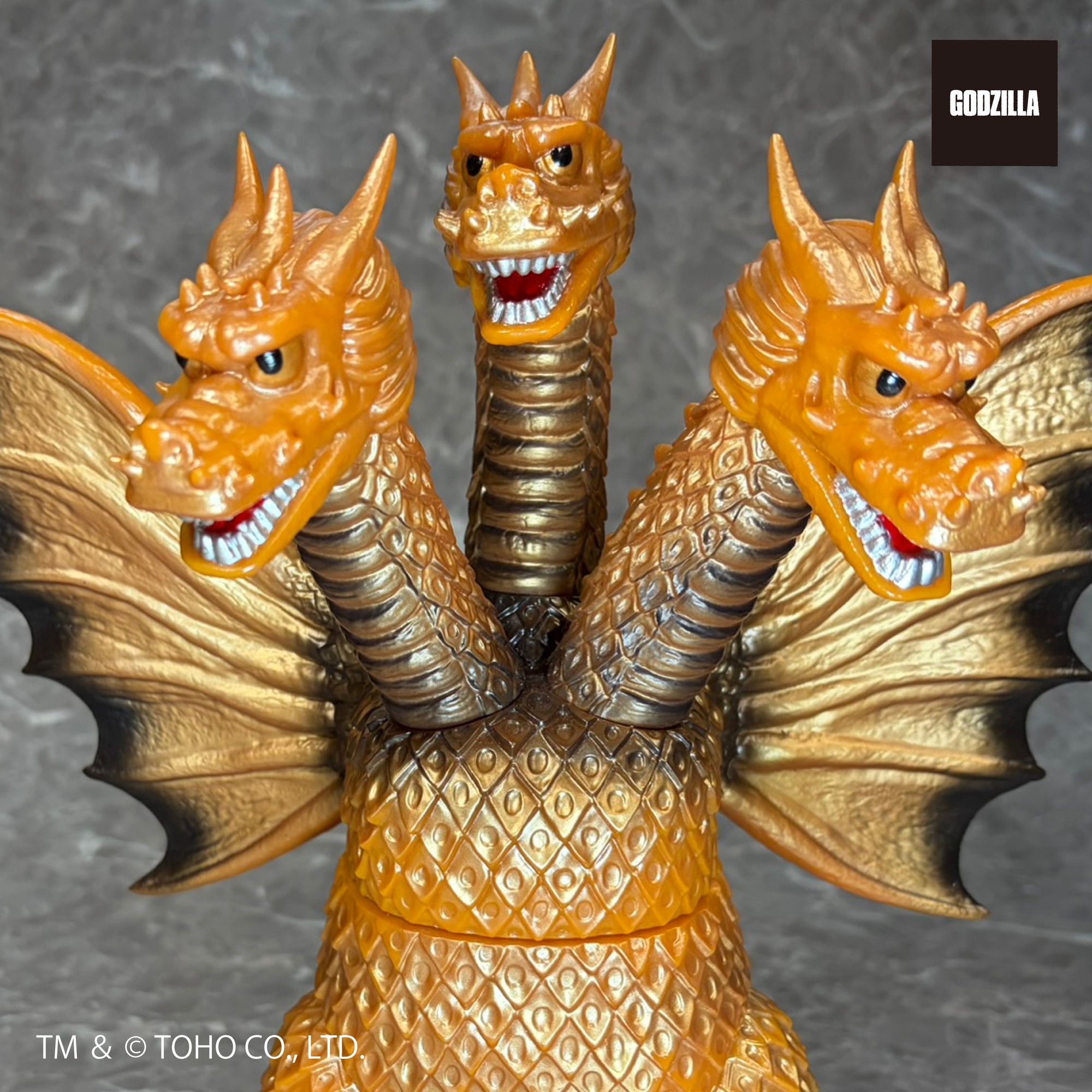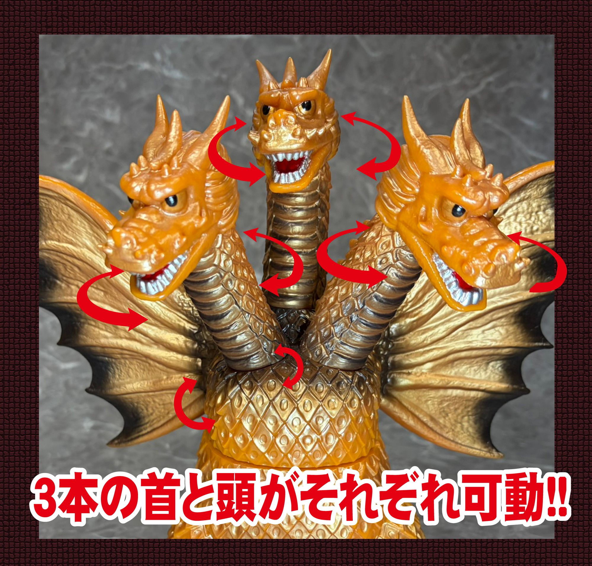 同シリーズとして、今回は3つの頭部と3本の首、2本の長い尾、全身を覆う黄金色の鱗、太い2本の足に加え、飛行に用いる巨大な1対の翼を持つキングギドラを、キングザウルスシリーズで発売されていたレトロな丸みのある造形フォルムにて新規造形。
