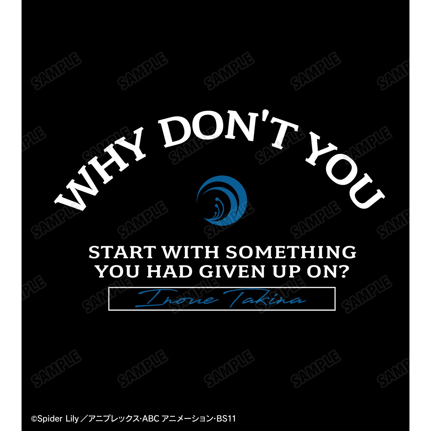 13話での千束への台詞「諦めてたことから始めたらどうですか」を英字でカレッジ風にデザインしています。