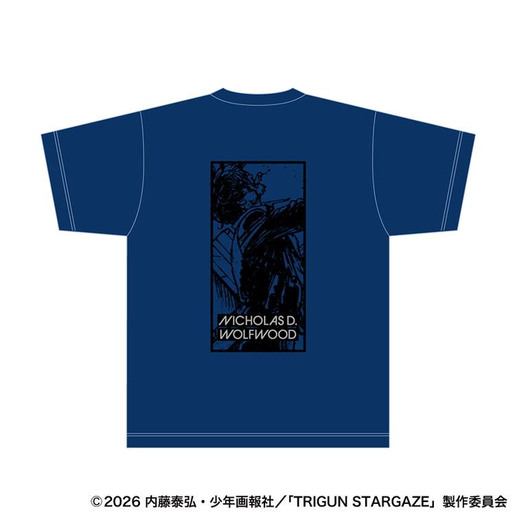 ニコラス・D・ウルフウッドの生き様を背中で魅せる、キャラクターデザイン・押山清高によるビジュアルをあしらったバックプリントTシャツです。