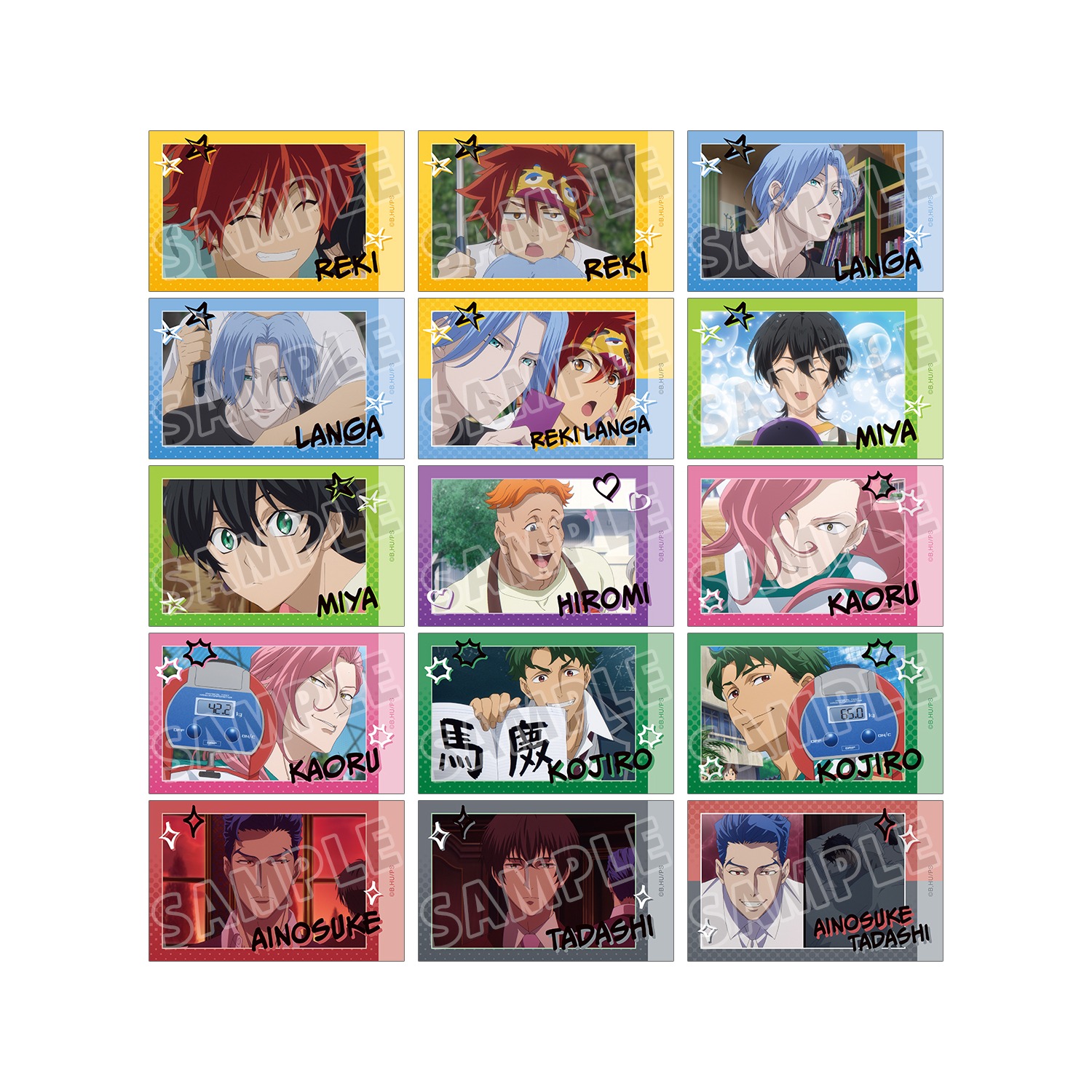 喜屋武 暦、馳河 ランガ、知念 実也、比嘉 広海、桜屋敷 薫、南城 虎次郎、神道 愛之介、菊池 忠の印象的なシーンをインスタントカメラ風のイラストカードに仕上げました。