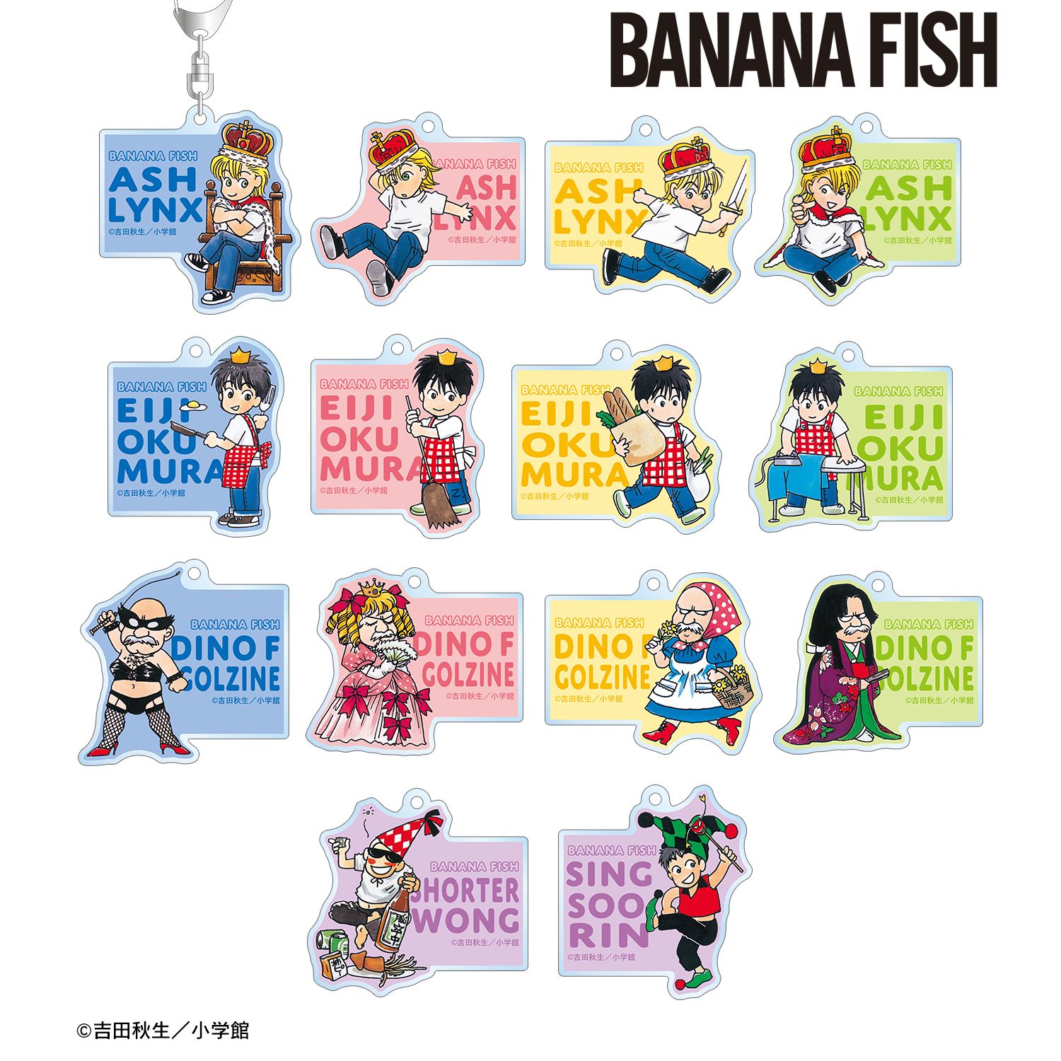 アッシュ・リンクス、奥村英二、ディノ・F・ゴルツィネ、ショーター・ウォン、シン・スウ・リンの原作ちびキャライラストをアクリルキーホルダーに仕上げました。