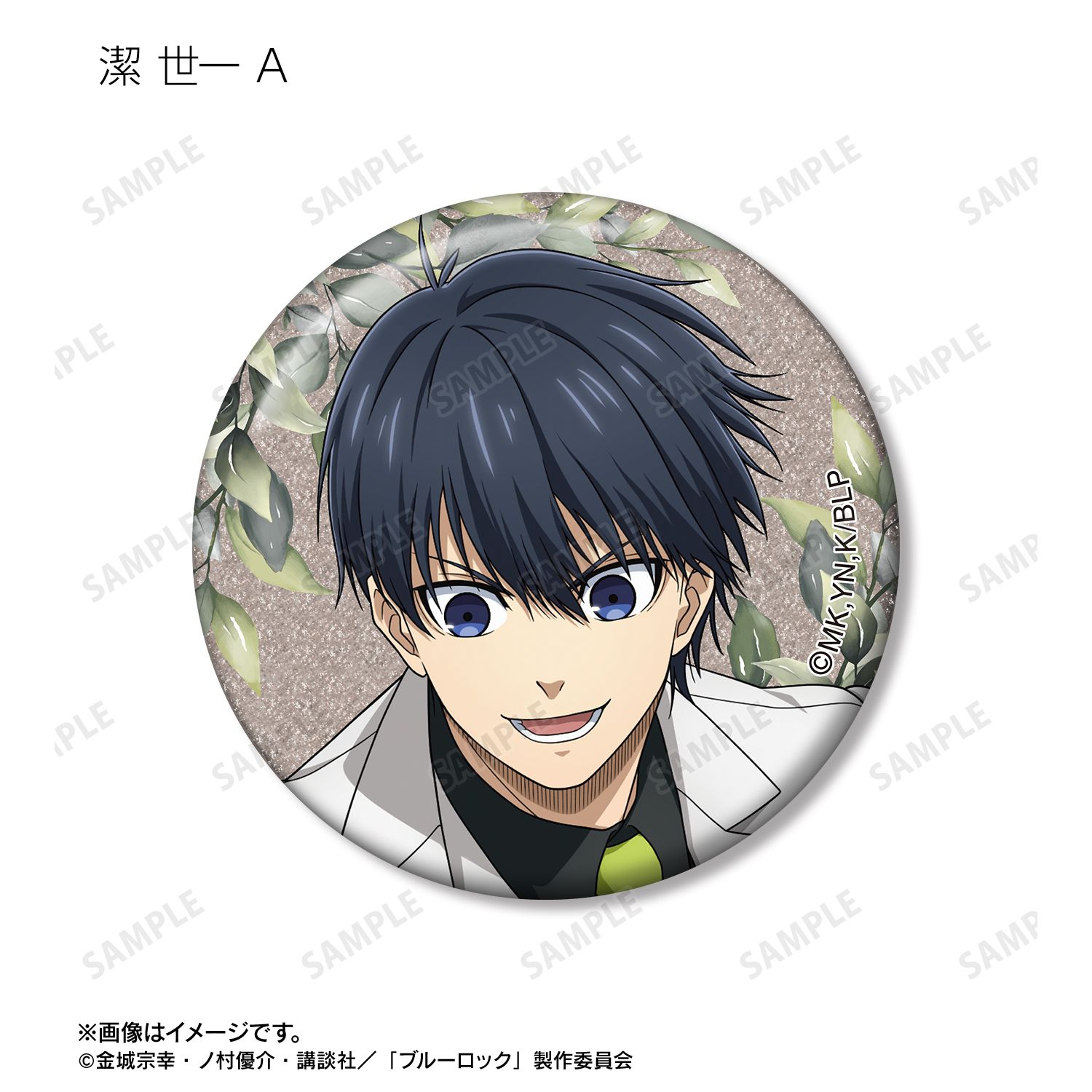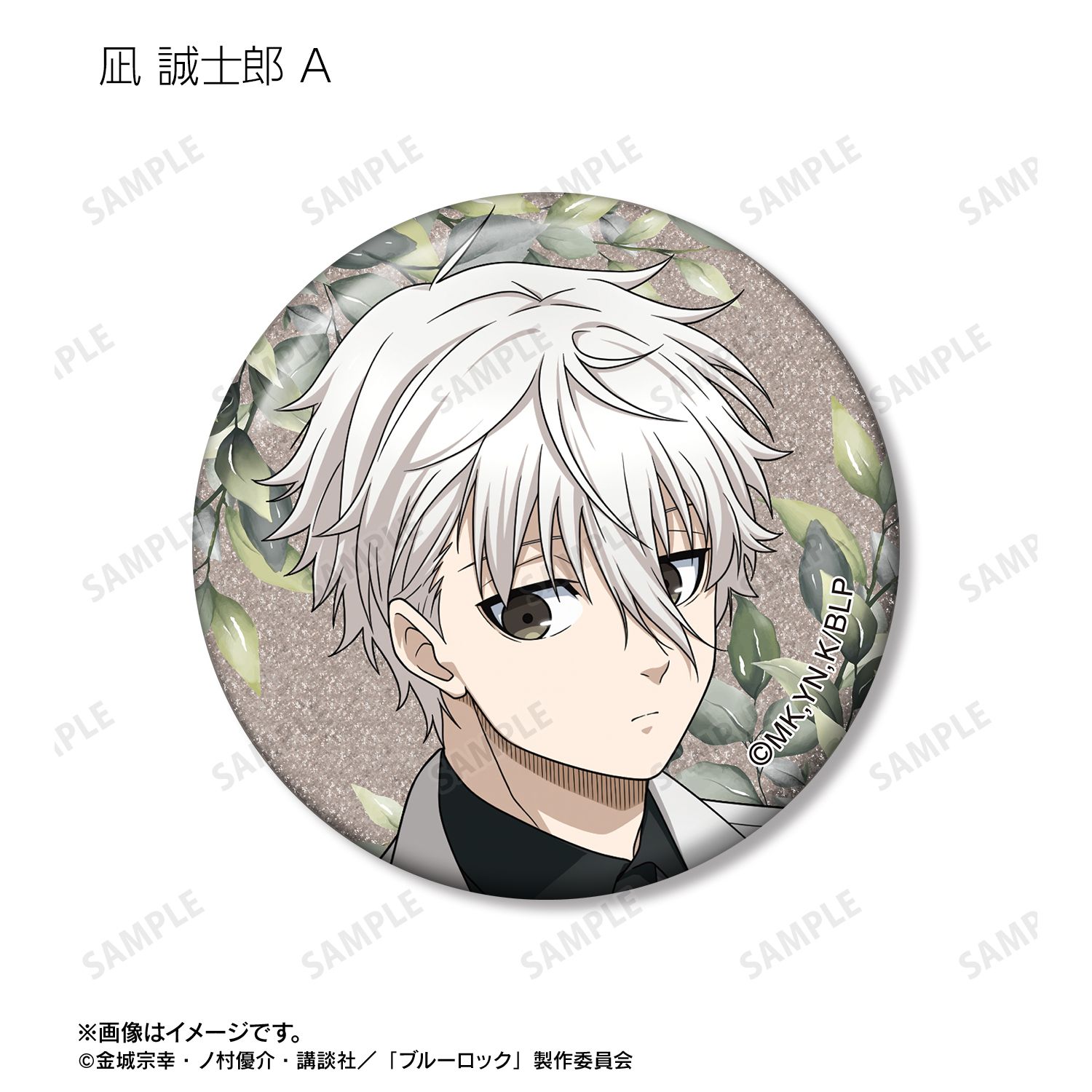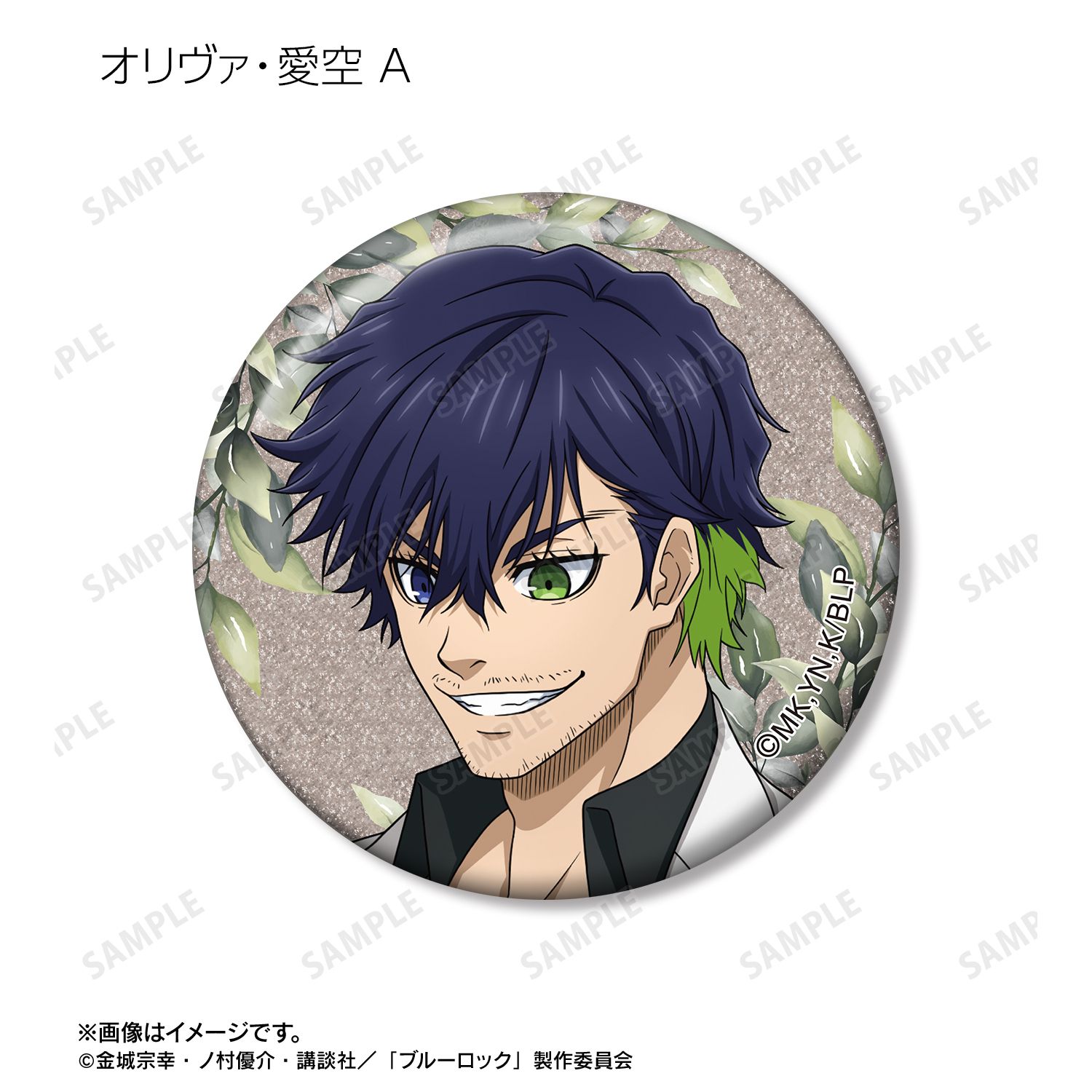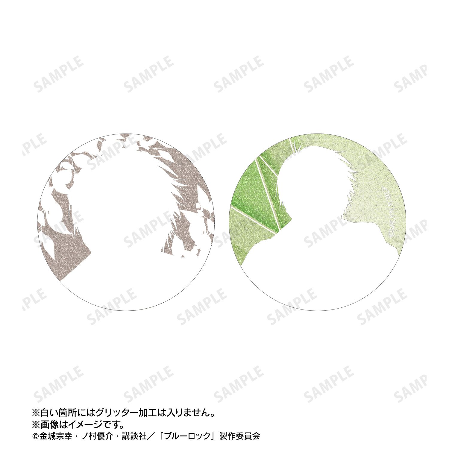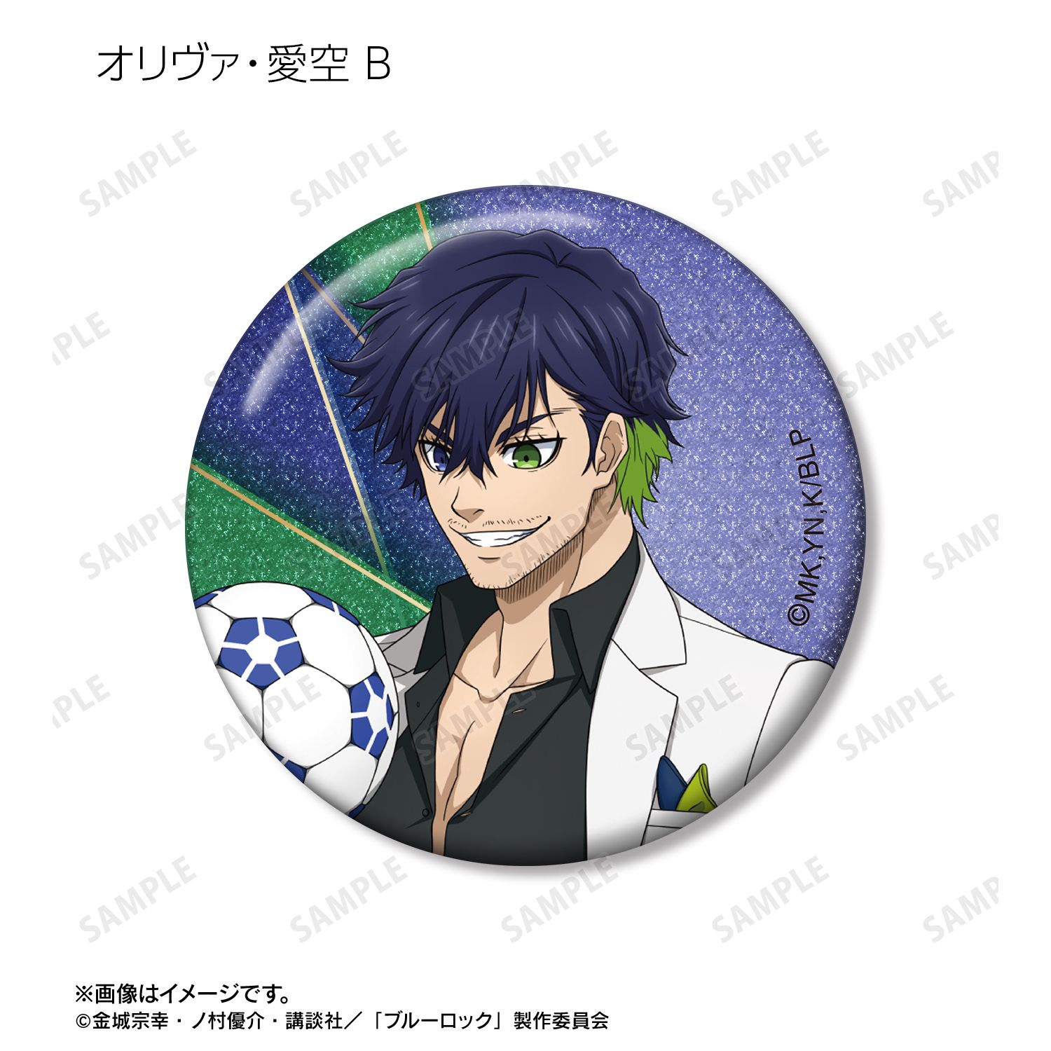 潔 世一、糸師 凛、凪 誠士郎、烏 旅人、蜂楽 廻、千切 豹馬、御影 玲王、糸師 冴、オリヴァ・愛空の描き下ろしイラストをグリッター加工を施した缶バッジに仕上げました。