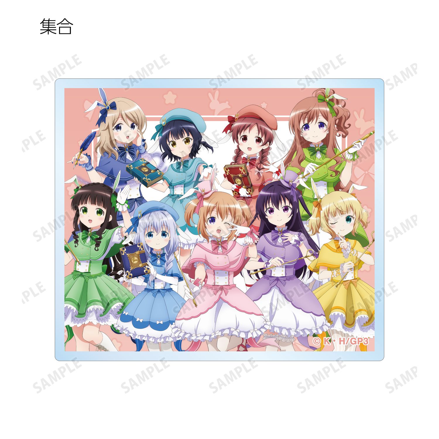 ココア、チノ、リゼ、千夜、シャロ、マヤ、メグ、青山ブルーマウンテン、モカの描き下ろしイラストをアクリルカードに仕上げました。