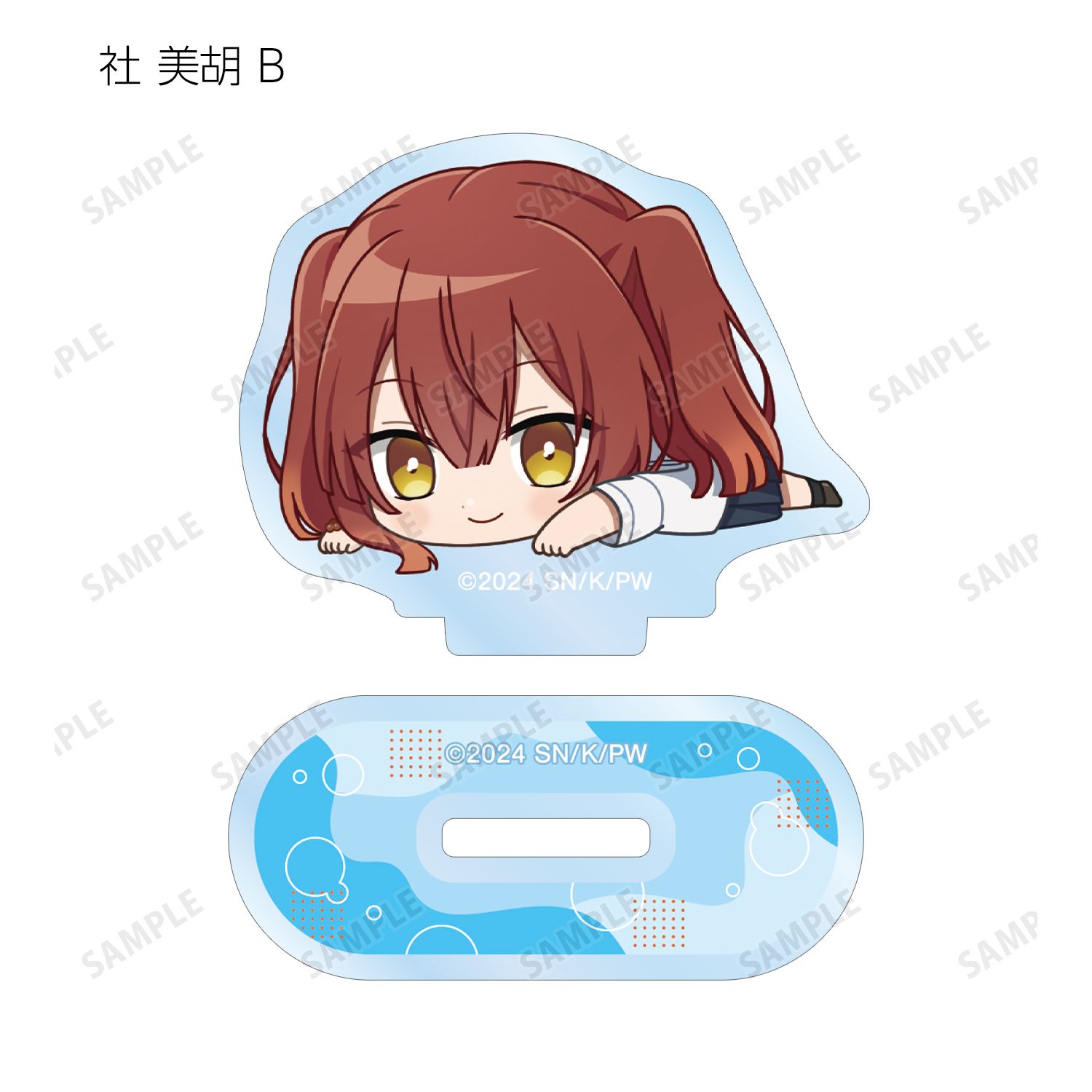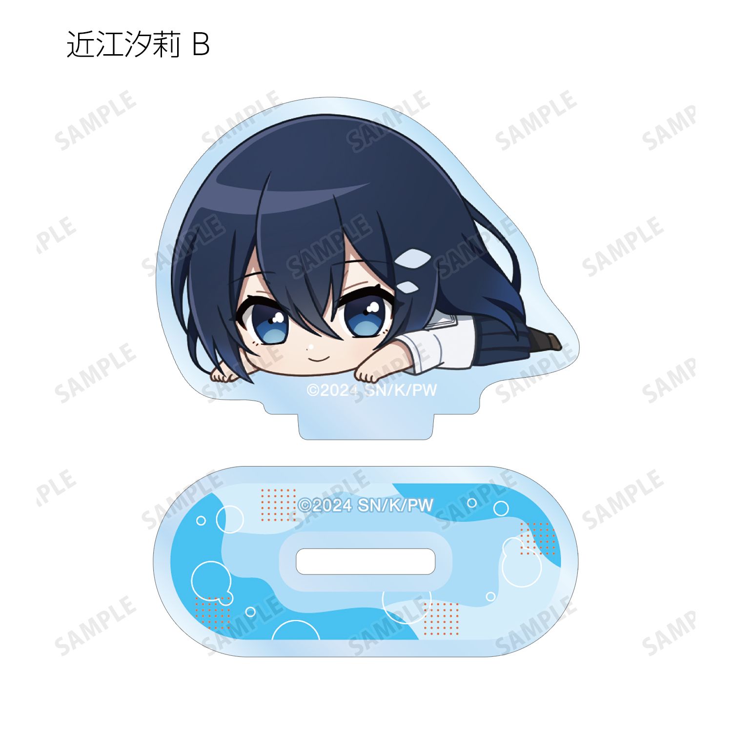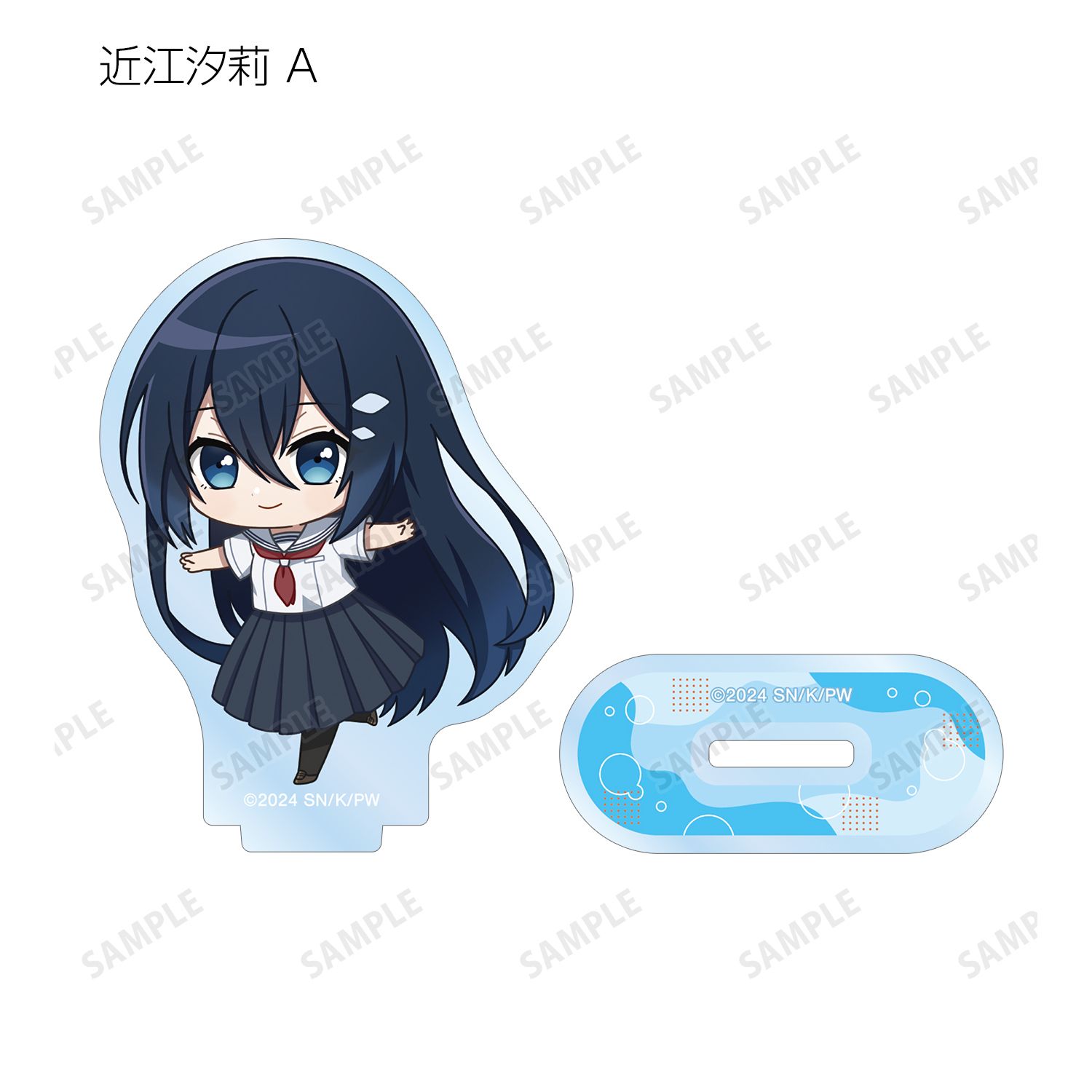 八百歳比名子、近江汐莉、社 美胡のちびキャライラストをメインにデザインし、アクリルスタンドに仕上げました。