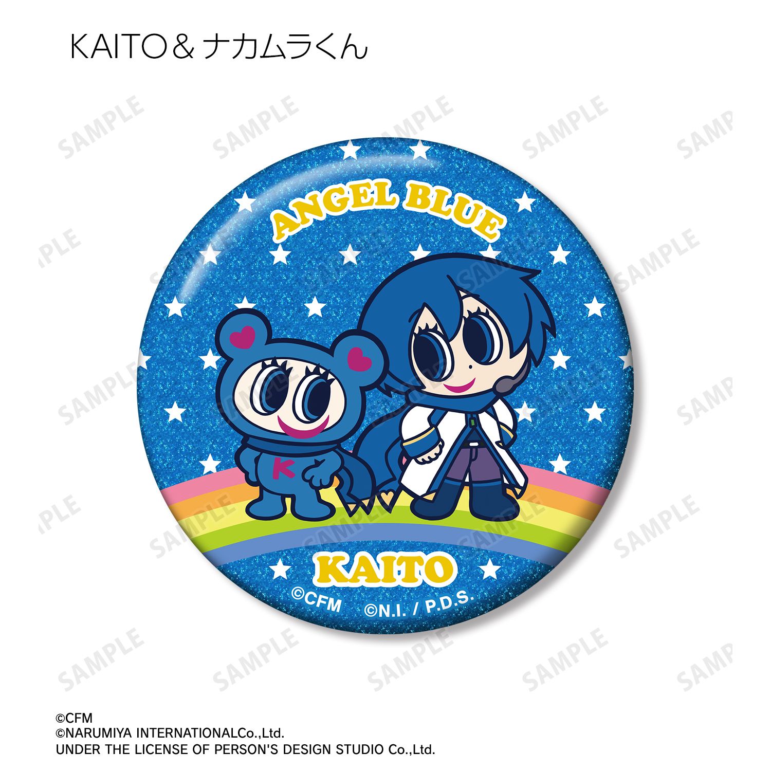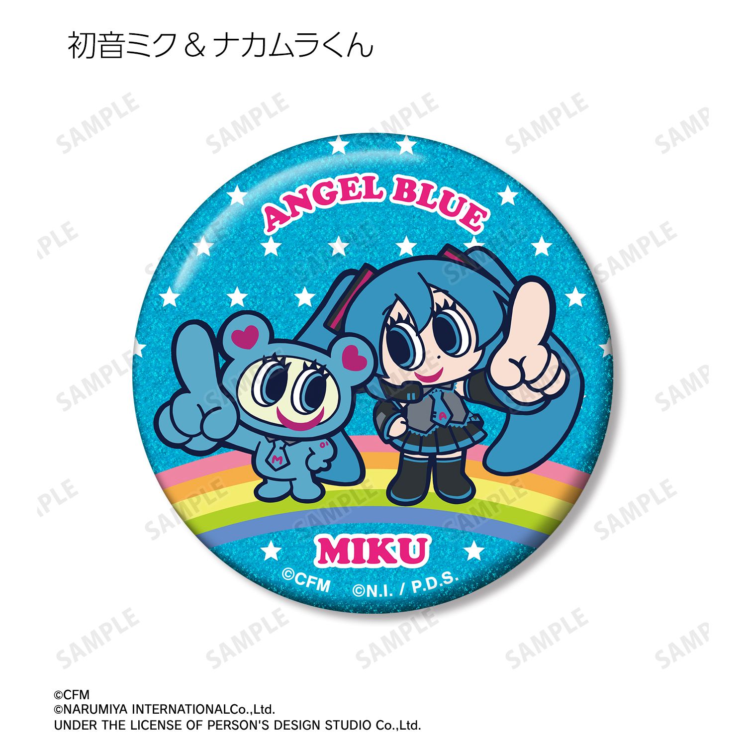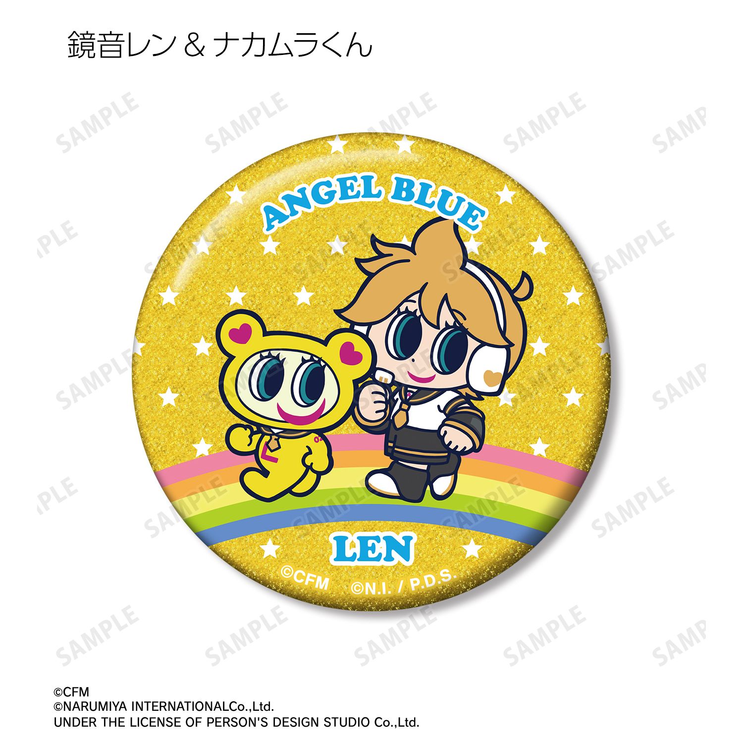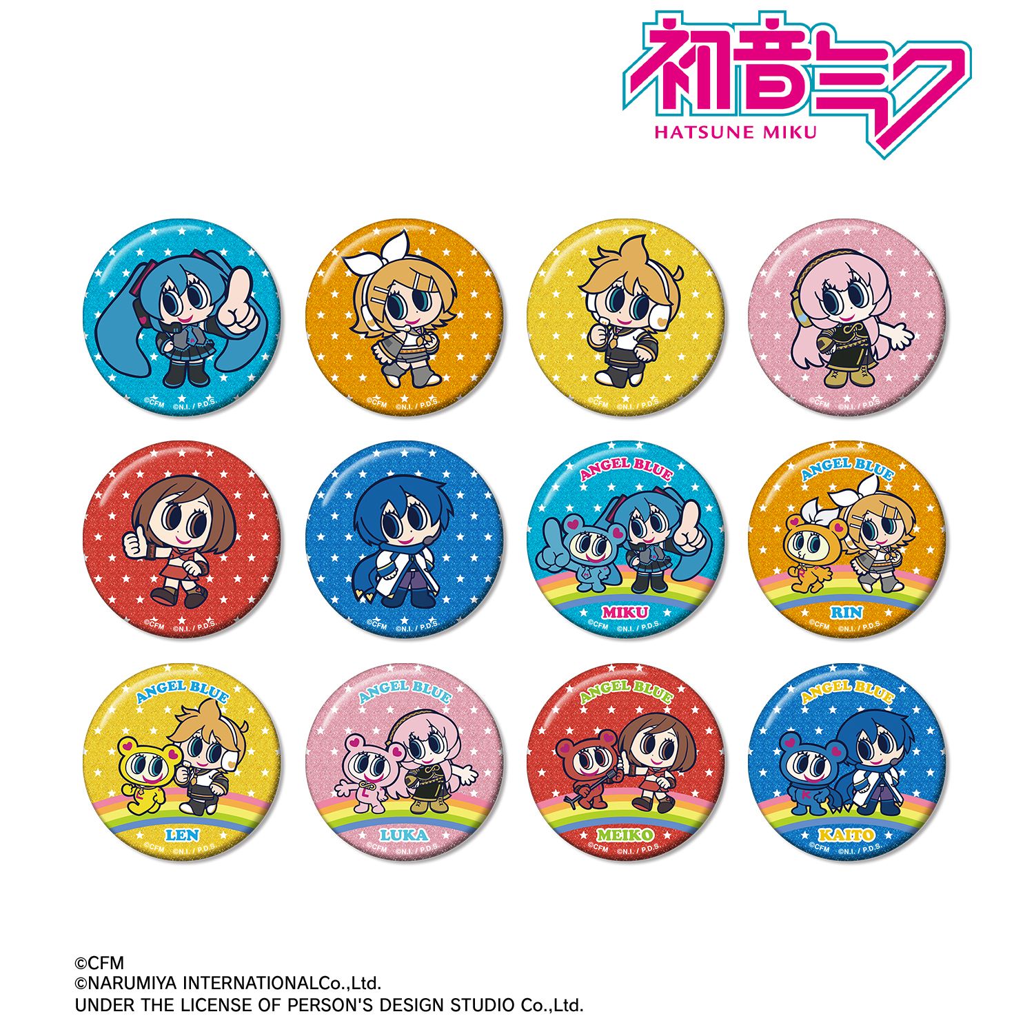 初音ミク、鏡音リン、鏡音レン、巡音ルカ、MEIKO、KAITO、ナカムラくんを描き起こしたANGEL BLUEのコラボイラストを、グリッター加工を施した缶バッジに仕上げました。