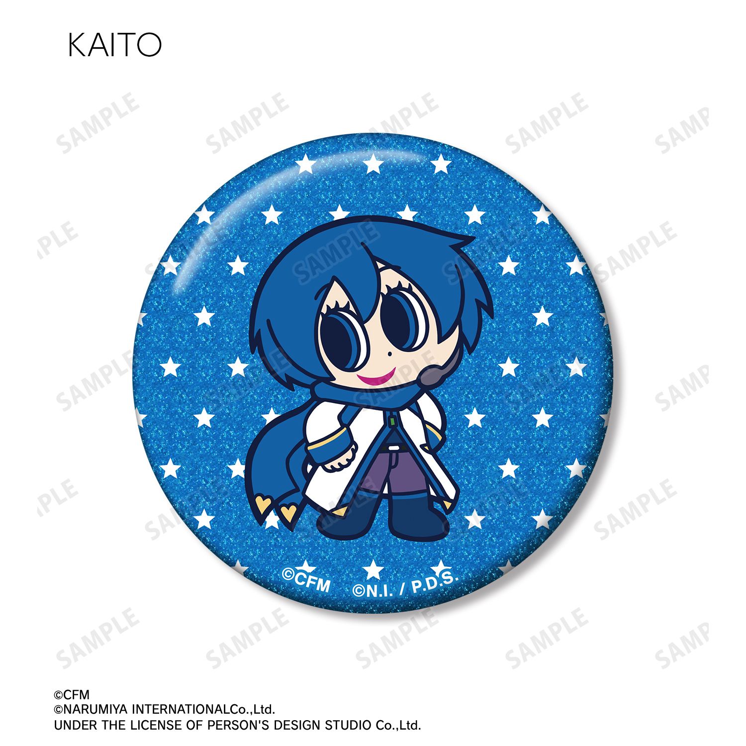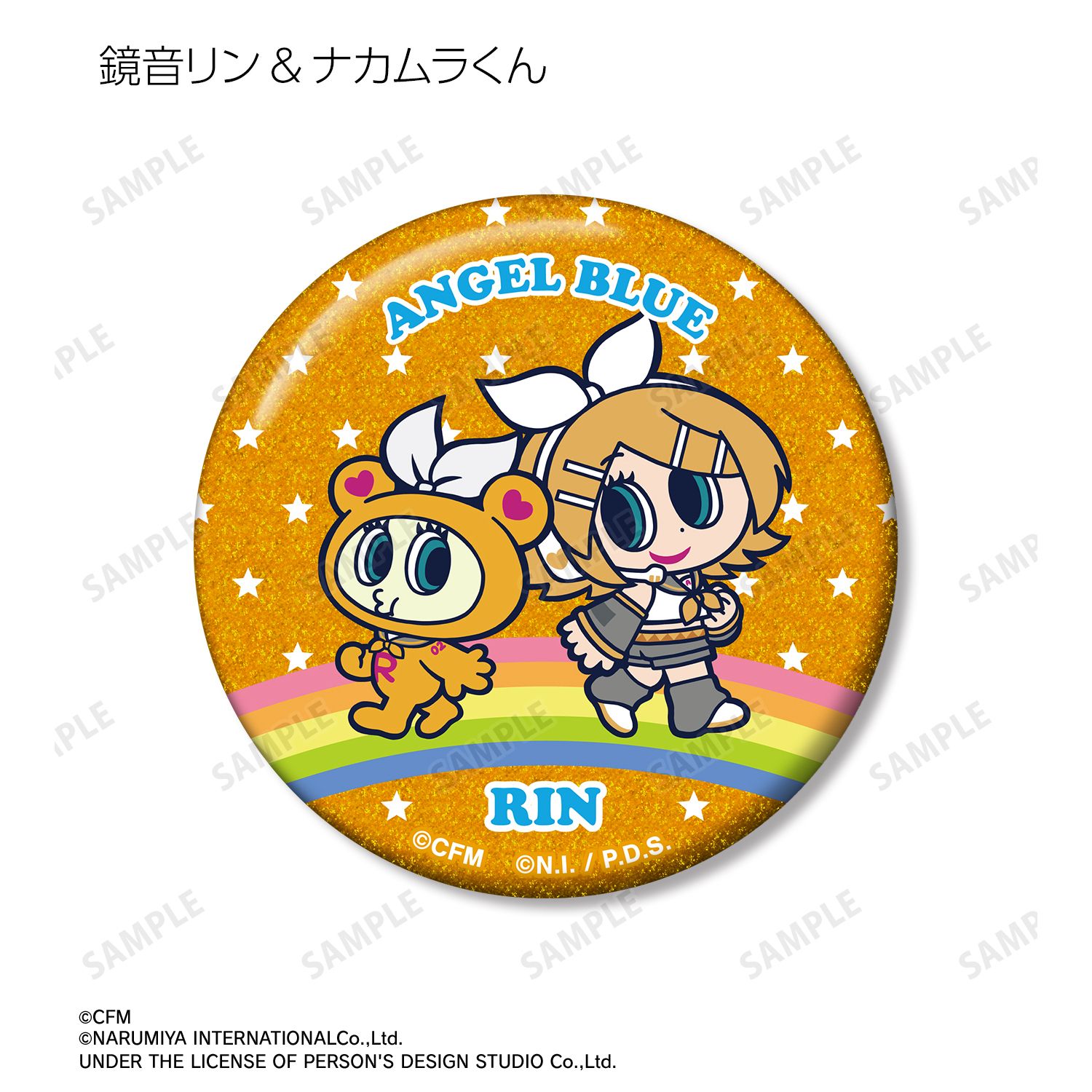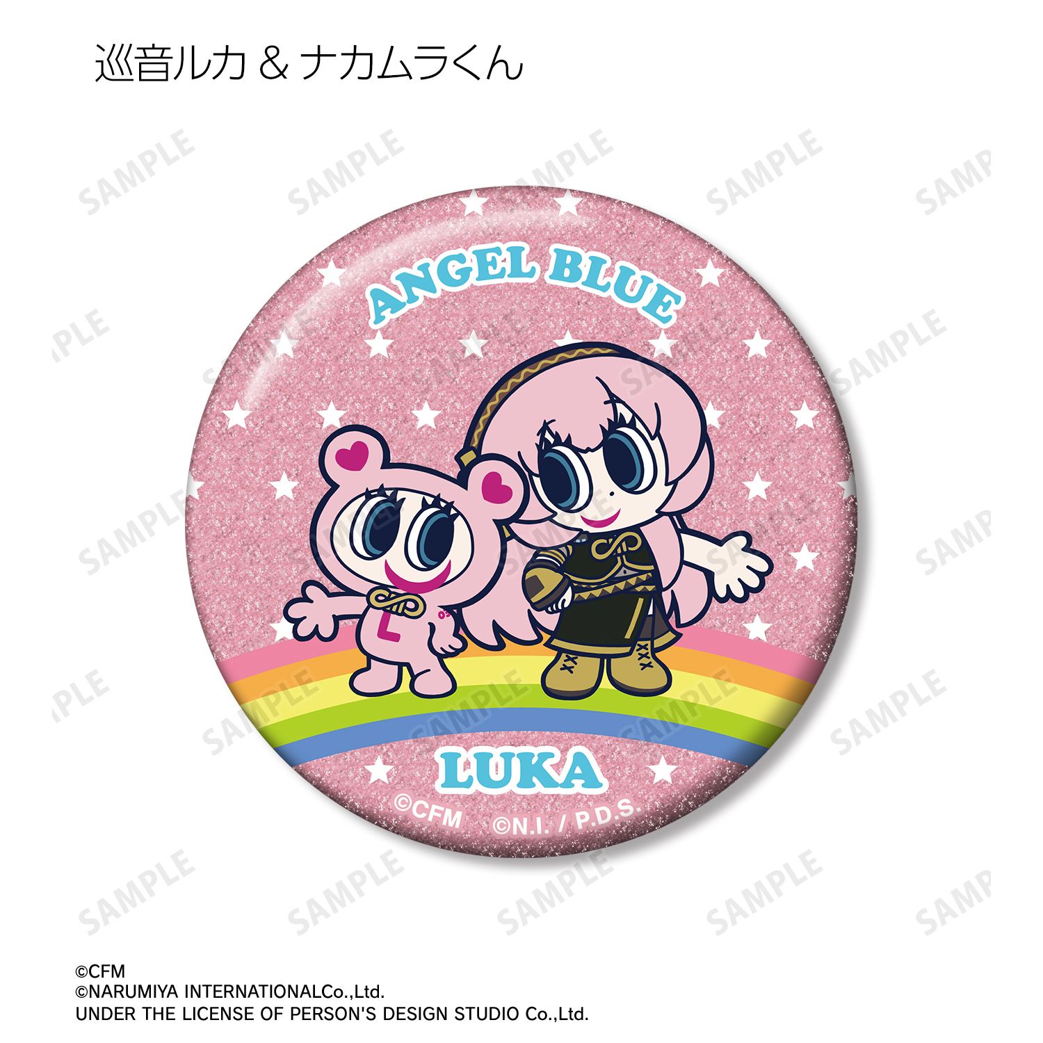 初音ミク、鏡音リン、鏡音レン、巡音ルカ、MEIKO、KAITO、ナカムラくんを描き起こしたANGEL BLUEのコラボイラストを、グリッター加工を施した缶バッジに仕上げました。