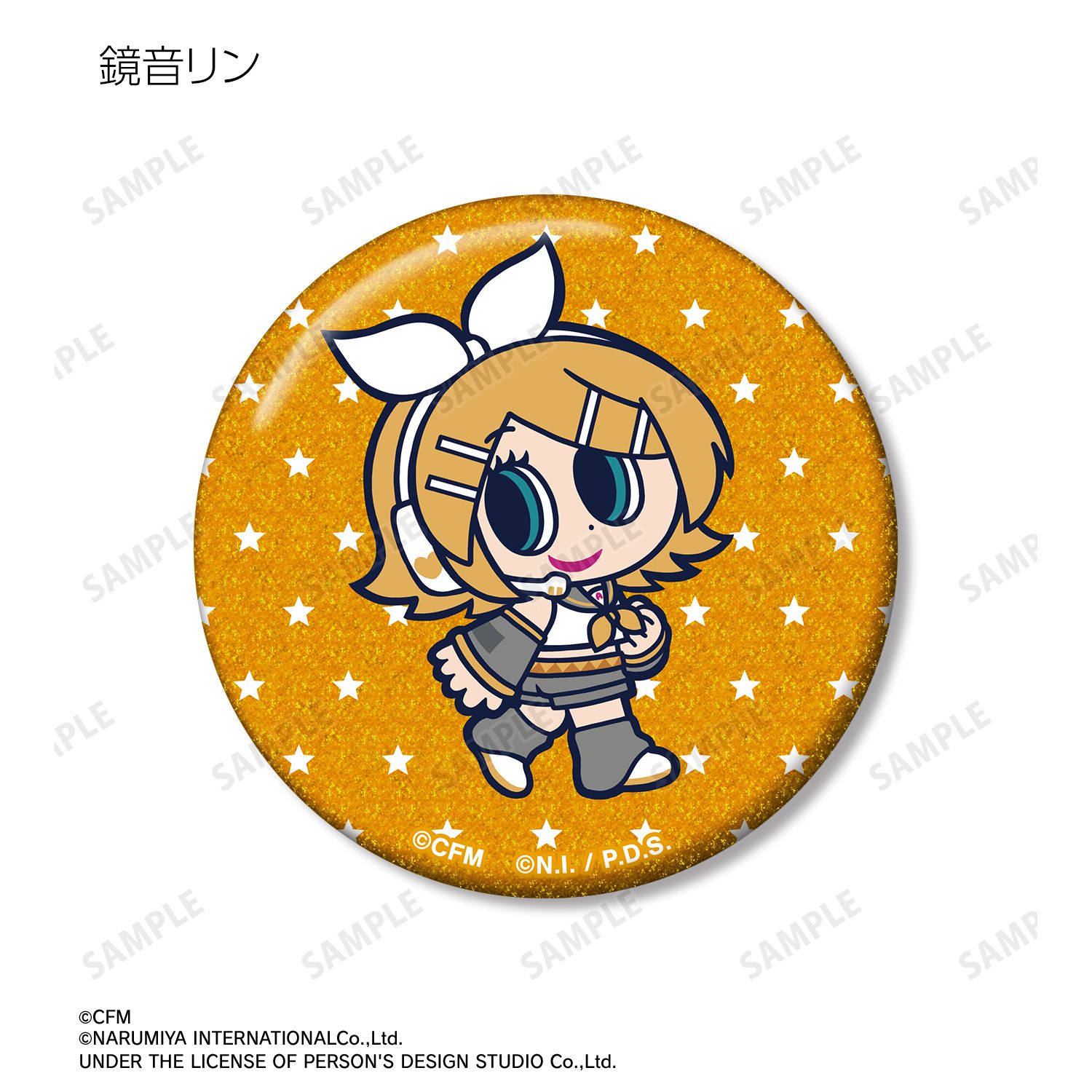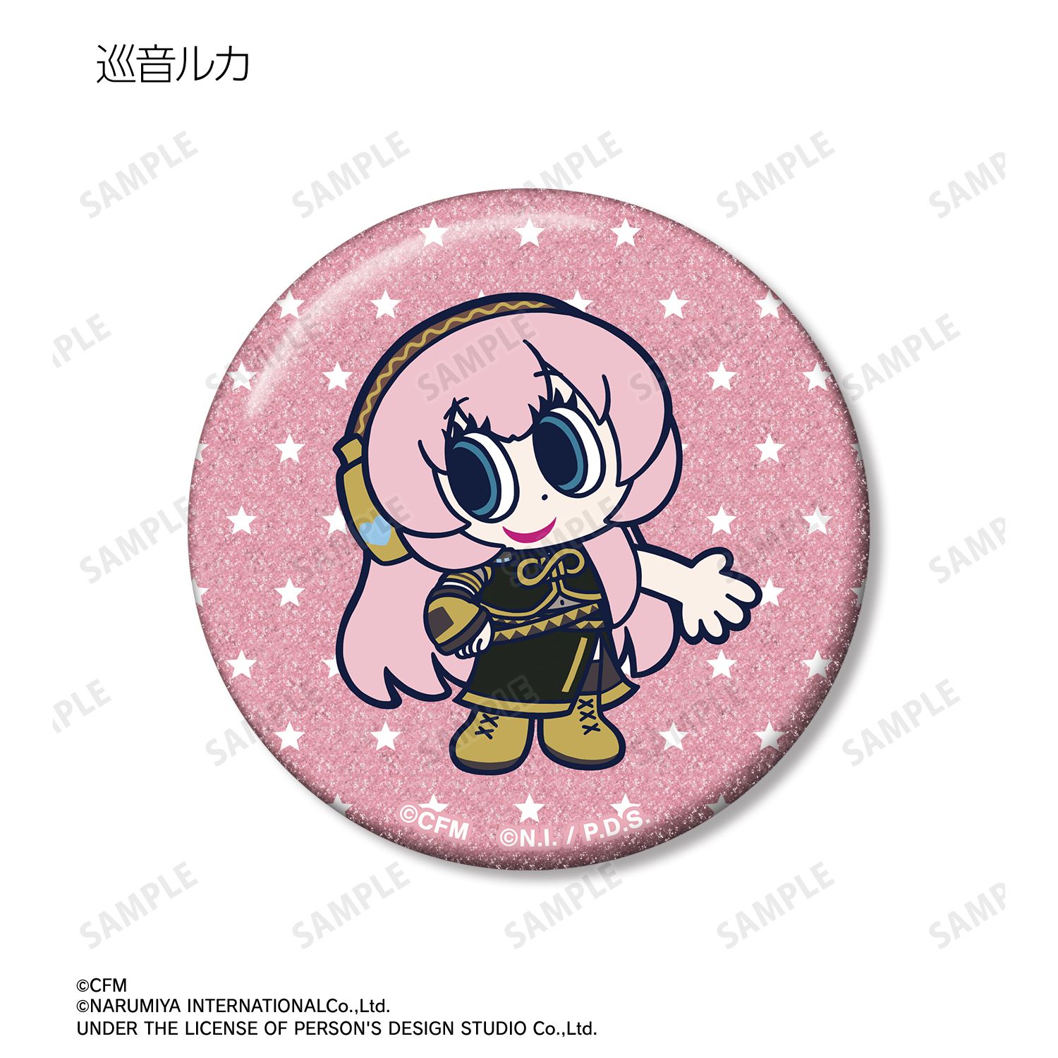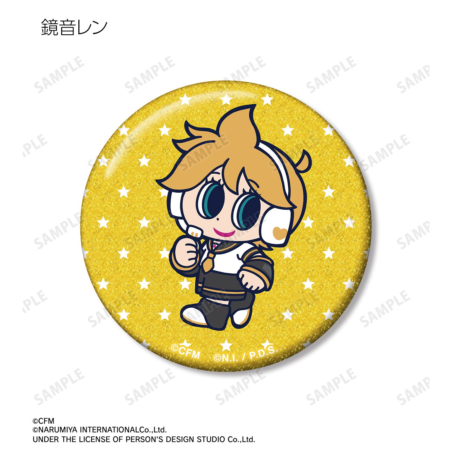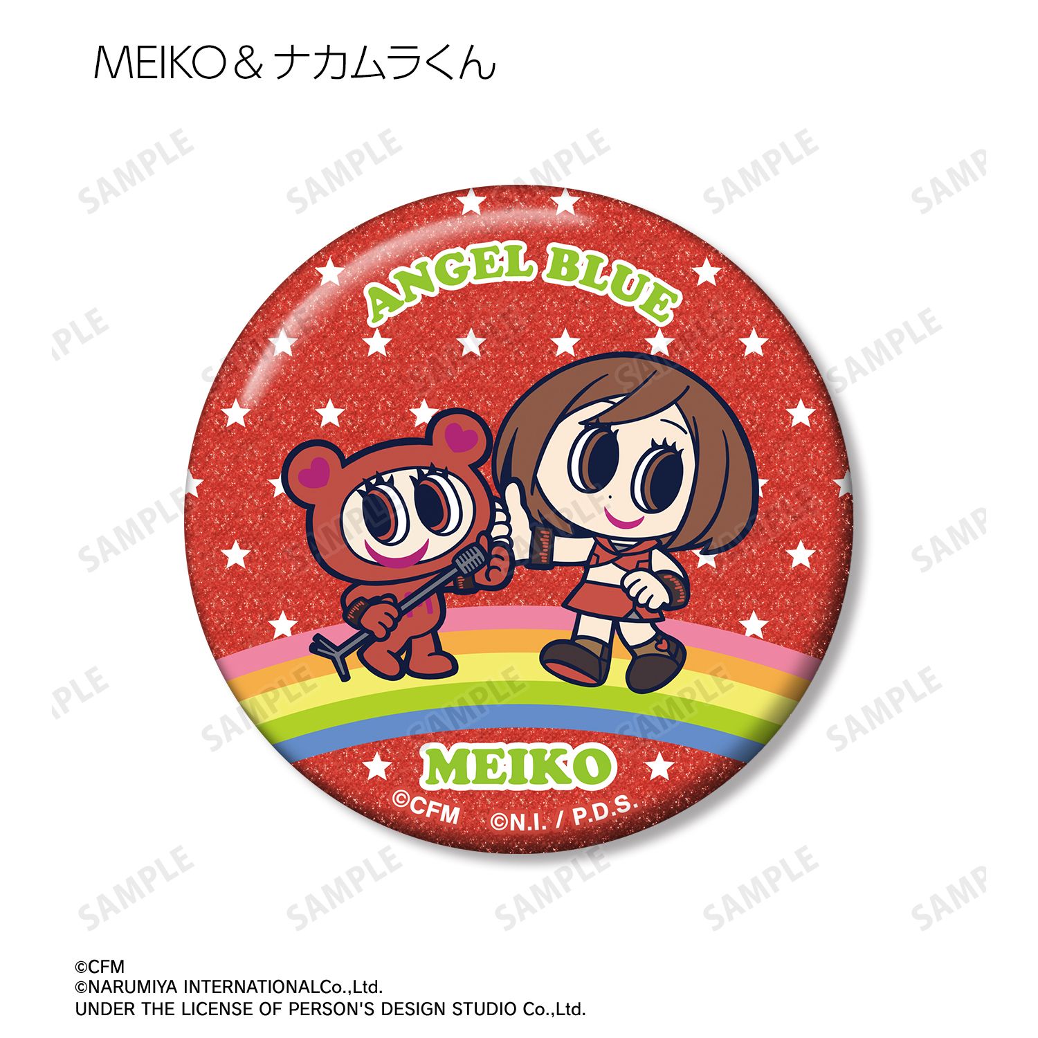 初音ミク、鏡音リン、鏡音レン、巡音ルカ、MEIKO、KAITO、ナカムラくんを描き起こしたANGEL BLUEのコラボイラストを、グリッター加工を施した缶バッジに仕上げました。