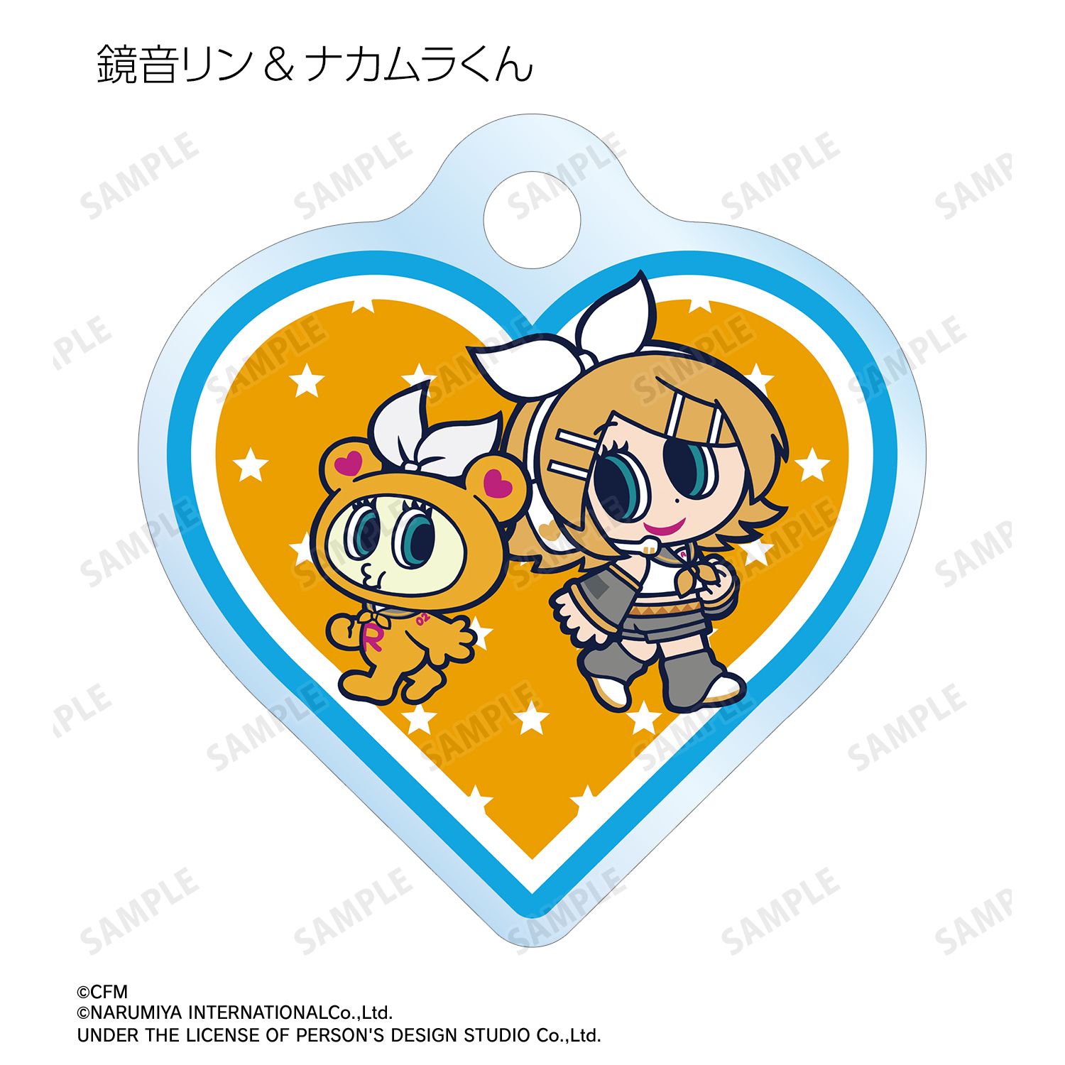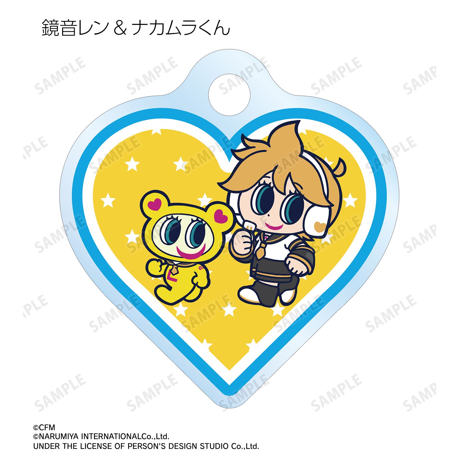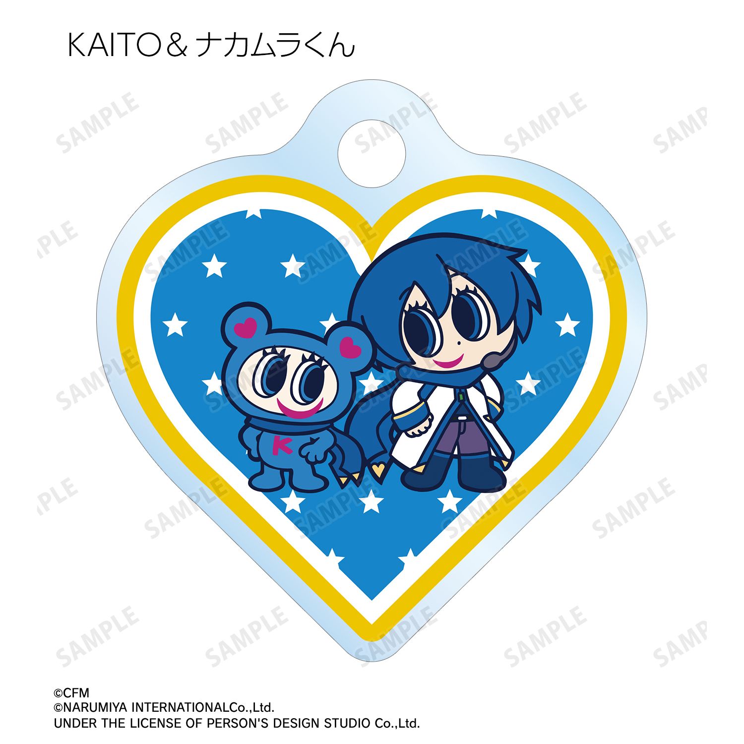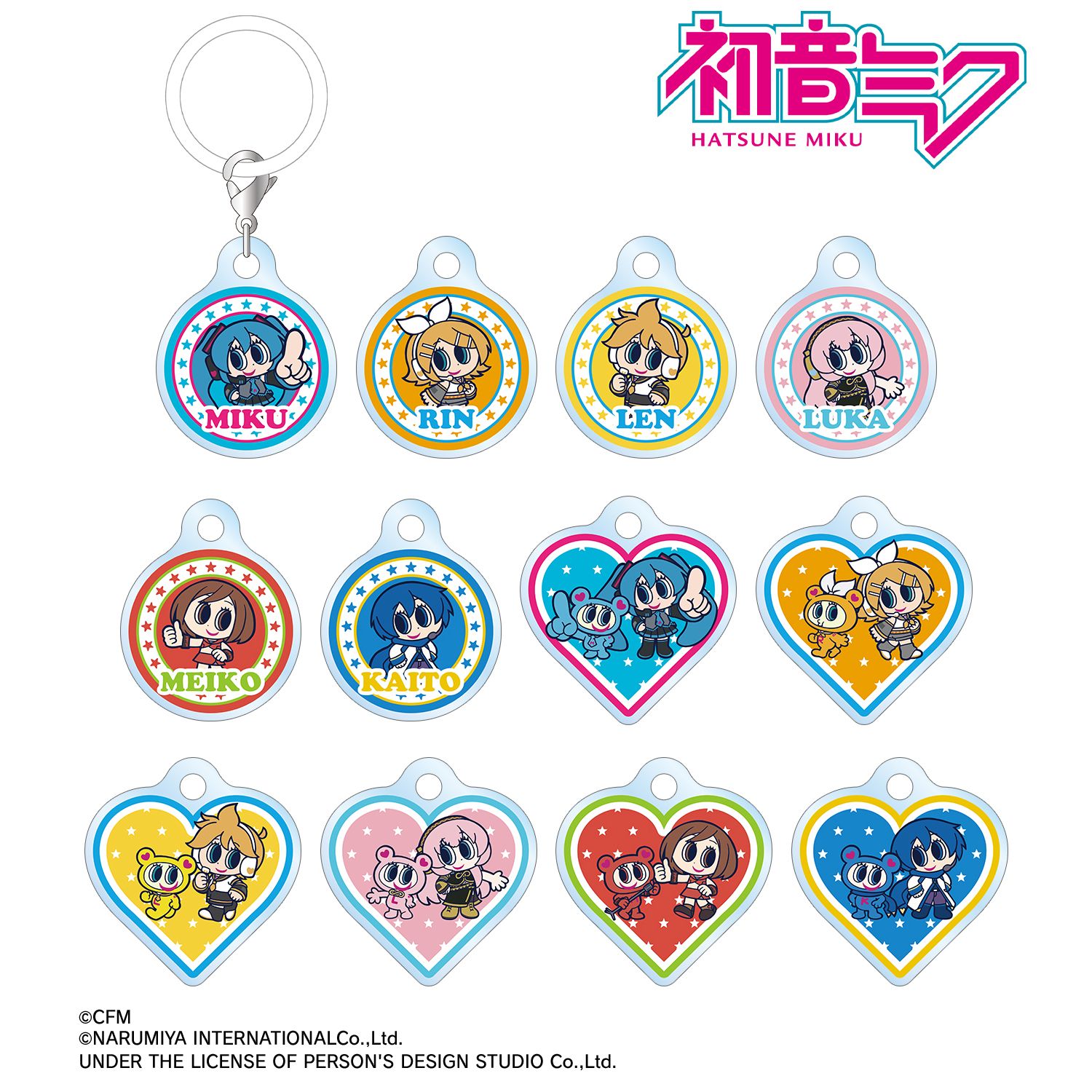 初音ミク、鏡音リン、鏡音レン、巡音ルカ、MEIKO、KAITO、ナカムラくんを描き起こしたANGEL BLUEのコラボイラストを、ダイカットのアクリルチャームに仕上げました。