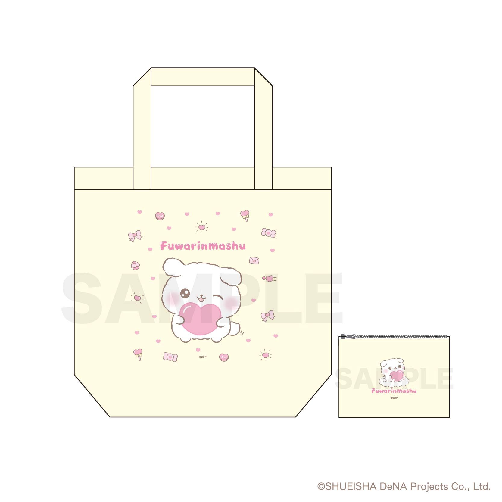 本体にはウインクしているふわりんましゅを、収納ポーチには雲の上に浮かぶふわりんましゅをあしらいました。