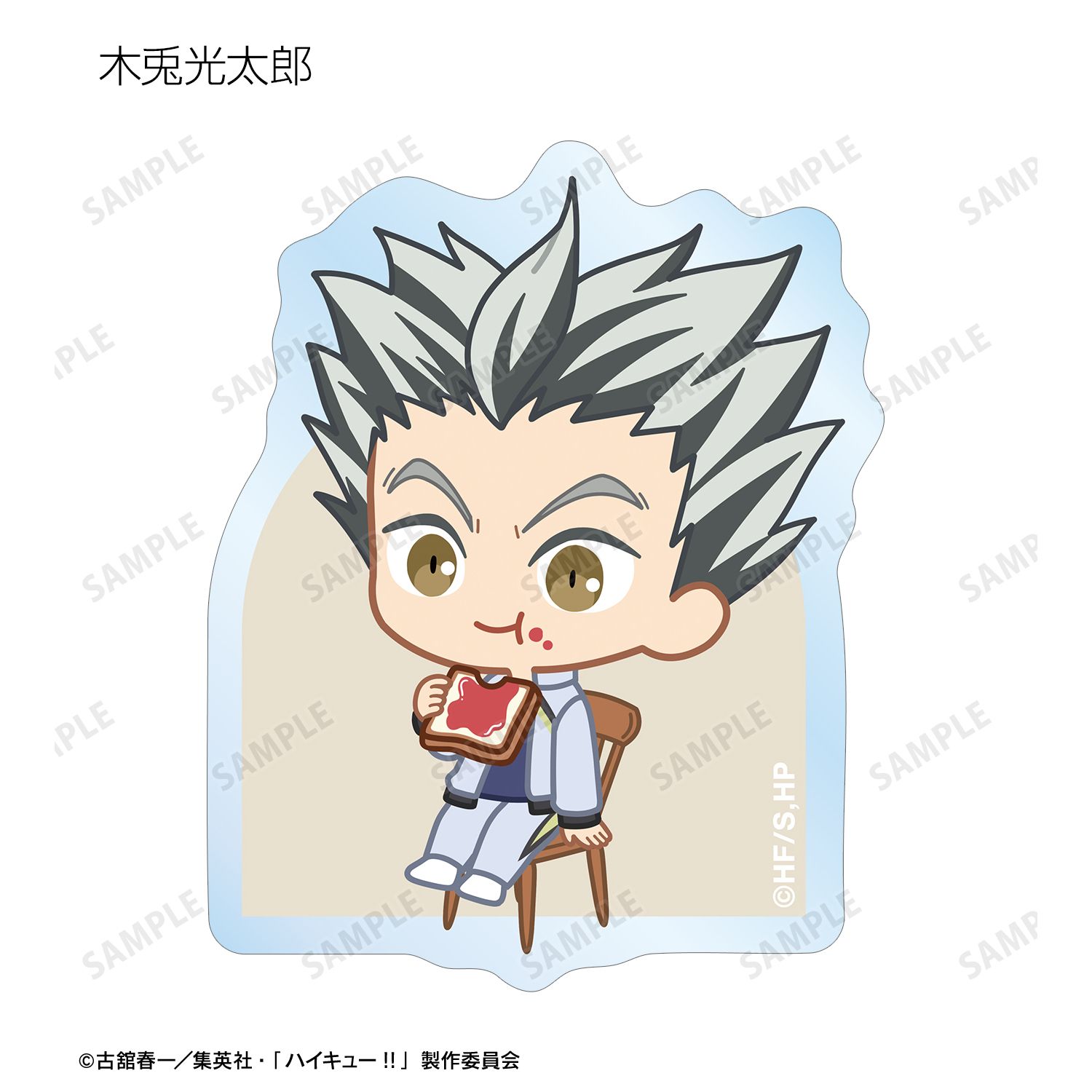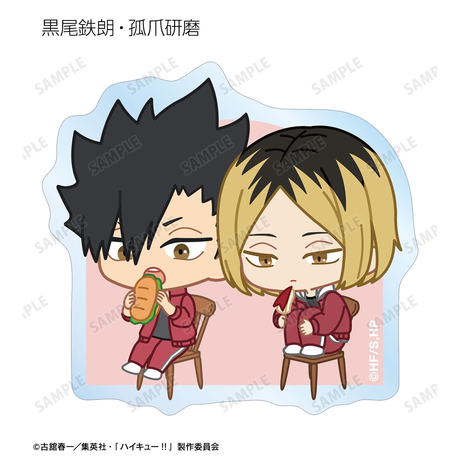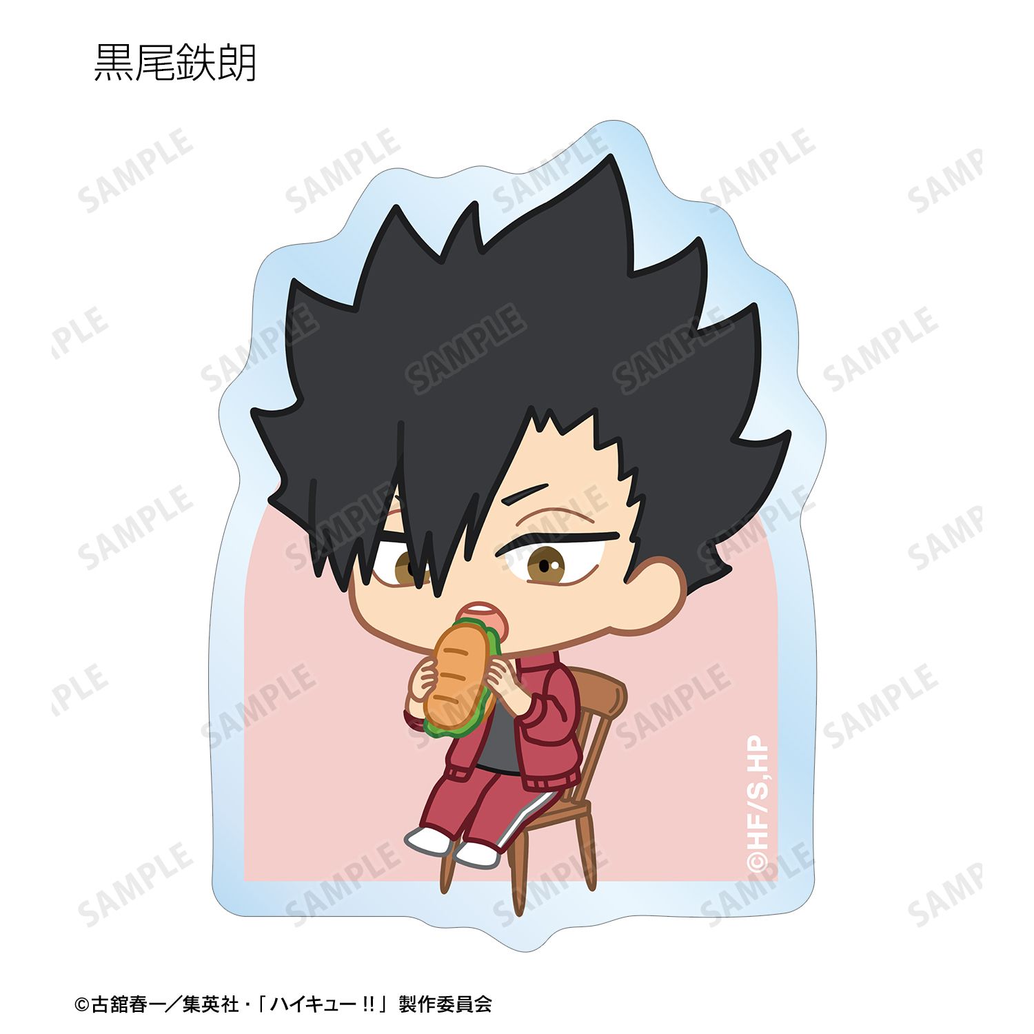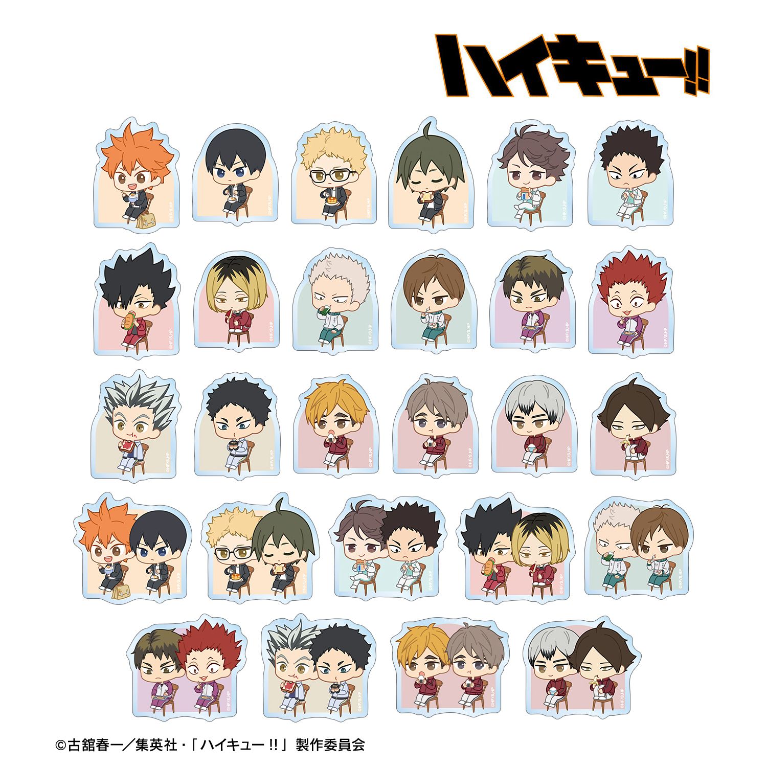 日向翔陽、影山飛雄、月島 蛍、山口 忠、及川 徹、岩泉 一、黒尾鉄朗、孤爪研磨、青根高伸、二口堅治、牛島若利、天童 覚、木兎光太郎、赤葦京治、宮 侑、宮 治、北 信介、角名倫太郎の描き起こしちびキャライラストをメインにデザインし、ダイカットのステッカーに仕上げました。
