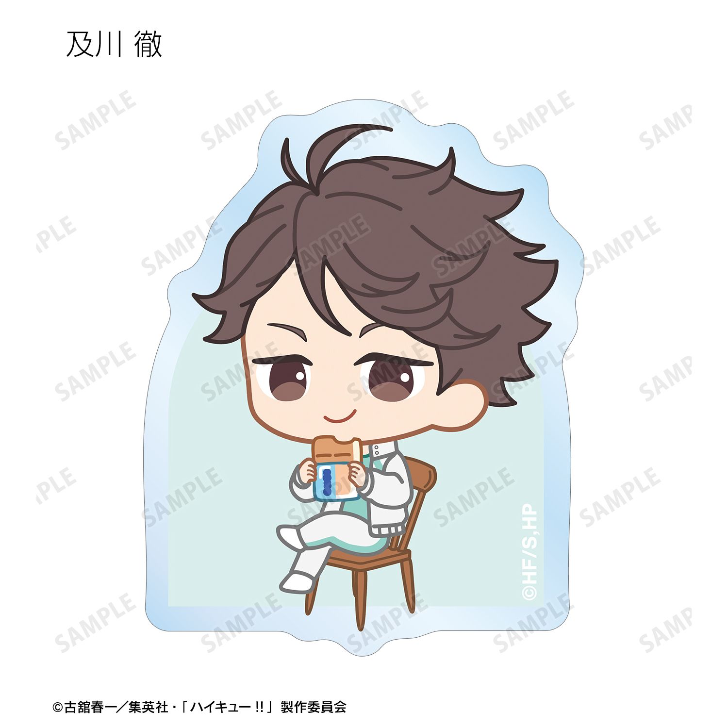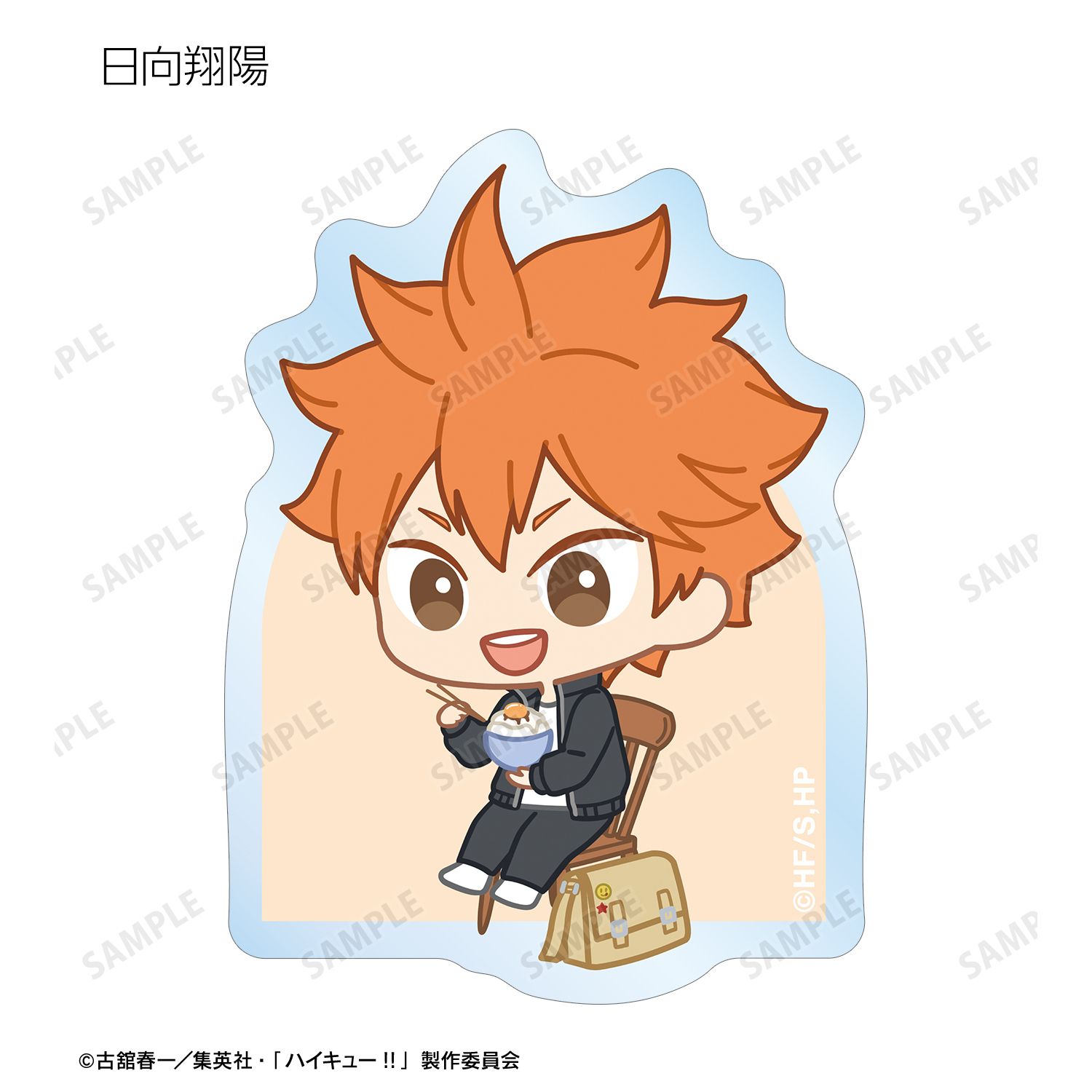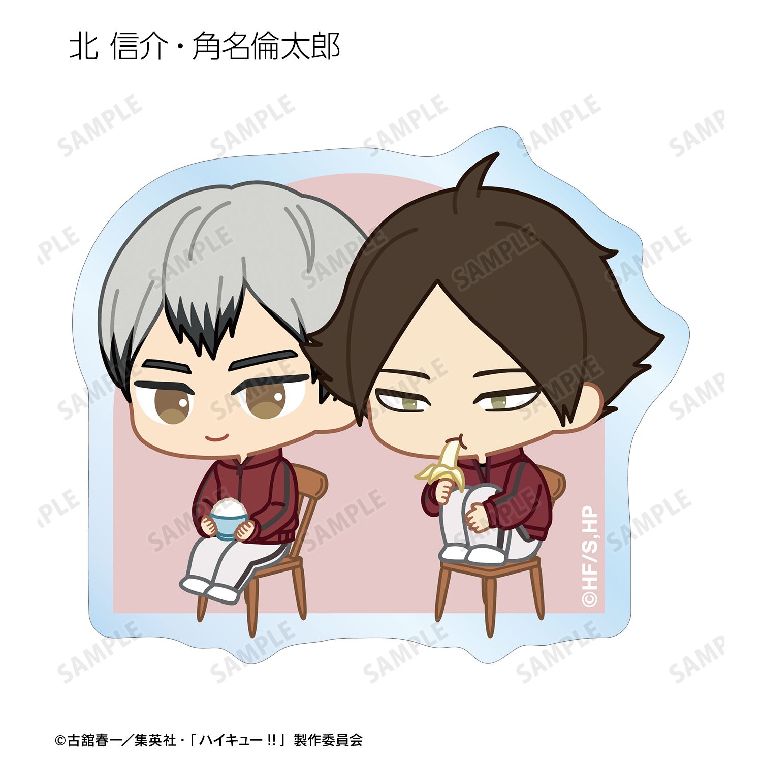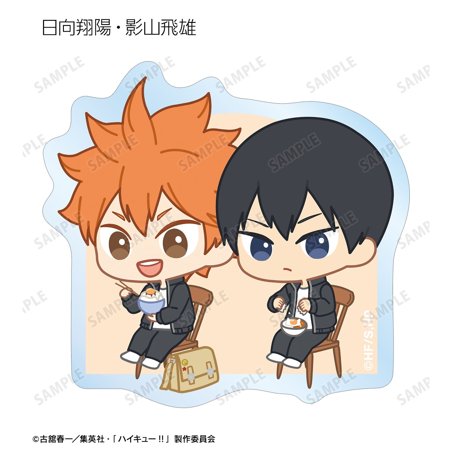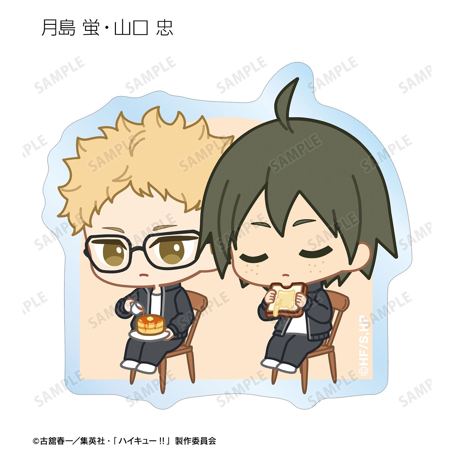 日向翔陽、影山飛雄、月島 蛍、山口 忠、及川 徹、岩泉 一、黒尾鉄朗、孤爪研磨、青根高伸、二口堅治、牛島若利、天童 覚、木兎光太郎、赤葦京治、宮 侑、宮 治、北 信介、角名倫太郎の描き起こしちびキャライラストをメインにデザインし、ダイカットのステッカーに仕上げました。