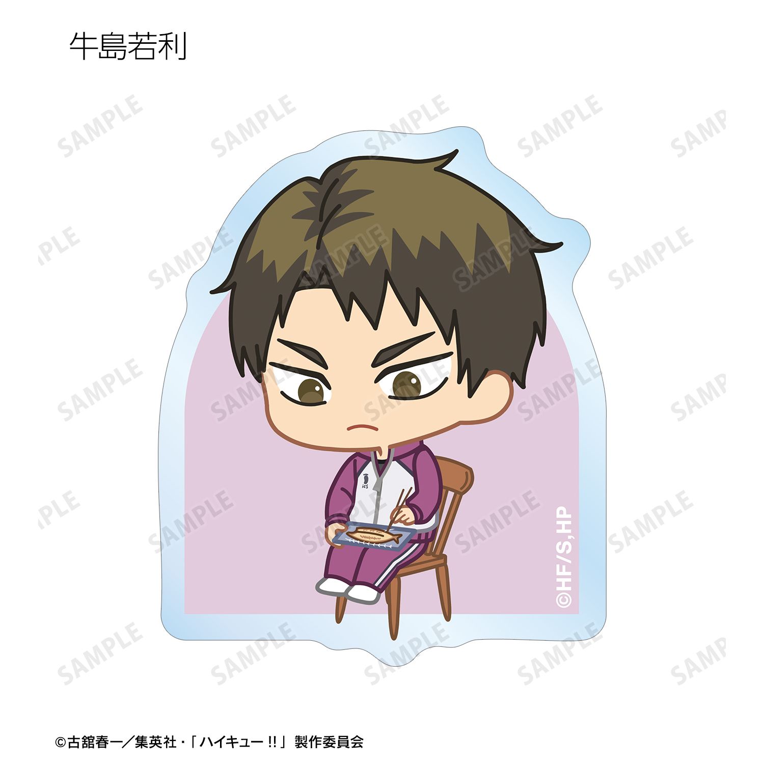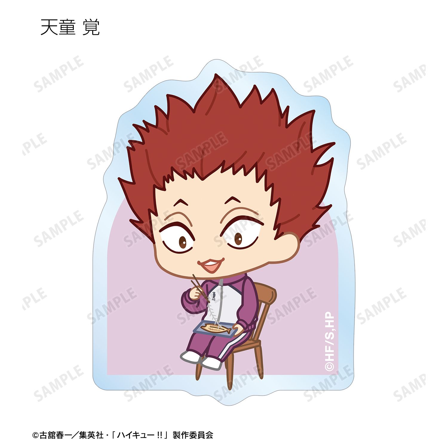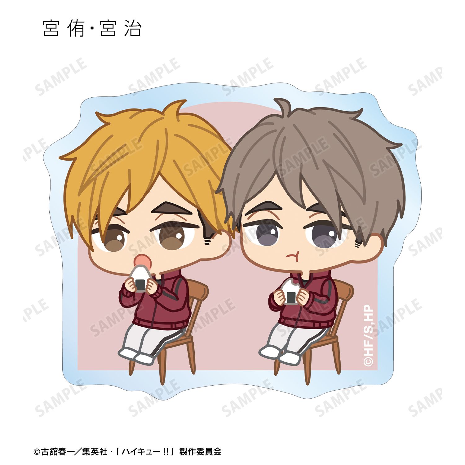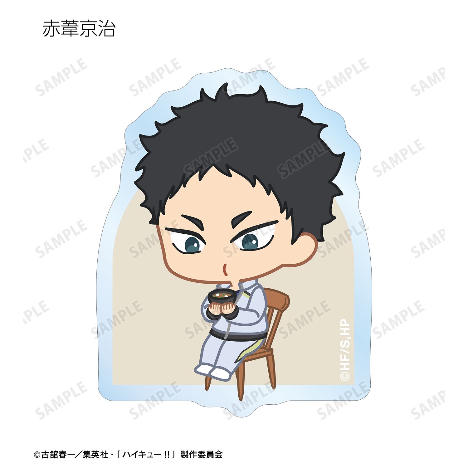日向翔陽、影山飛雄、月島 蛍、山口 忠、及川 徹、岩泉 一、黒尾鉄朗、孤爪研磨、青根高伸、二口堅治、牛島若利、天童 覚、木兎光太郎、赤葦京治、宮 侑、宮 治、北 信介、角名倫太郎の描き起こしちびキャライラストをメインにデザインし、ダイカットのステッカーに仕上げました。