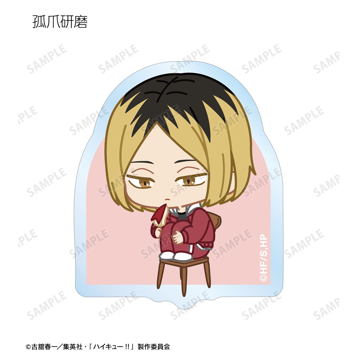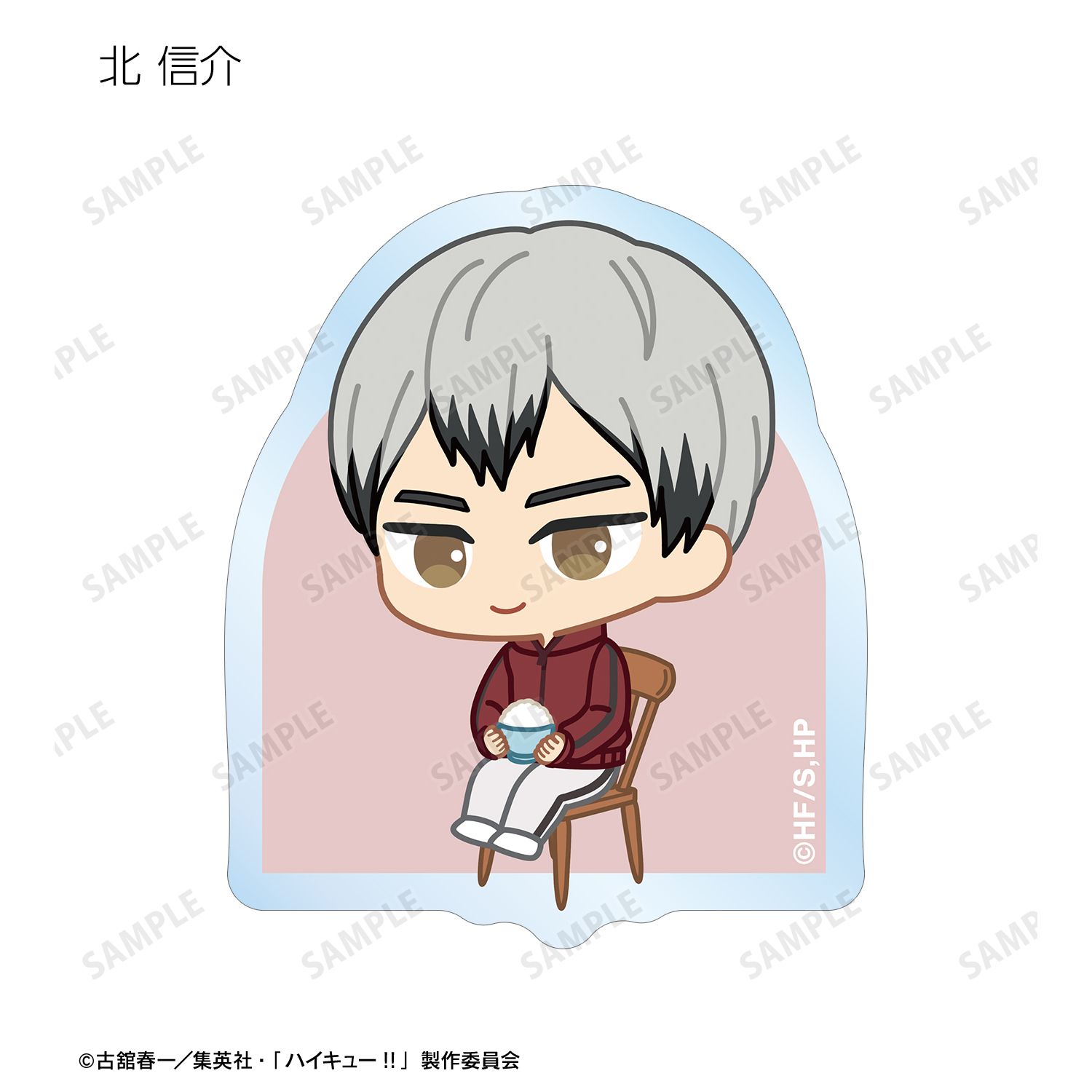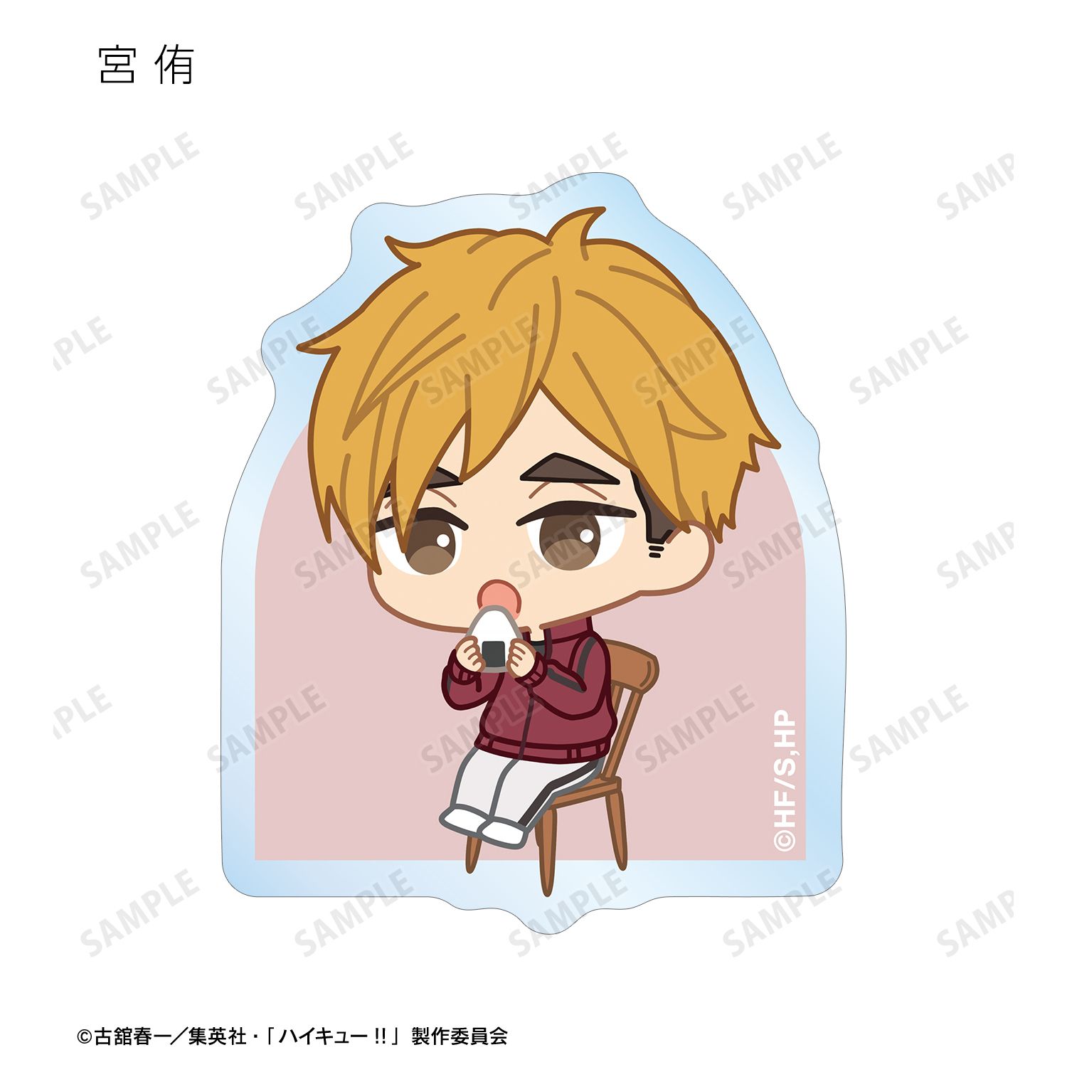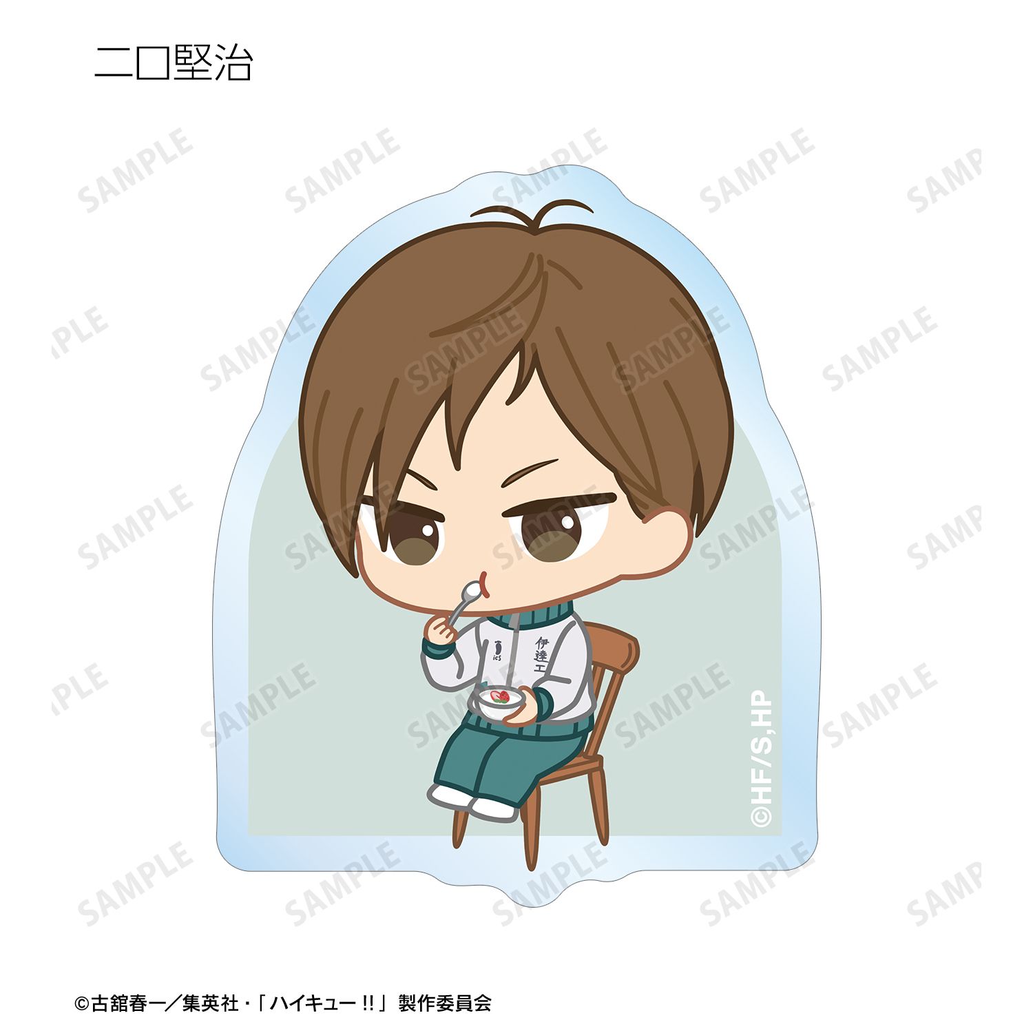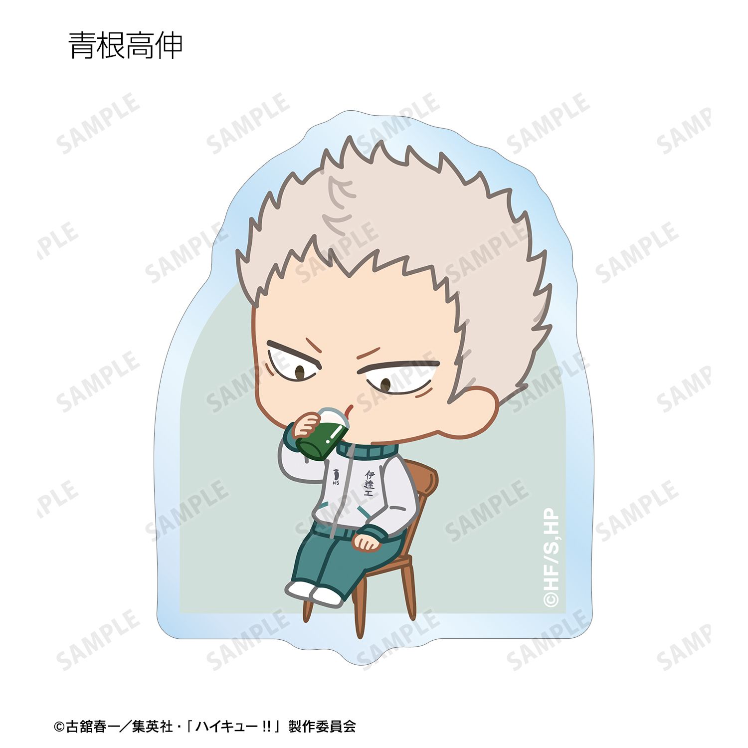 日向翔陽、影山飛雄、月島 蛍、山口 忠、及川 徹、岩泉 一、黒尾鉄朗、孤爪研磨、青根高伸、二口堅治、牛島若利、天童 覚、木兎光太郎、赤葦京治、宮 侑、宮 治、北 信介、角名倫太郎の描き起こしちびキャライラストをメインにデザインし、ダイカットのステッカーに仕上げました。