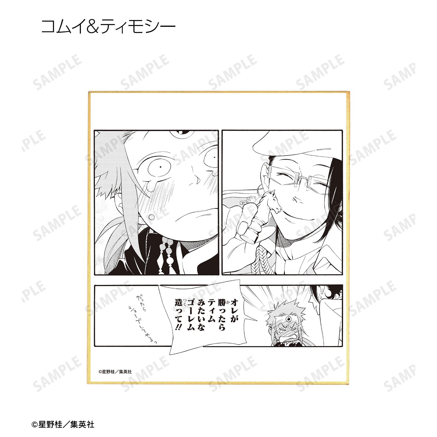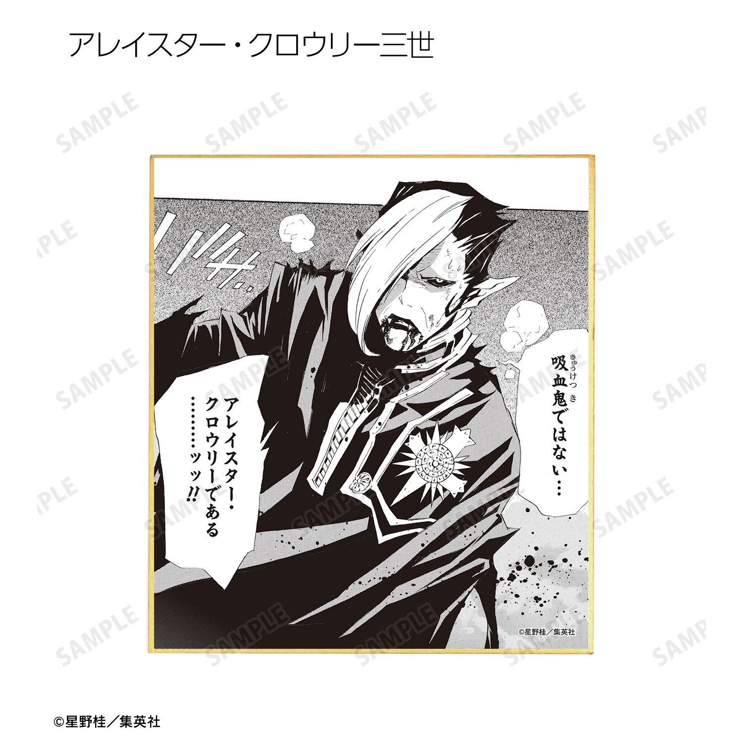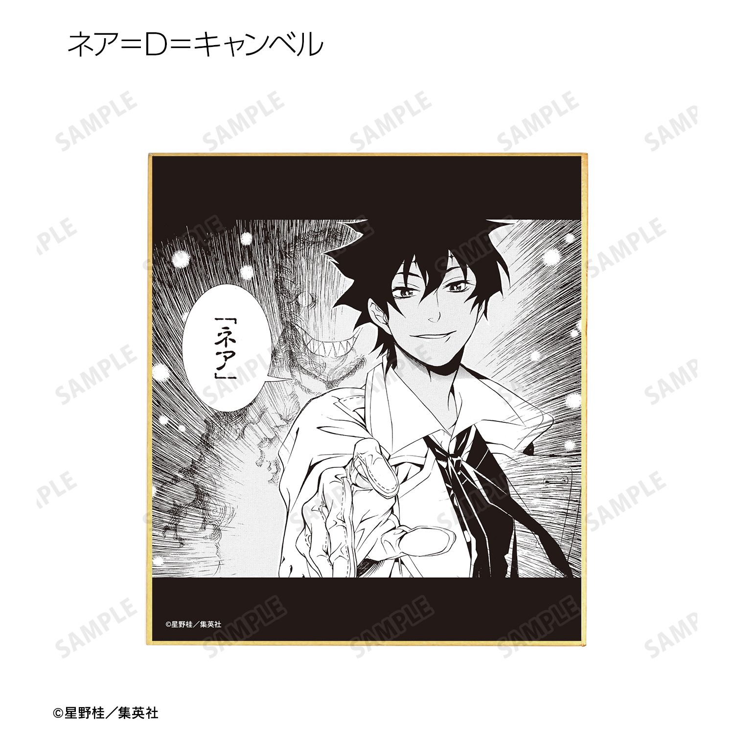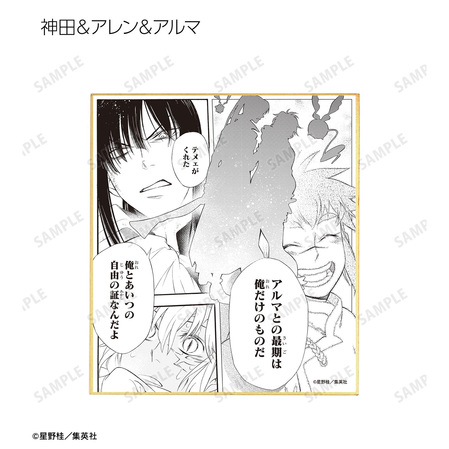 アレン・ウォーカー、千年伯爵、神田ユウ、アルマ、ラビ、リナリー・リー、アレイスター・クロウリー三世、クロス・マリアン、ティムキャンピー、コムイ・リー、ティモシー・ハースト、ハワード・リンク、ティキ・ミック、ネア=D=キャンベルの原作コマ、カラーイラストをミニ色紙に仕上げました。