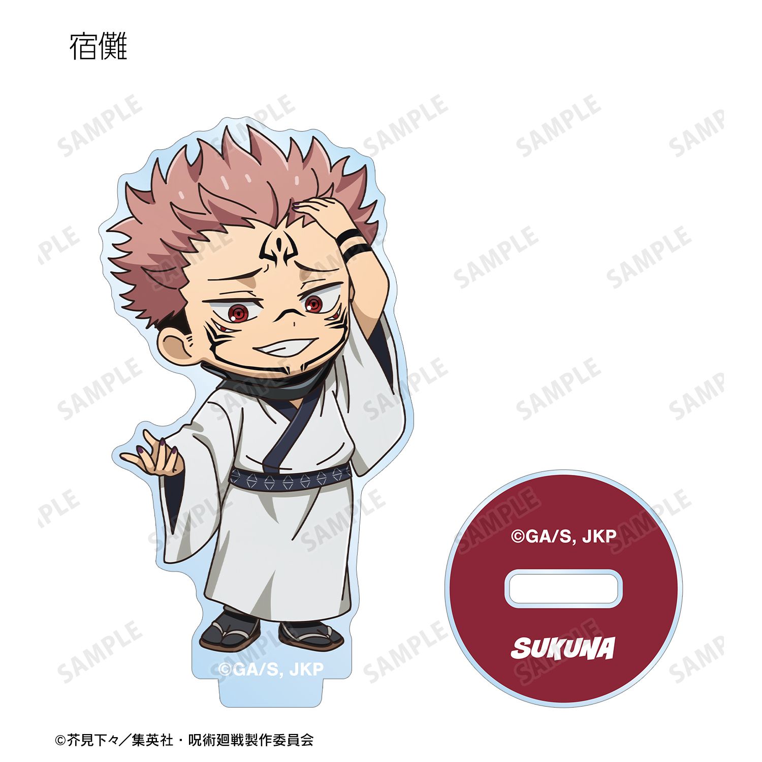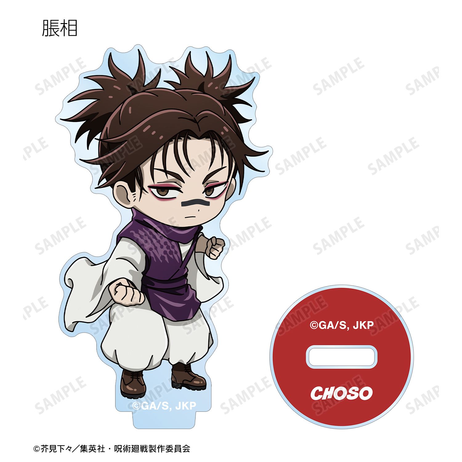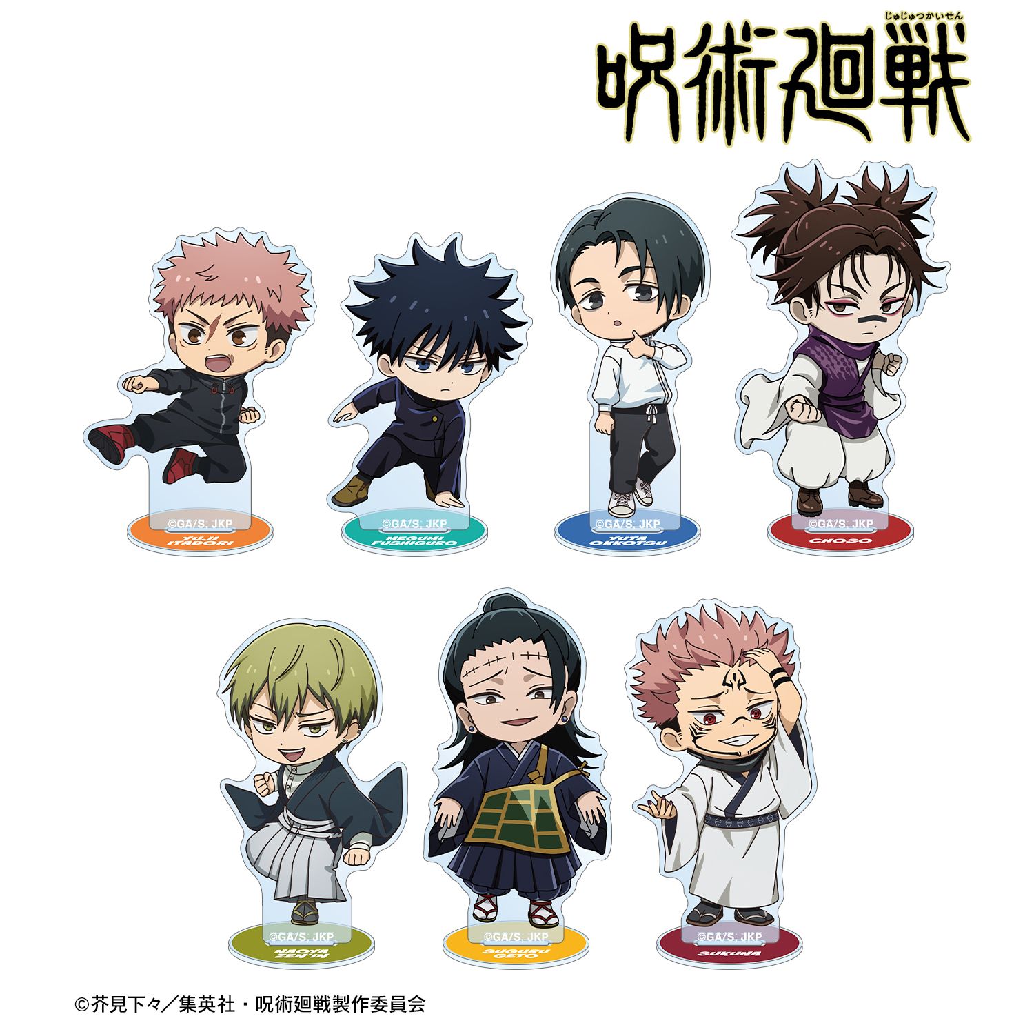 虎杖 悠仁、伏黒 恵、乙骨 憂太、脹相、禪院 直哉、夏油 傑、宿儺の描き起こしちびキャライラストをメインにデザインし、アクリルスタンドに仕上げました。