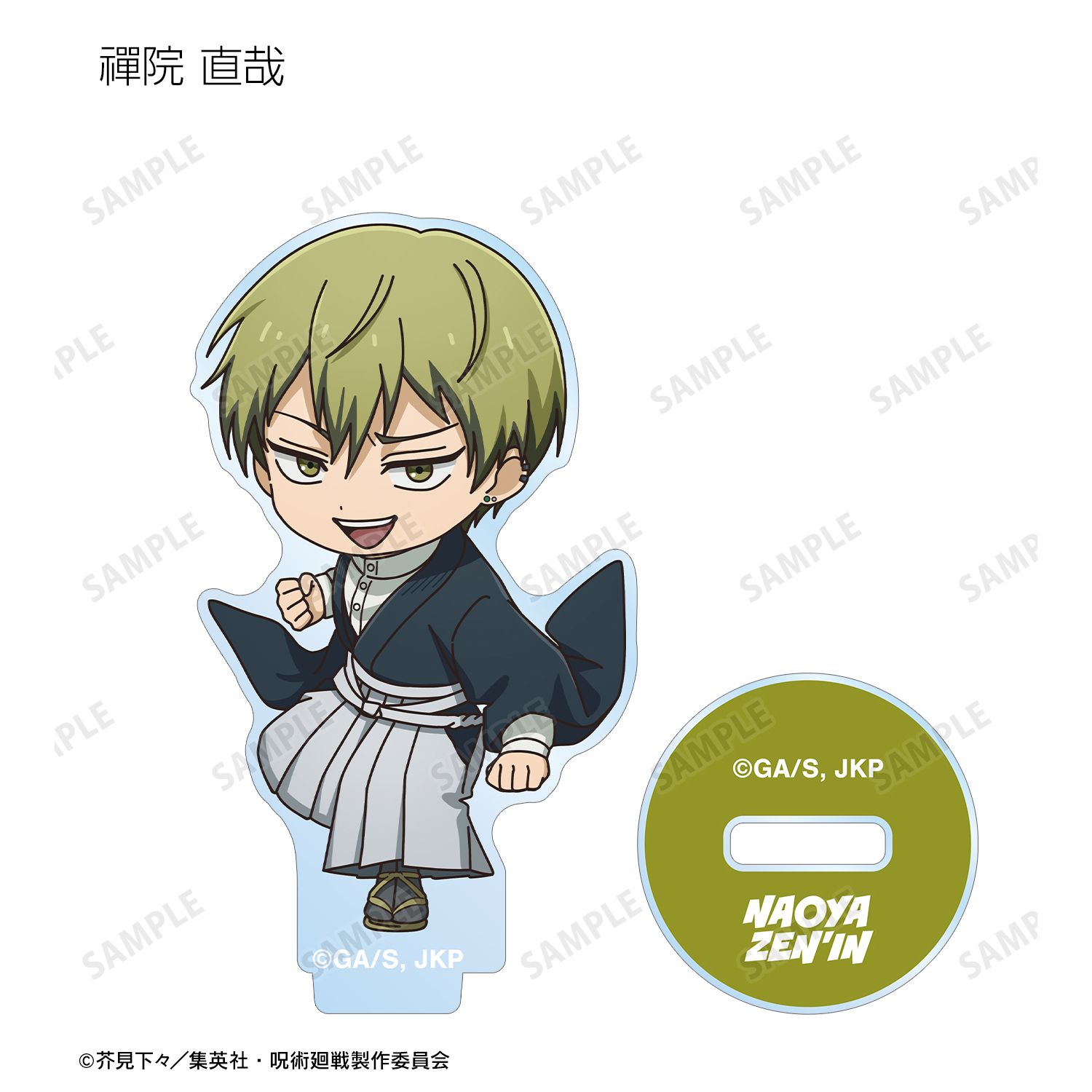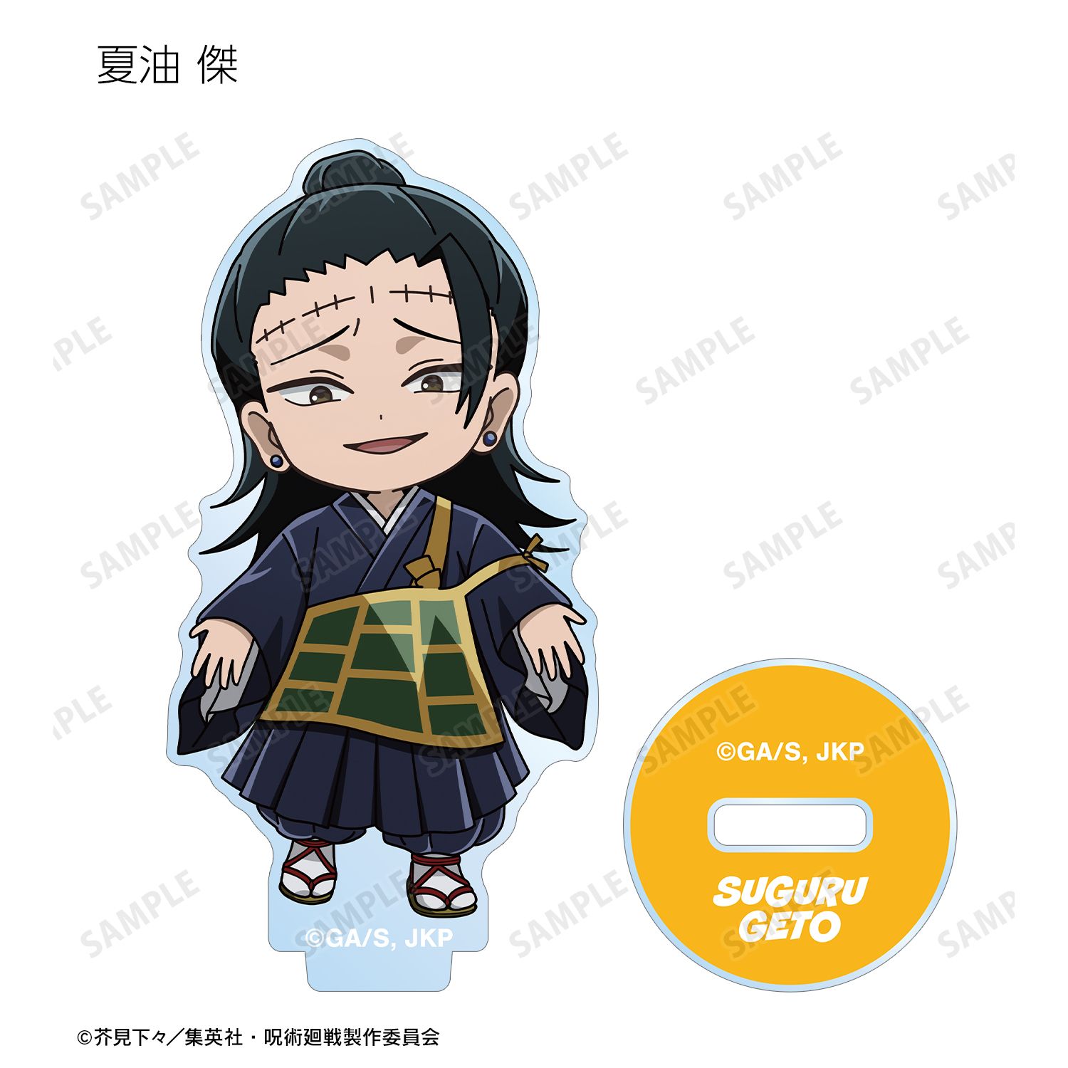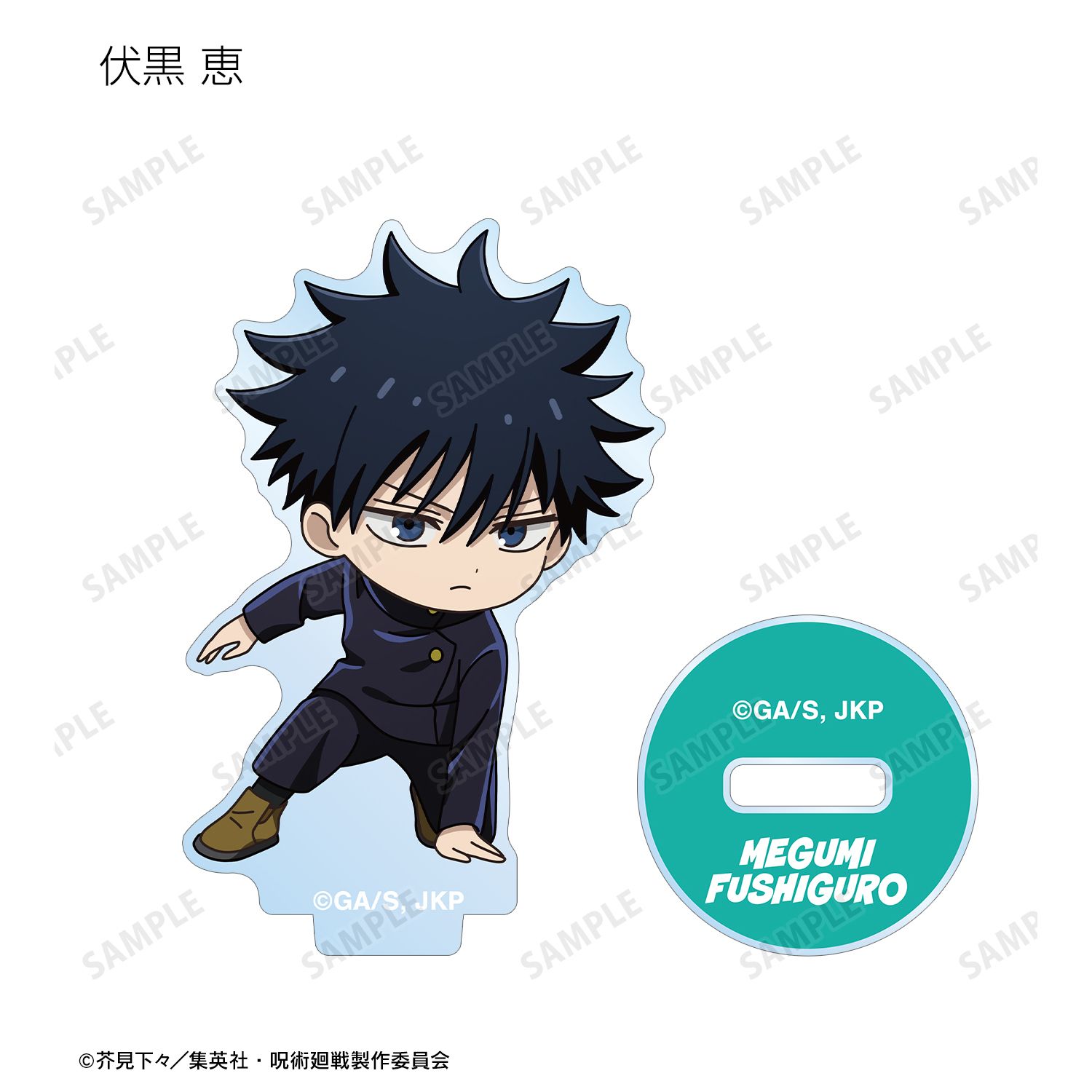 虎杖 悠仁、伏黒 恵、乙骨 憂太、脹相、禪院 直哉、夏油 傑、宿儺の描き起こしちびキャライラストをメインにデザインし、アクリルスタンドに仕上げました。