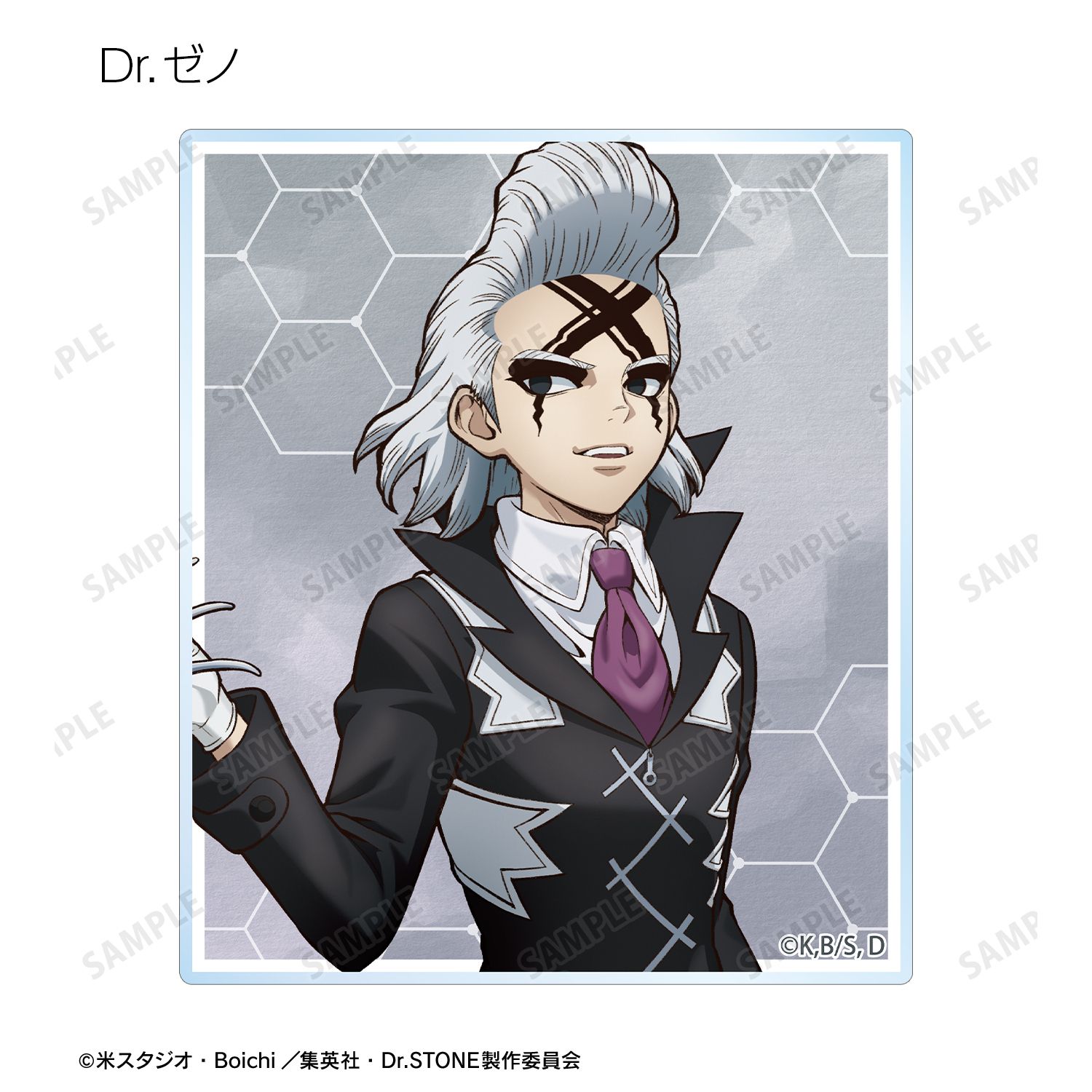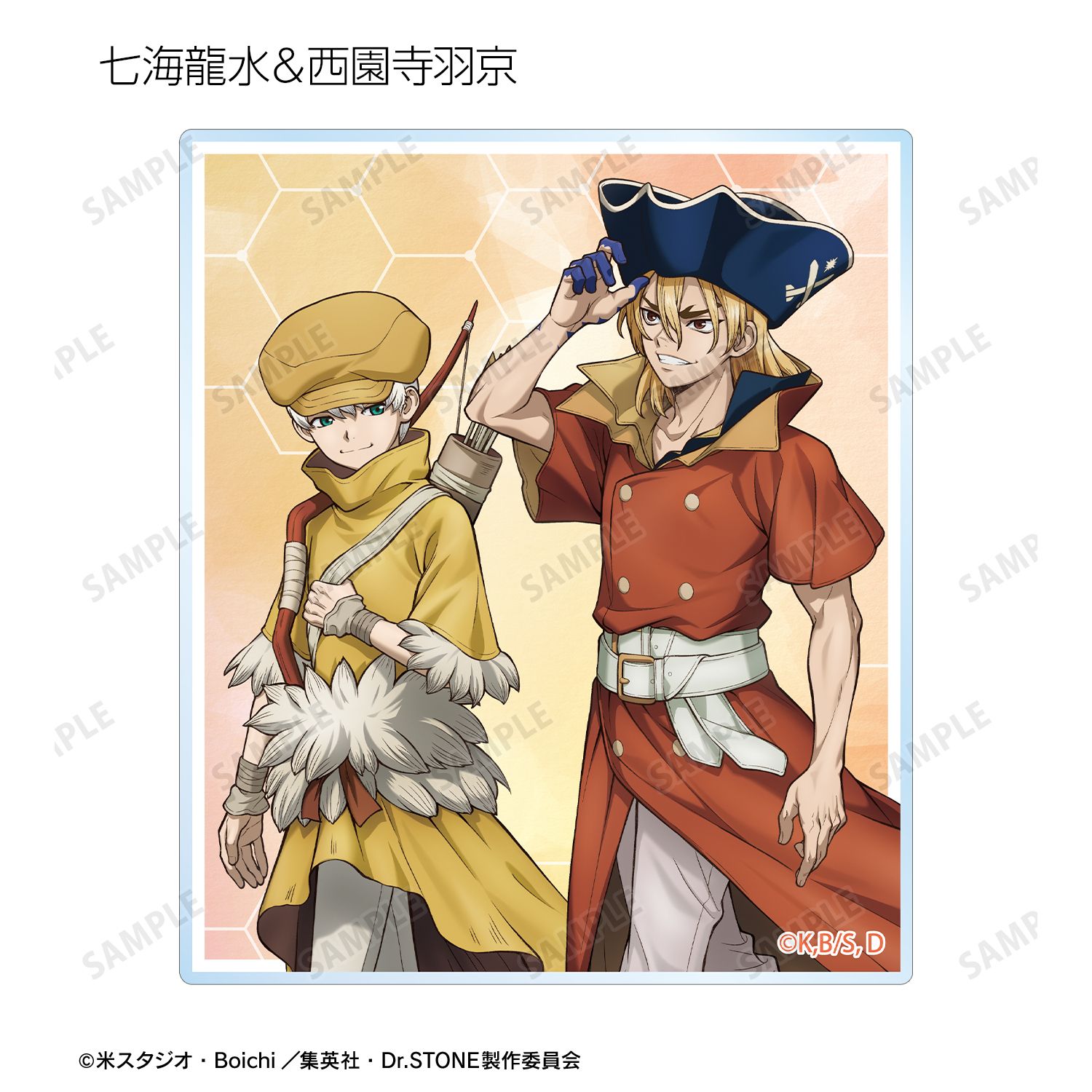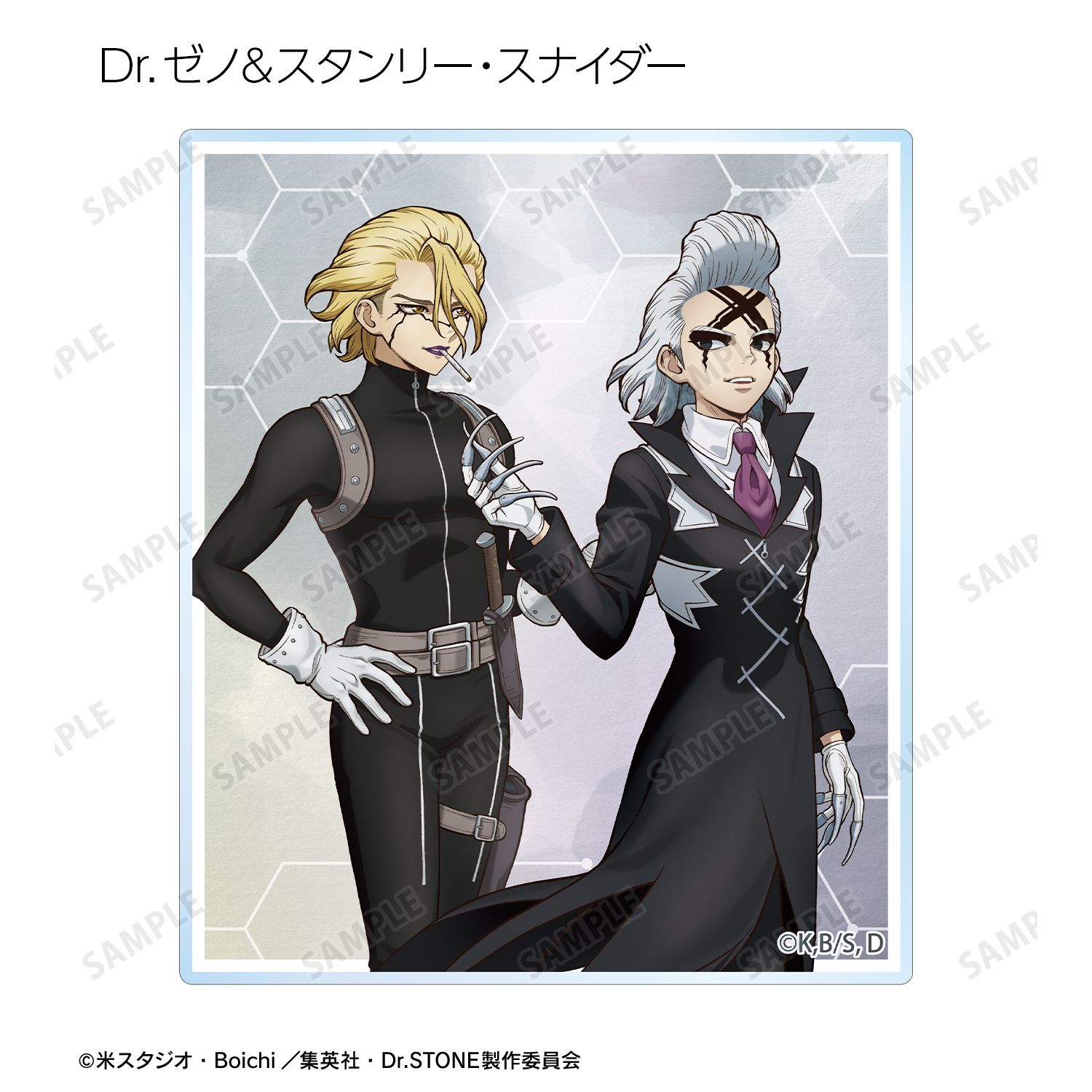 石神千空、あさぎりゲン、七海龍水、西園寺羽京、Dr.ゼノ、スタンリー・スナイダーの描き下ろしイラストをアクリルカードに仕上げました。