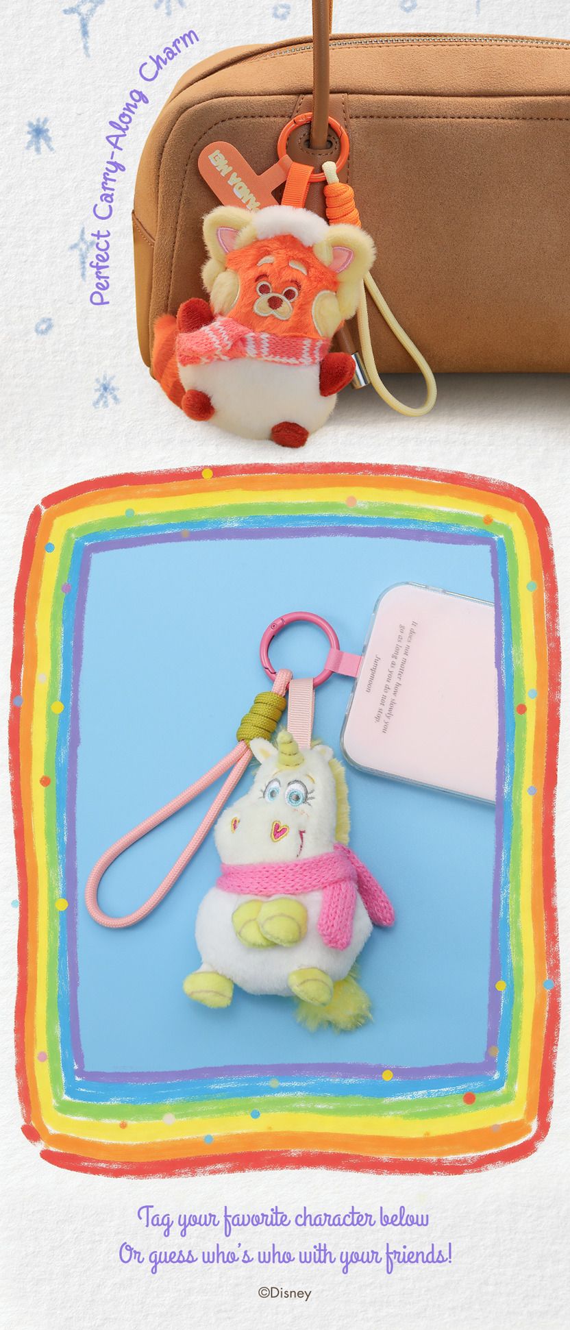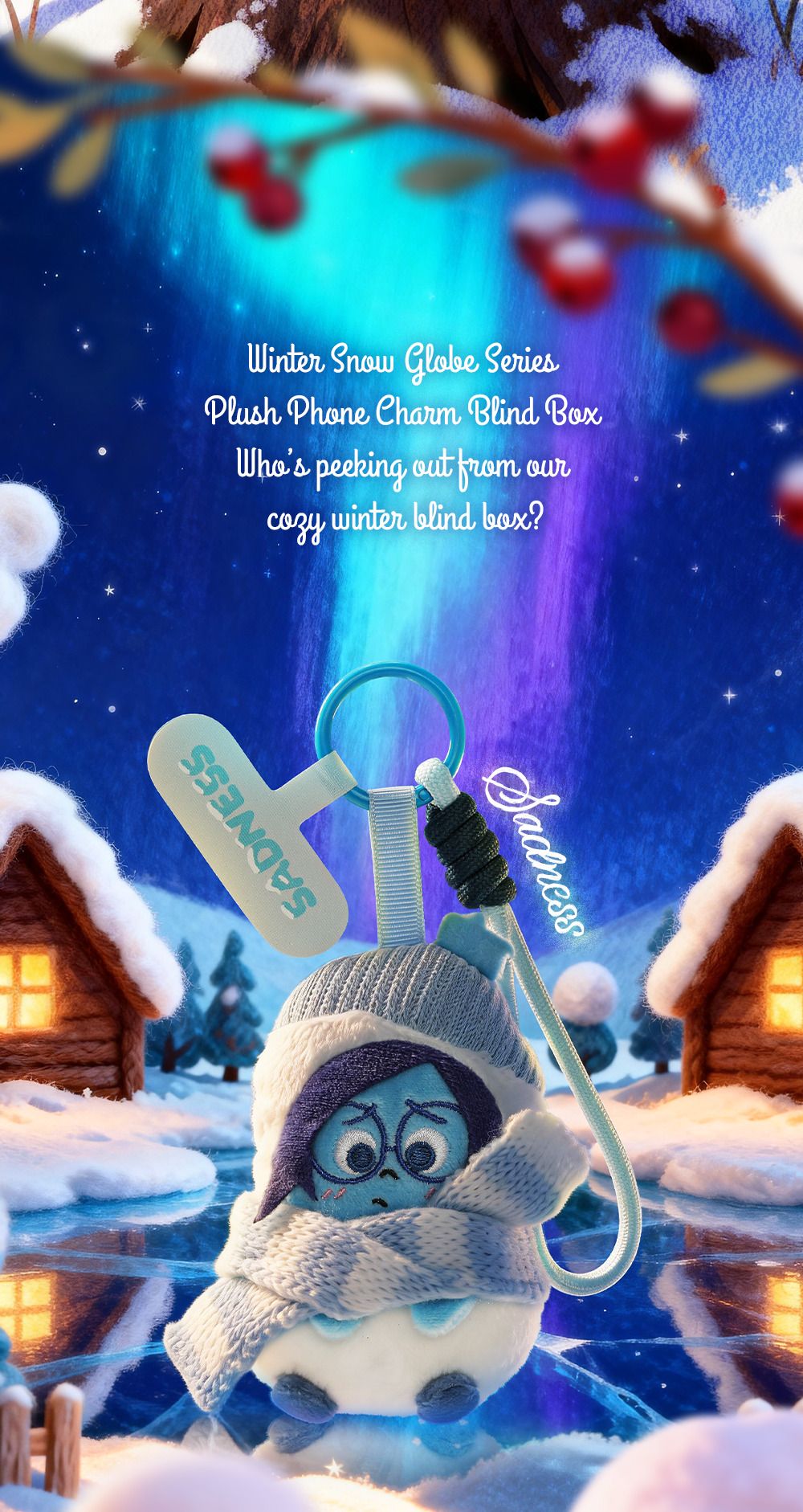 ピクサー作品の人気キャラクターたちが雪小屋でくつろいでるようなぬいぐるみスマホストラップ。
