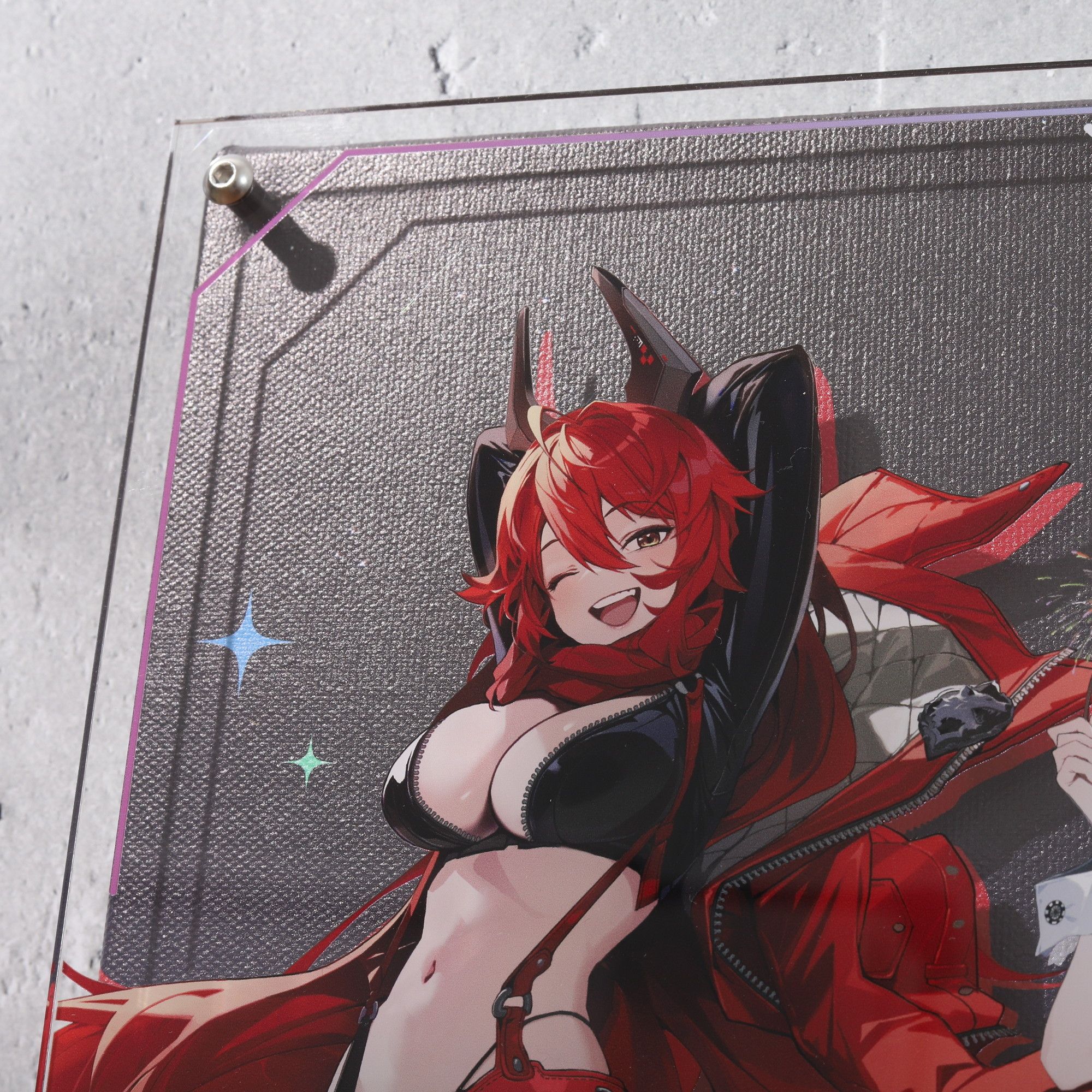 キャラクターが印刷されたアクリルパネルと、背景のキャンバス地を組み合わせることで立体的に表現したアート商品です。