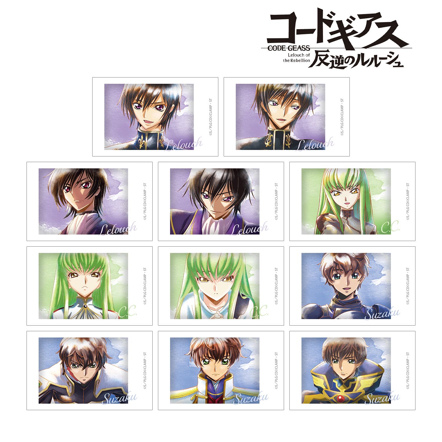 ルルーシュ、C.C.、スザクのイラストを新たなタッチで魅力的に表現し、イラストカードに仕上げました。