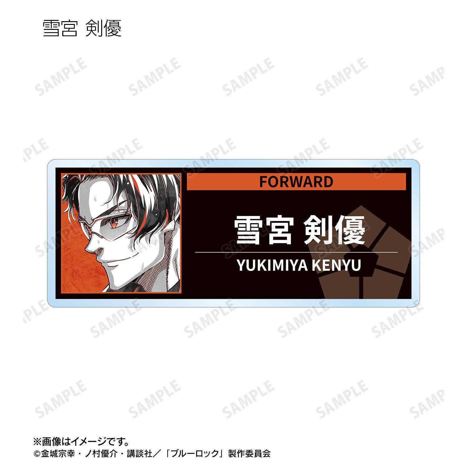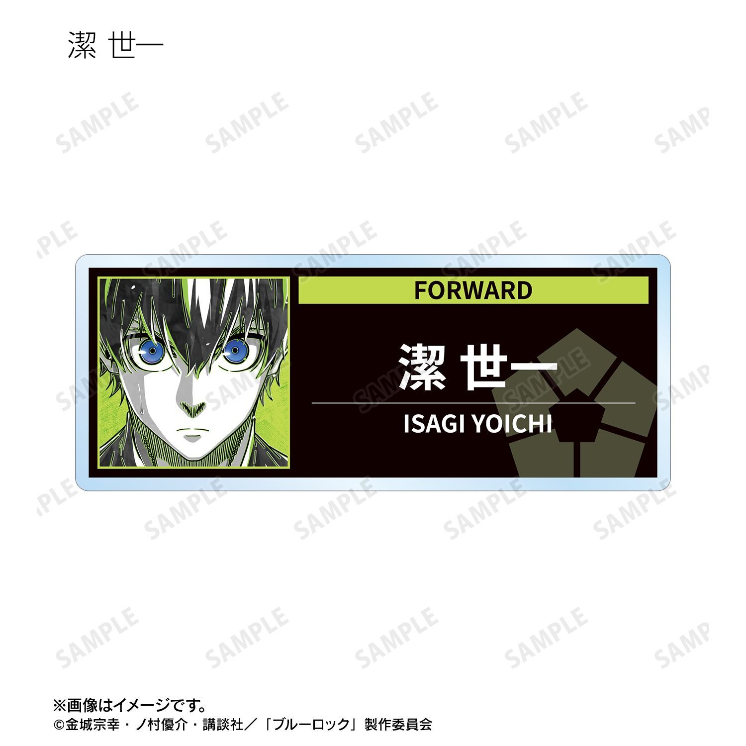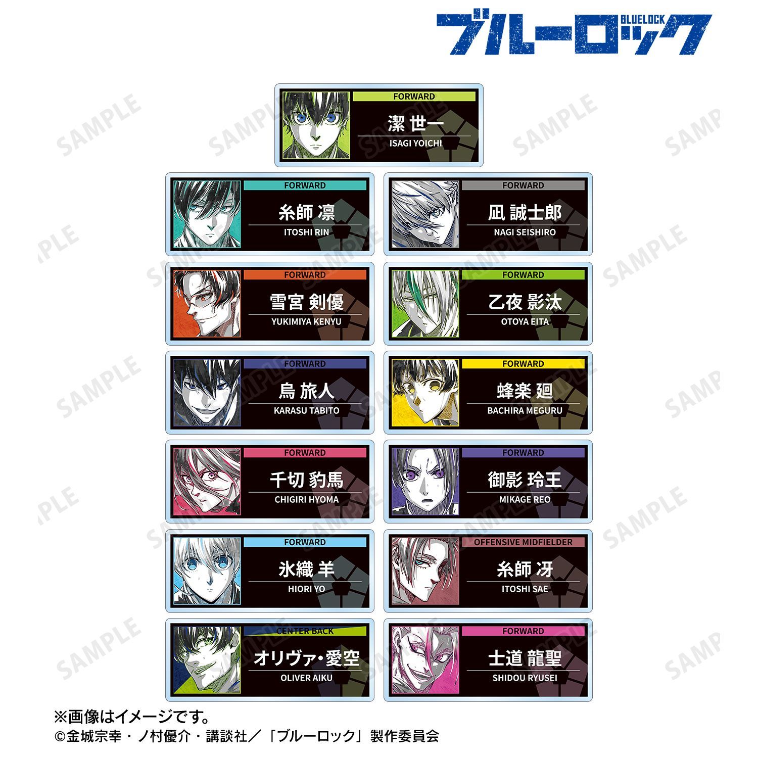 潔 世一、糸師 凛、凪 誠士郎、雪宮 剣優、乙夜 影汰、烏 旅人、蜂楽 廻、千切 豹馬、御影 玲王、氷織 羊、糸師 冴、オリヴァ・愛空、士道 龍聖のイラストを新たなタッチで魅力的に表現し、アクリルネームプレートに仕上げました。