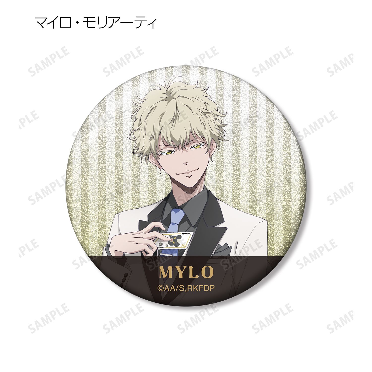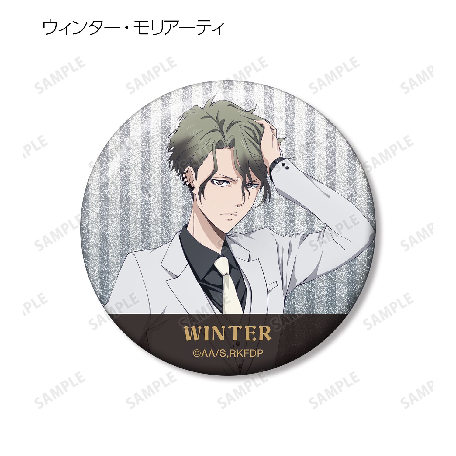 鴨乃橋ロン、一色都々丸、雨宮、マイロ・モリアーティ、ウィンター・モリアーティの描き下ろしイラストを、グリッター加工を施した缶バッジに仕上げました。
