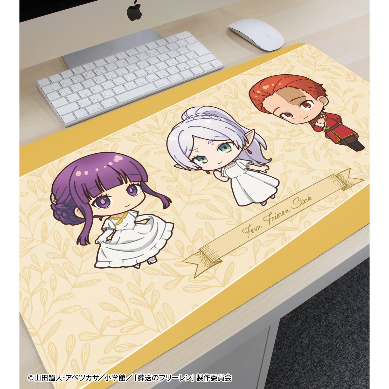 フリーレン、フェルン、シュタルクの描き起こしちびキャライラストをメインにデザインし、マルチデスクマットに仕上げました。