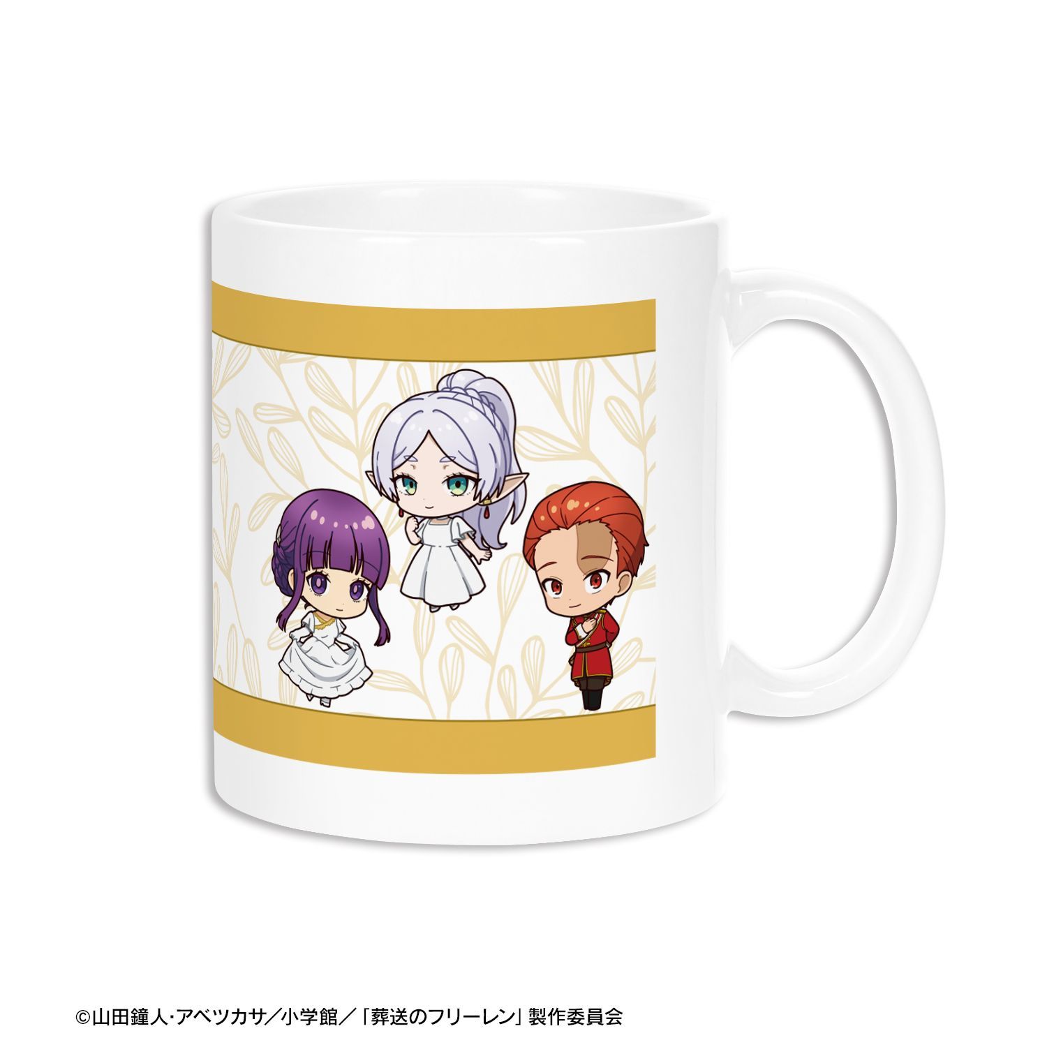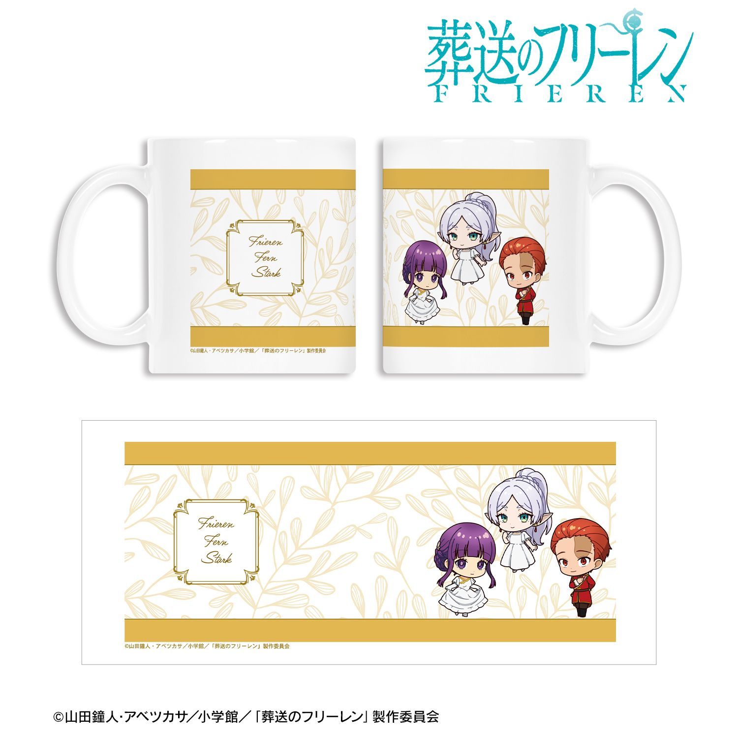 フリーレン、フェルン、シュタルクの描き起こしちびキャライラストをメインにデザインし、マグカップに仕上げました。