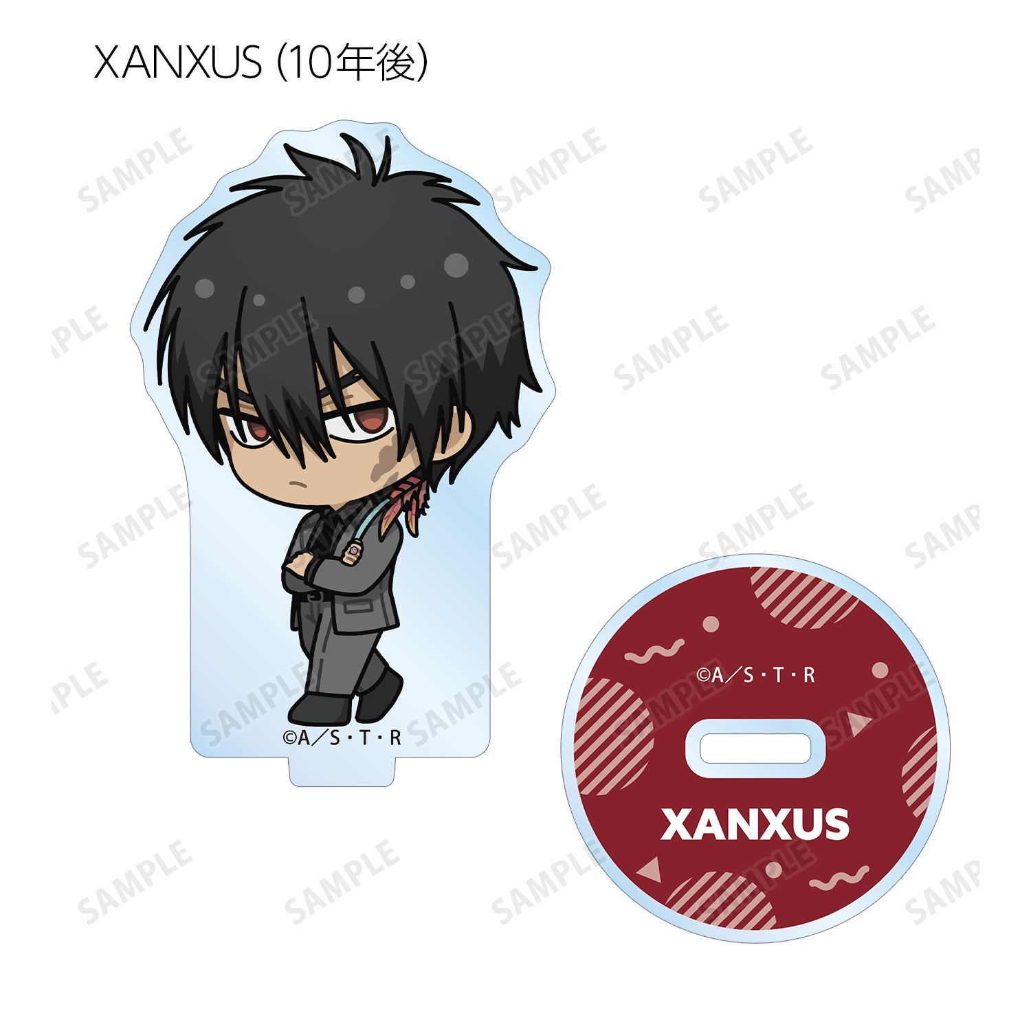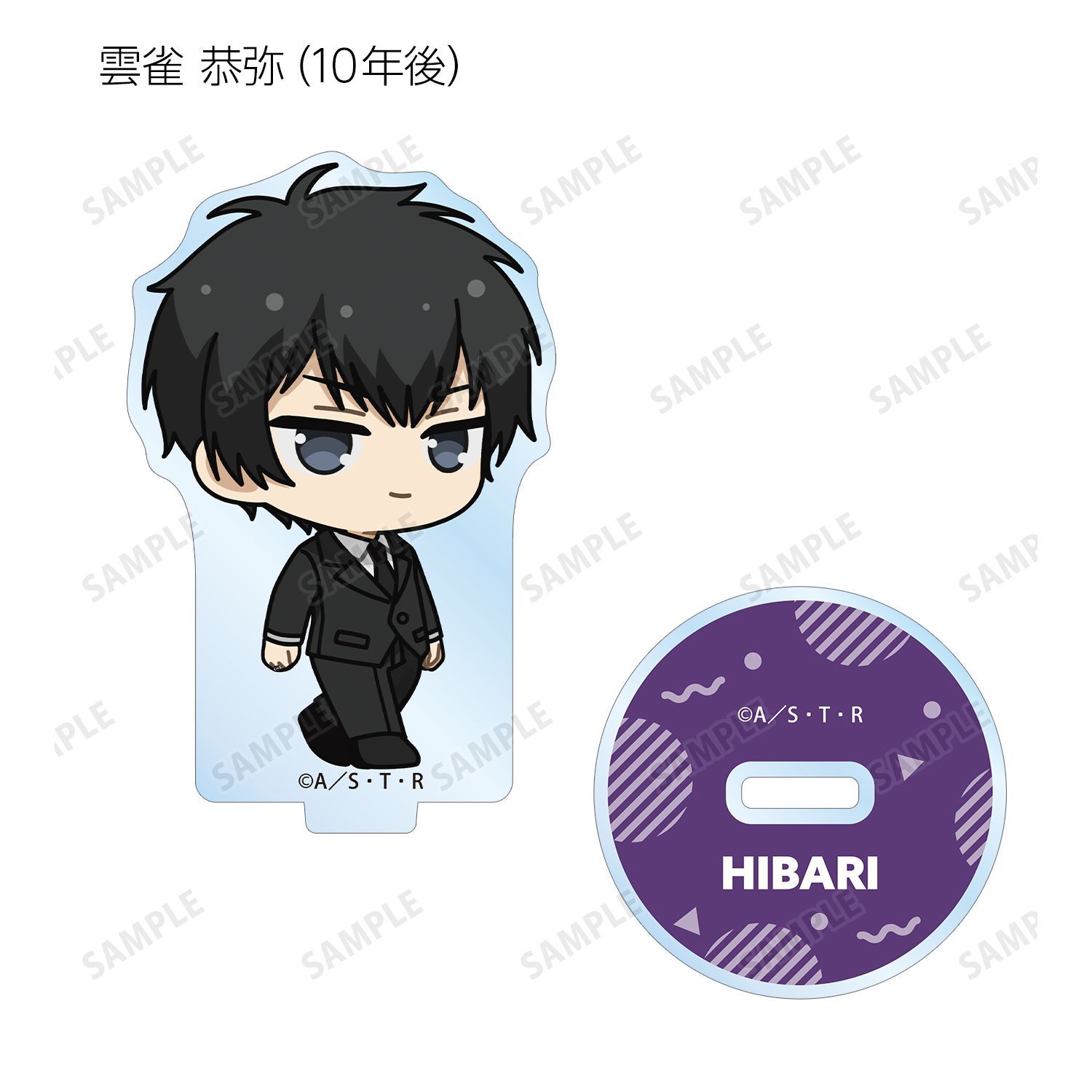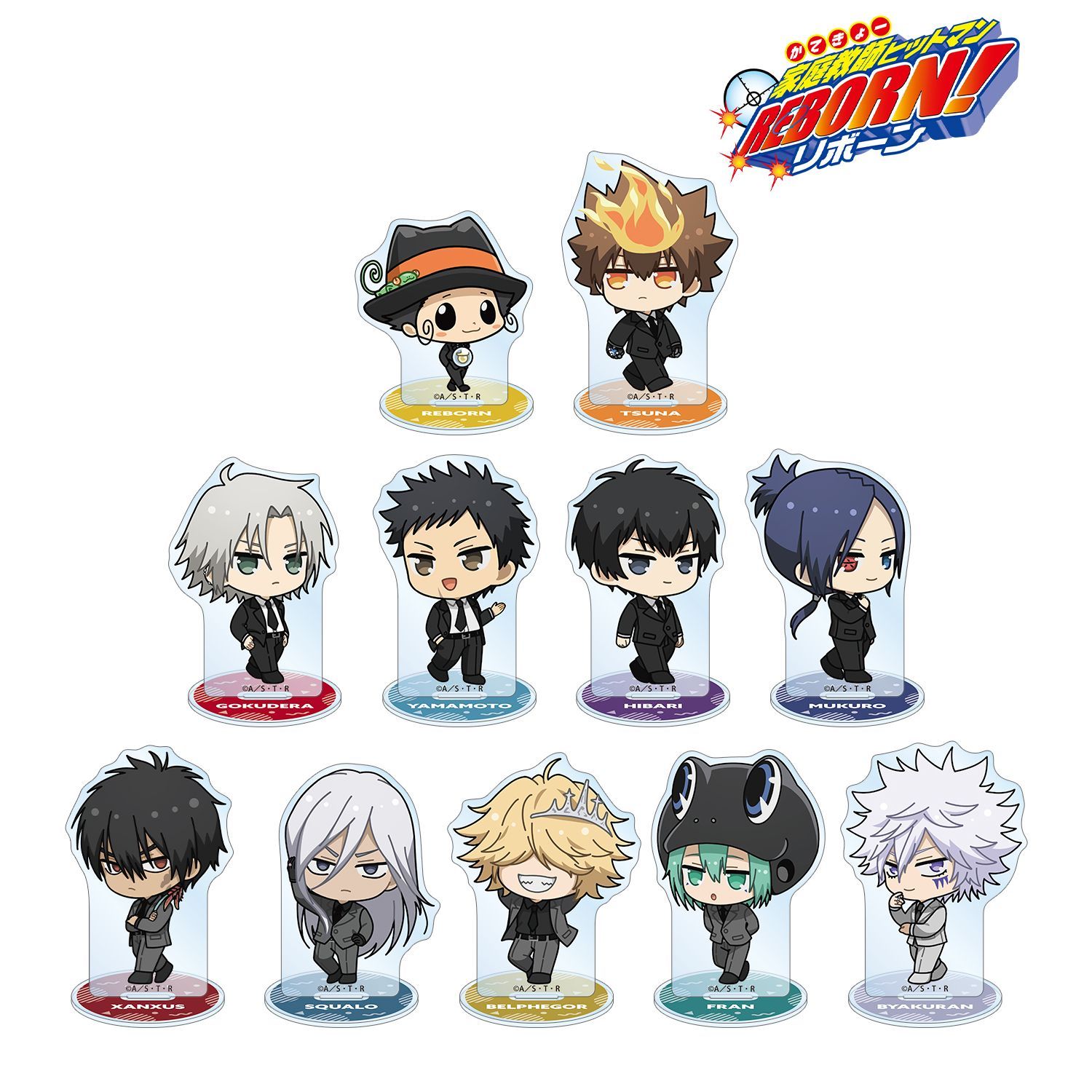 リボーン、沢田 綱吉、獄寺 隼人(10年後)、山本 武(10年後)、雲雀 恭弥(10年後)、六道 骸(10年後)、XANXUS(10年後)、スペルビ・スクアーロ(10年後)、ベルフェゴール(10年後)、フラン、白蘭の描き起こしちびキャライラストをメインにデザインし、アクリルスタンドに仕上げました。