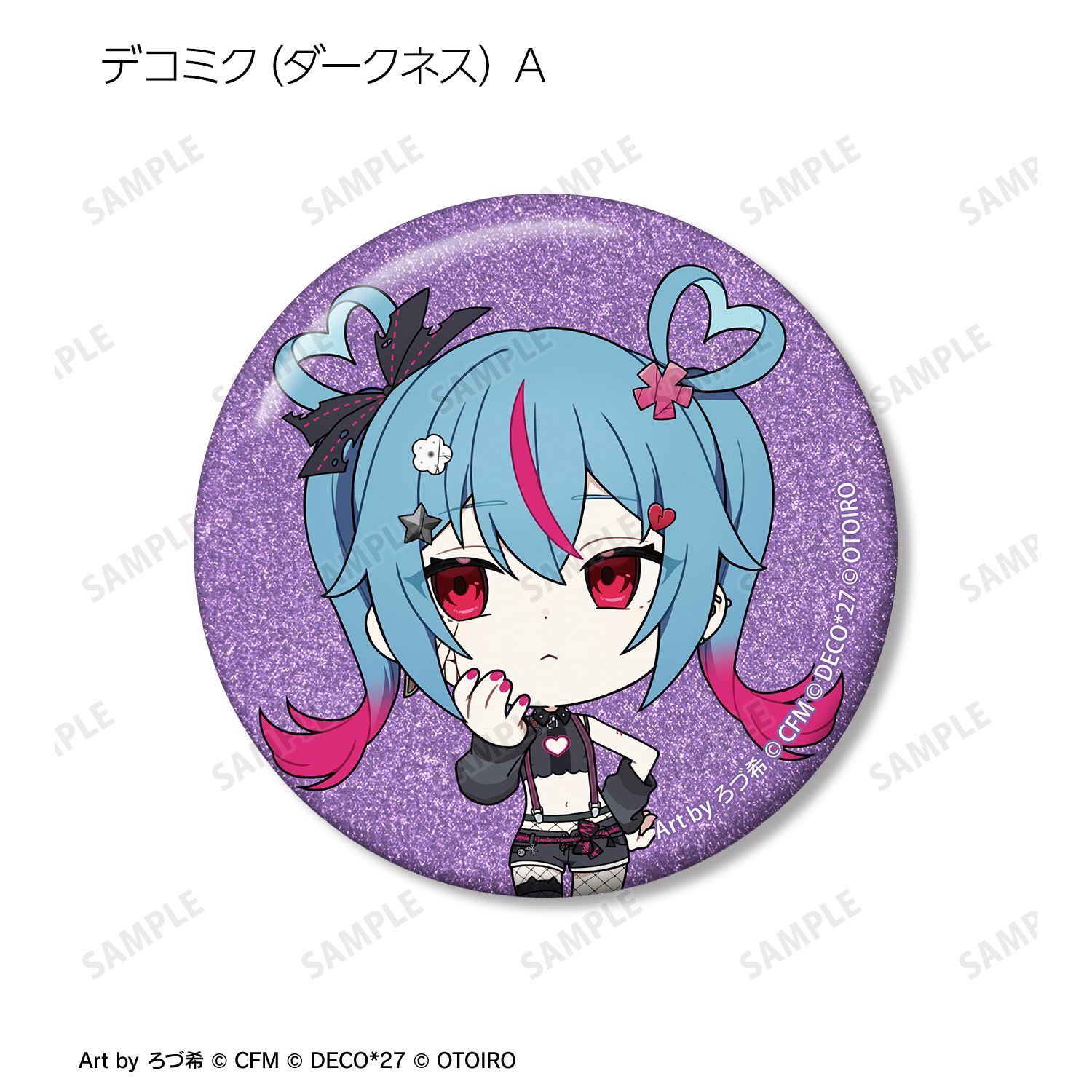 ろづ希さん描き下ろしのデコミク (ライトネス)、デコミク (ダークネス)、テレパシ、モニタリング、ラビットホール、ヴァンパイアのちびキャライラストをメインにデザインし、グリッター加工を施した缶バッジに仕上げました。