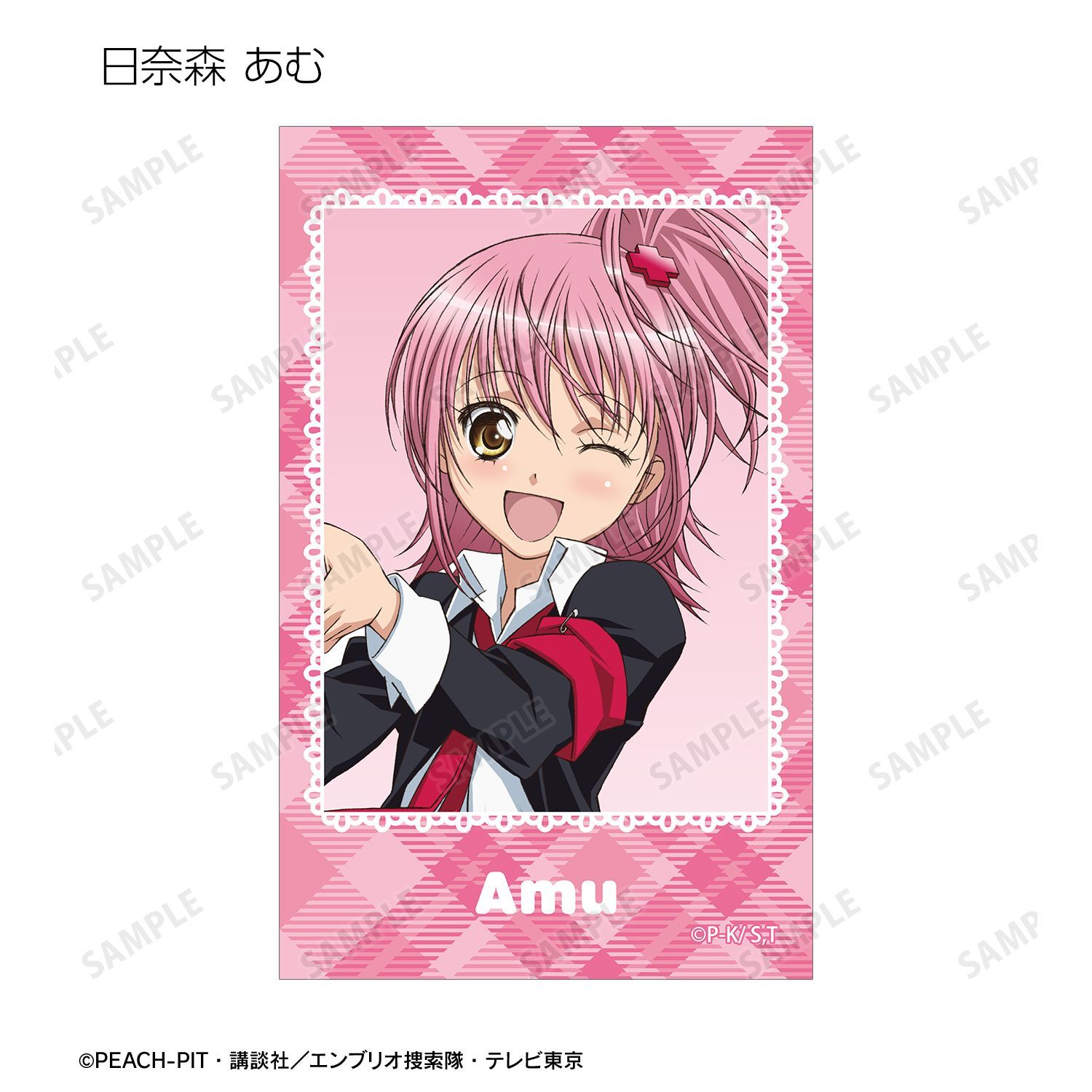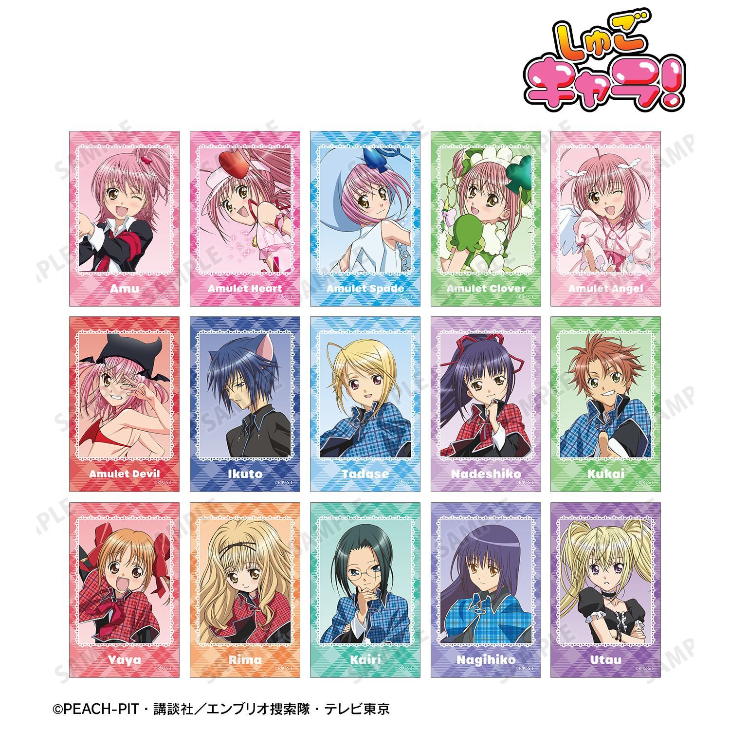 日奈森 あむ、アミュレットハート、アミュレットスペード、アミュレットクローバー、アミュレットエンジェル、アミュレットデビル、月詠 イクト、辺里 唯世、藤咲 なでしこ、相馬 空海、結木 やや、真城 りま、三条 海里、藤咲 なぎひこ、ほしな 歌唄のイラストをインスタントカメラ風のイラストカードに仕上げました。