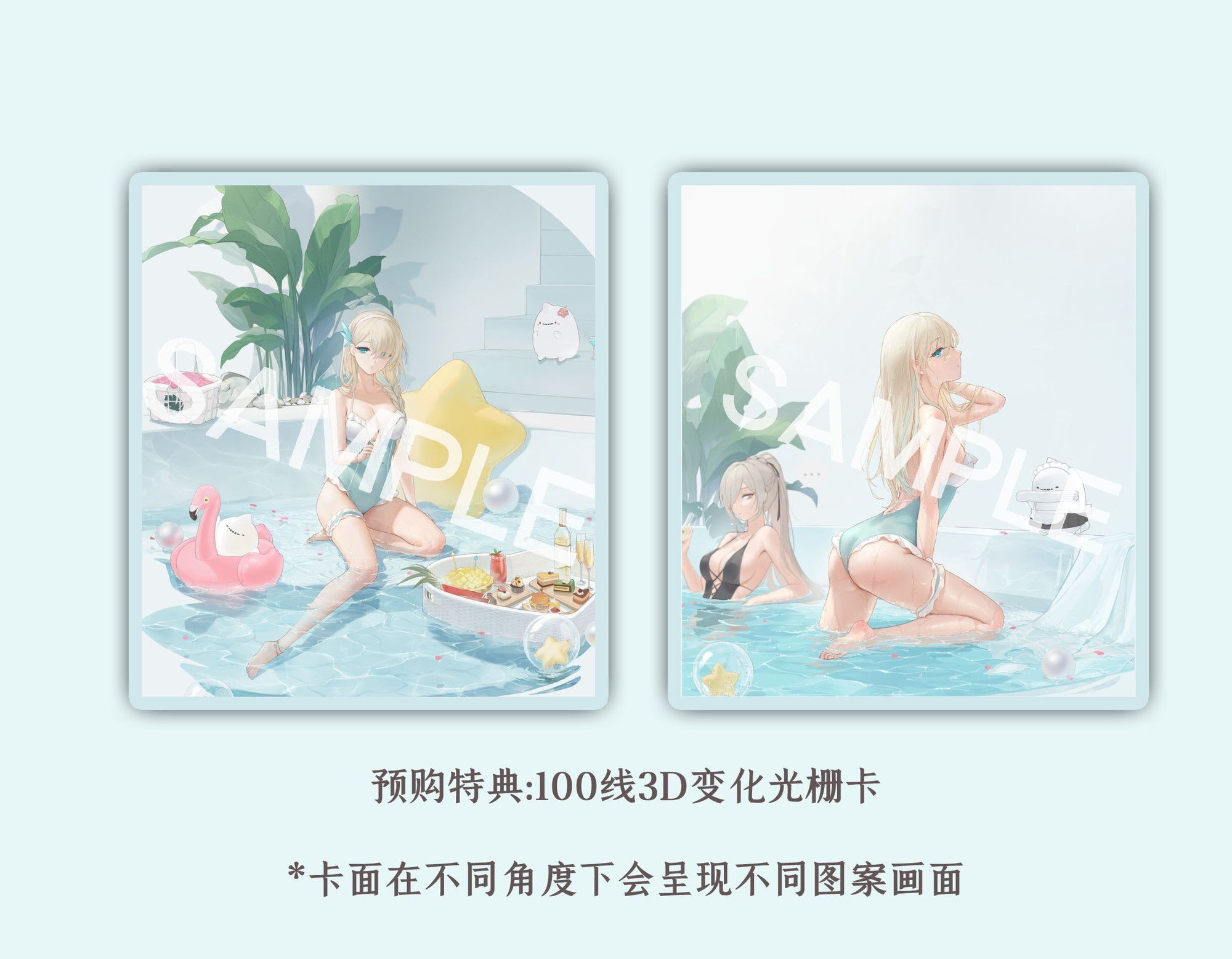 爽やかなミントブルーの水着姿と、澄みきったプールの水面が織りなす涼やかな情景は、まるで夏のひとときを切り取ったかのよう。
