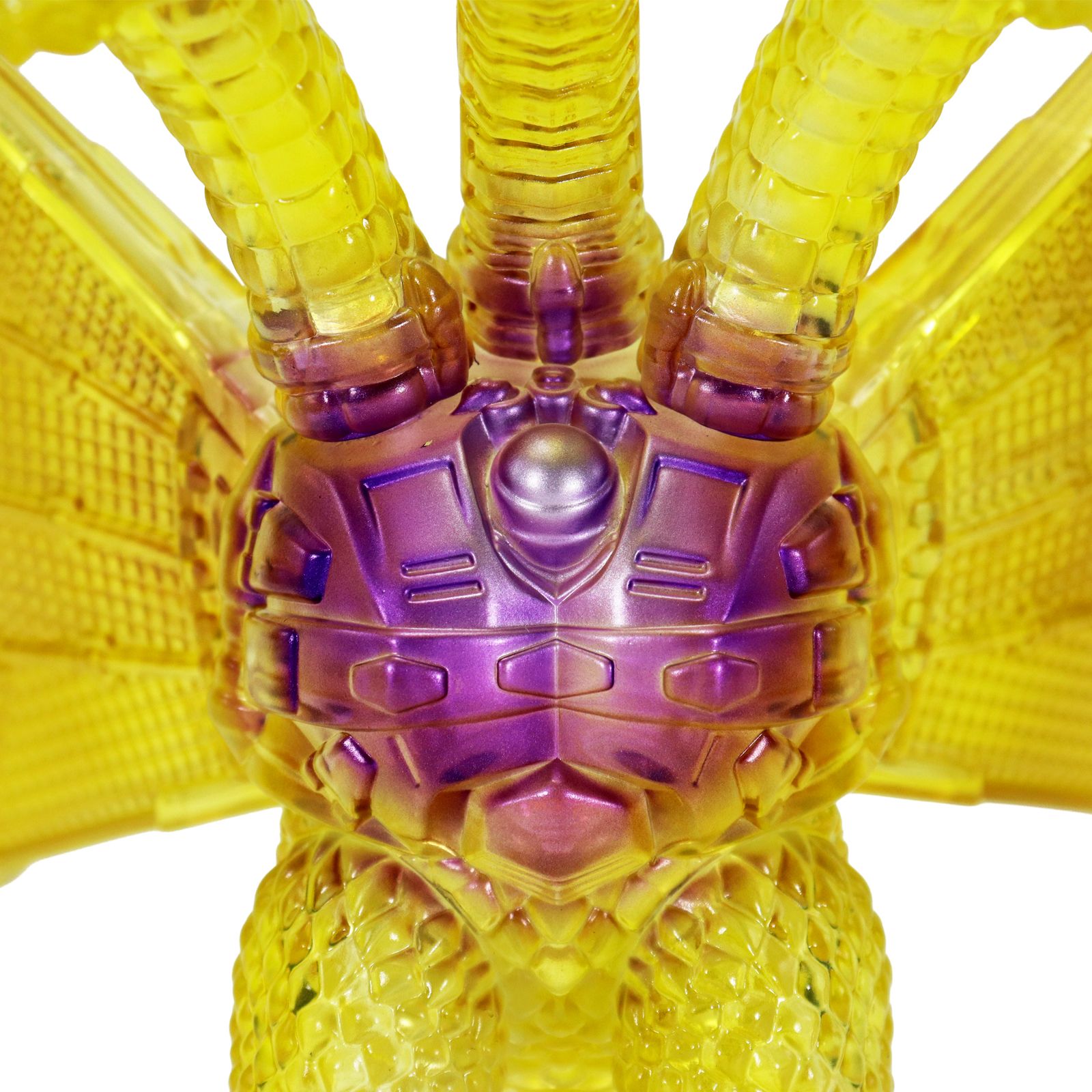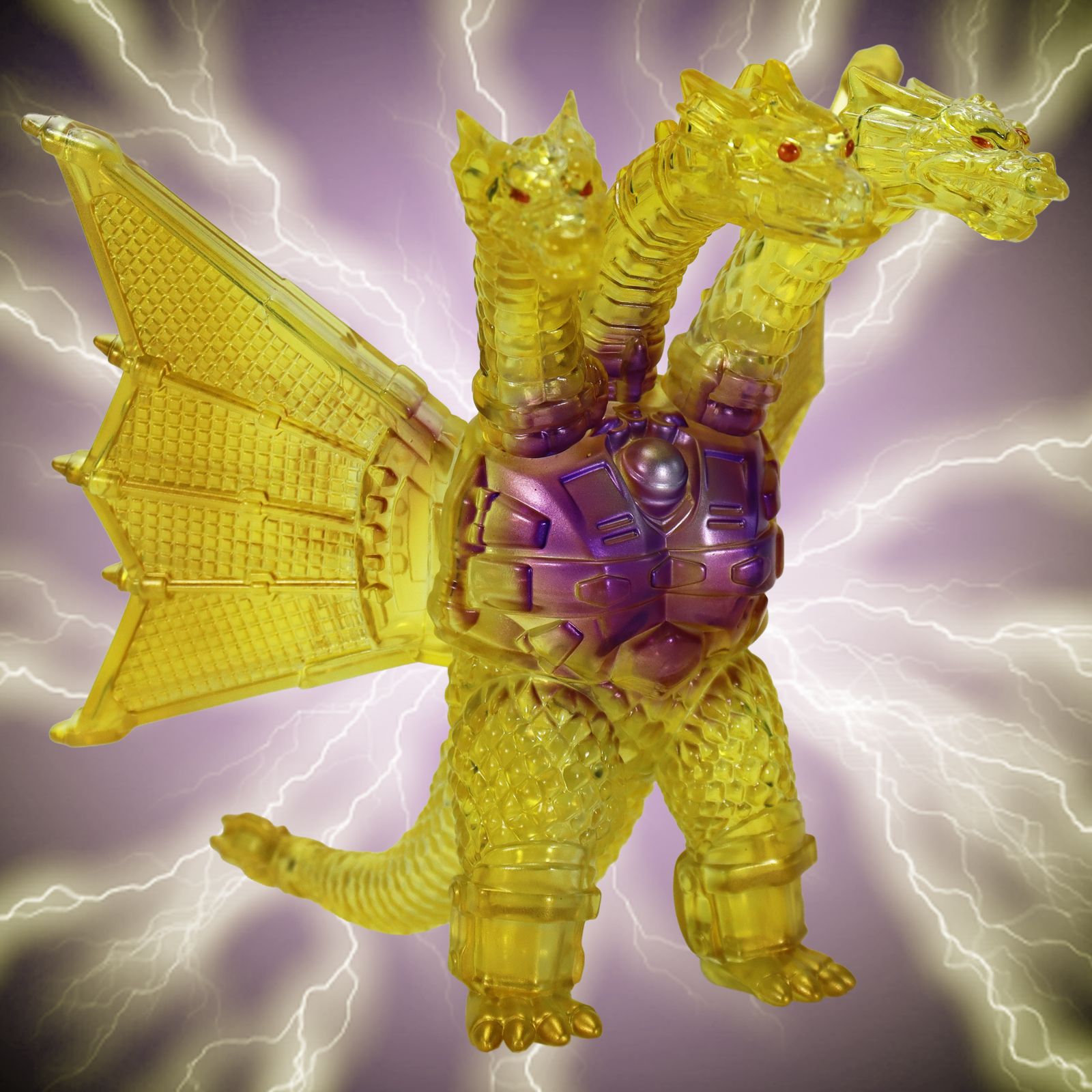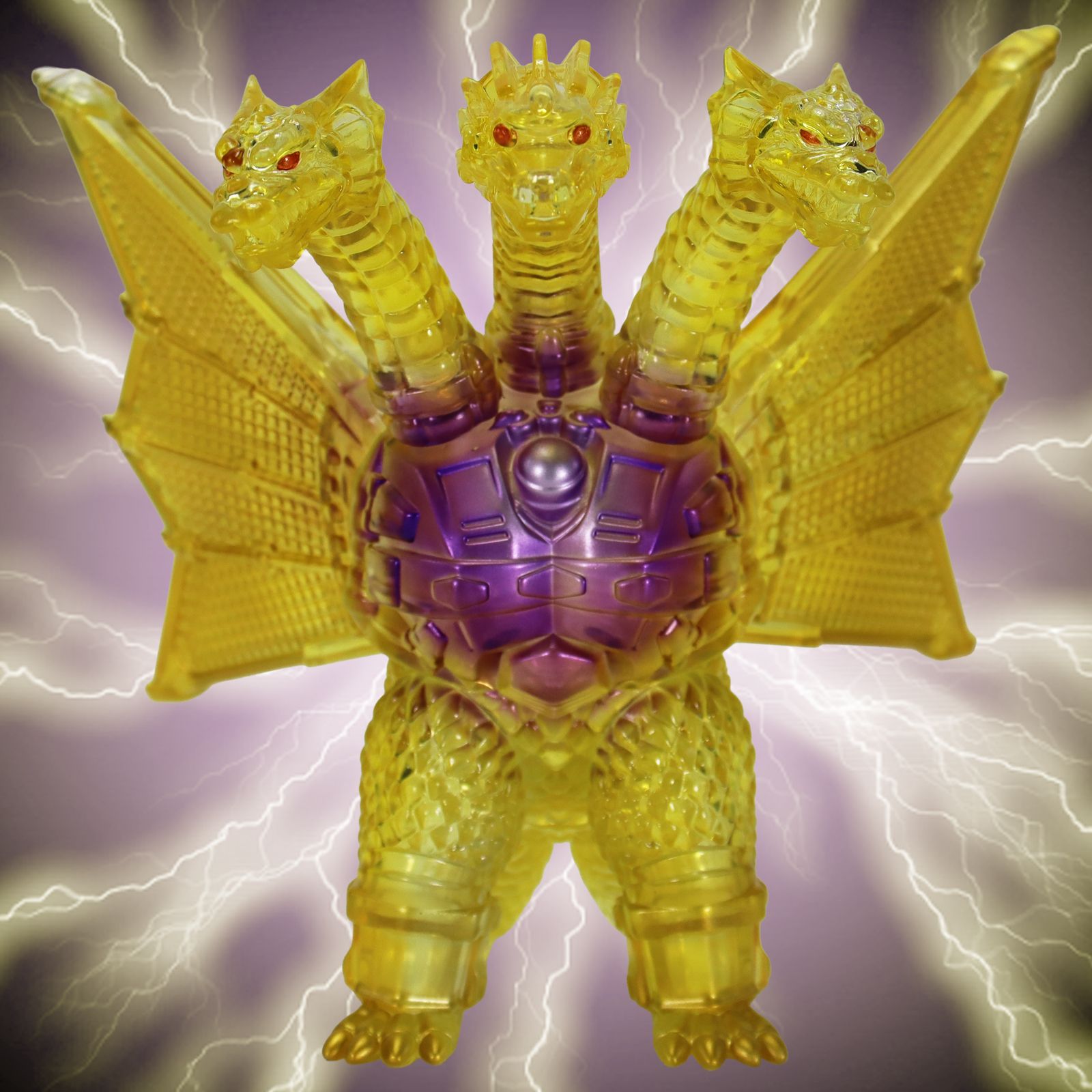 金色の輝きの中から姿を現すメカキングギドラを、クリアソフビにクリアイエロー・ゴールド、中央にはパープルのグラデーションを彩色して鮮やかに表現しています。