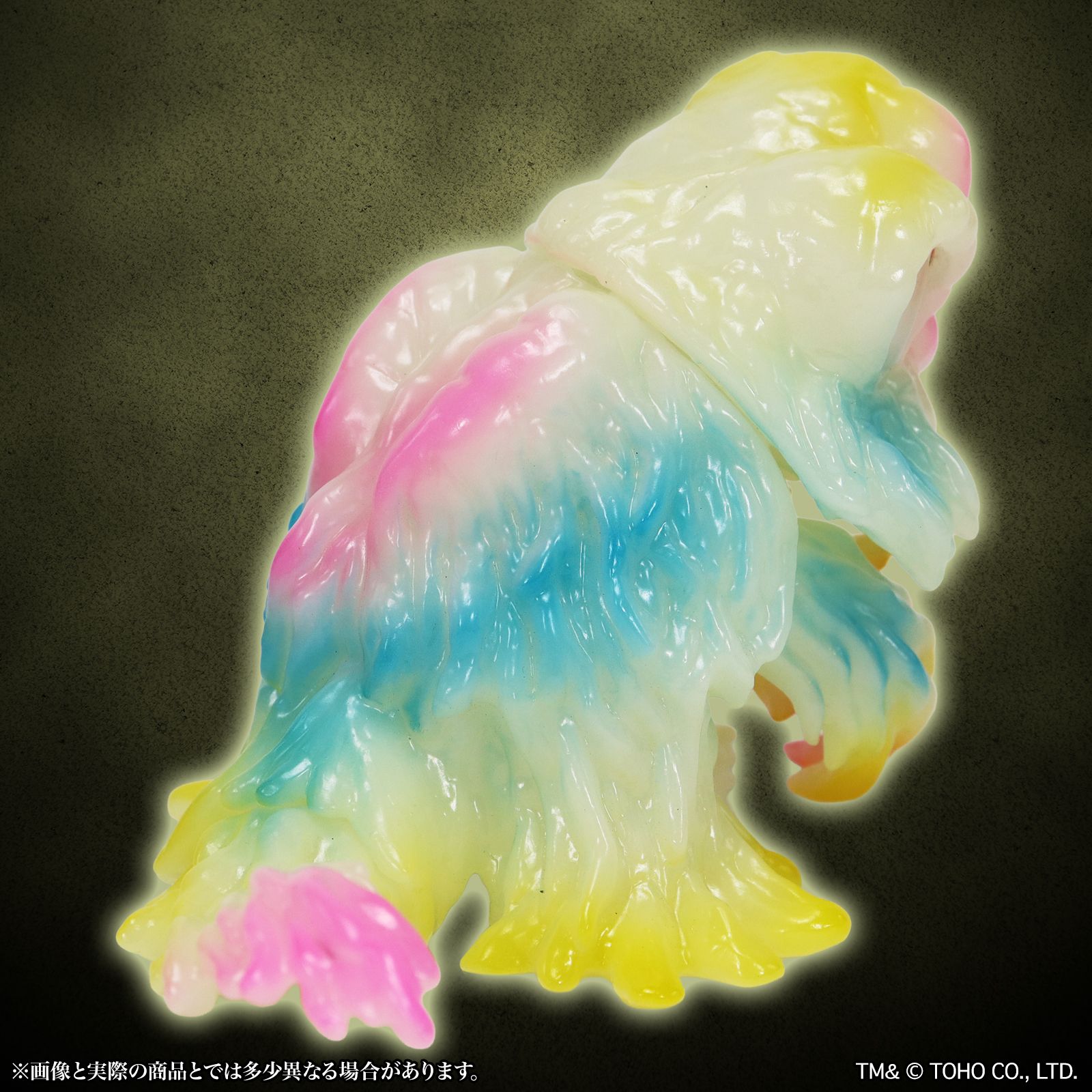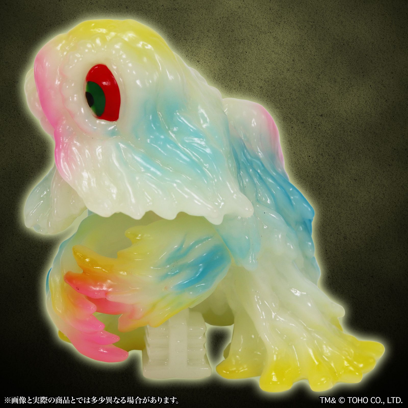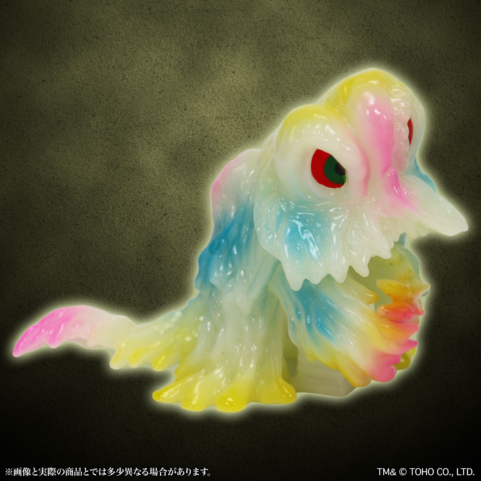 暗闇で光る蓄光素材のソフビに、通常のヘドラでも人気であった複数のクリアカラーによる鮮やかなレトロポップなカラーリングで彩色。