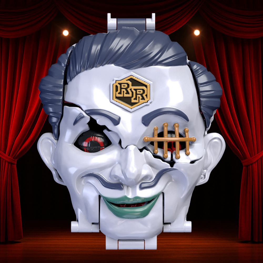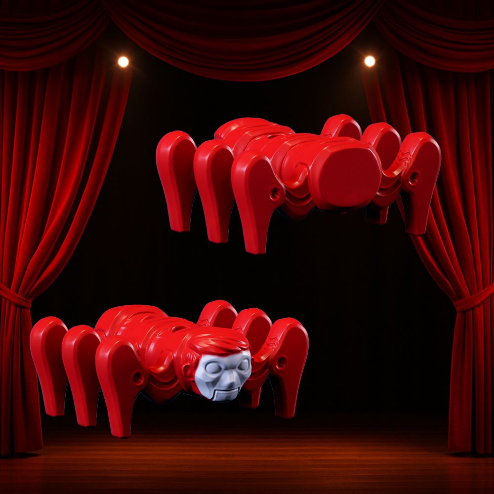 右目は甲虫のようなクリーチャー、左目は、過去を映す映写機に変容を遂げ、赤い幕、フロアライト、陰影の層が、劇場の不気味な演出を完成させ る。