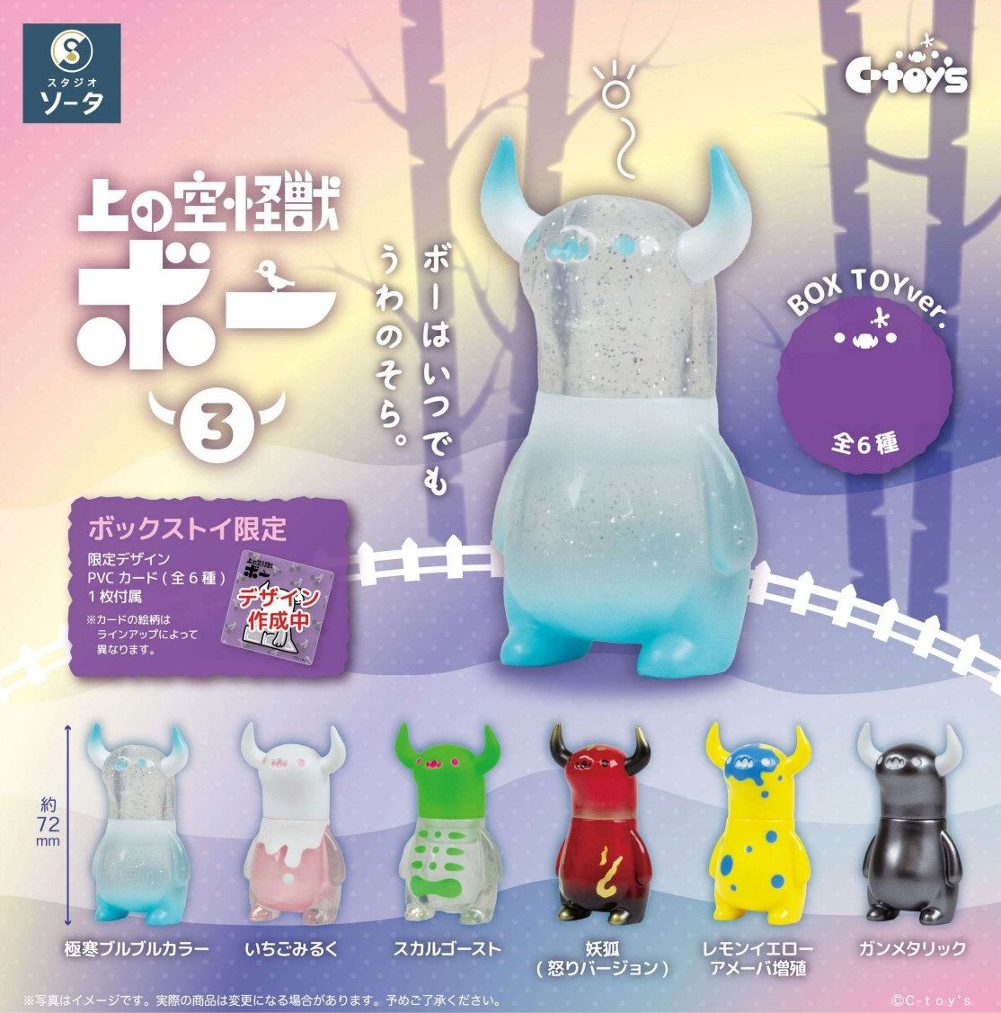ソフビで人気のデザインの極寒ブルブルカラー/いちごみるく/妖狐(怒りバージョン)と、本作にて新登場のデザイン、スカルゴースト/レモンイエローアメーバ増殖/ガンメタリックの全6種、ボックストイ限定カラーにて展開。