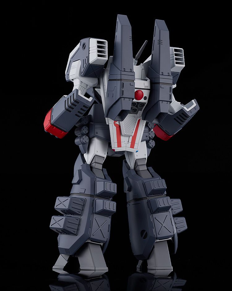 バトロイドバルキリーにウエポンコンテナや増槽など装着した状態を、変形やアーマード装備脱着機構をあえて廃することで設定画やアニメ登場時に見られる力強くまとまり感がある姿で立体化しました。