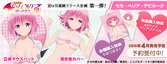 4月でシリーズ連載10周年を迎える「To LOVEる-とらぶる- ダークネス」から、描き下ろしによる立体マウスパッドと抱きまくらカバーが10ヶ月連続でリリース決定!